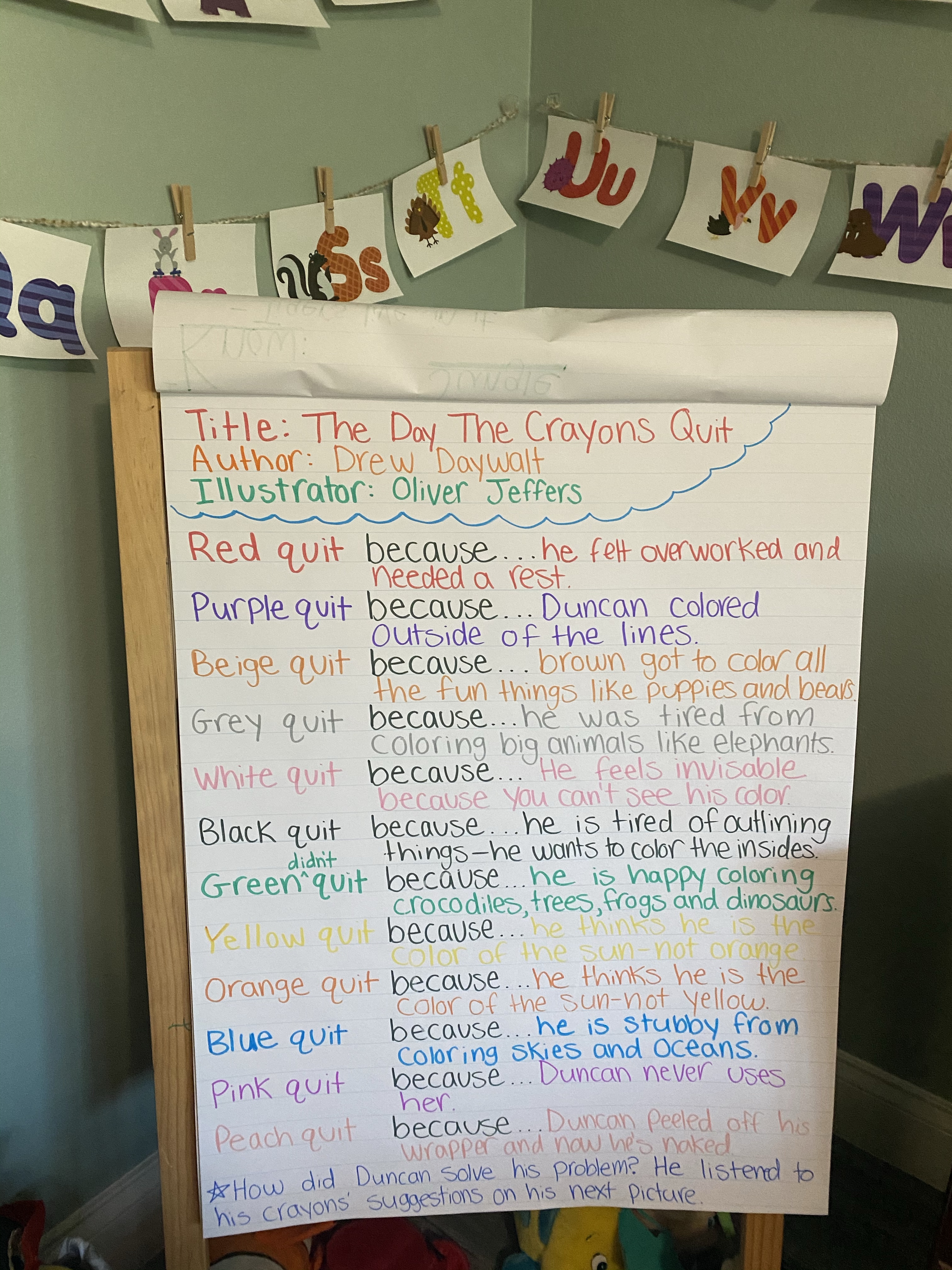-“The Day The Crayons Quit” cause and effect: I introduced my little to cause and effect for the first time, telling him that an effect is just something that happens and the cause is why it happened. I gave him a few real life examples (ie. I tripped because I didn’t tie my shoes- tripping was the effect, the cause was not tying my shoes). Then we read “The Day The Crayons Quit” and after each page we talked about why that color quit (ie. what was the cause of them quitting) and wrote it on a graphic organizer (I prepped it by writing “Red quit because…” for each color in the same order the story went). This was a perfect intro book for this comprehension skill!