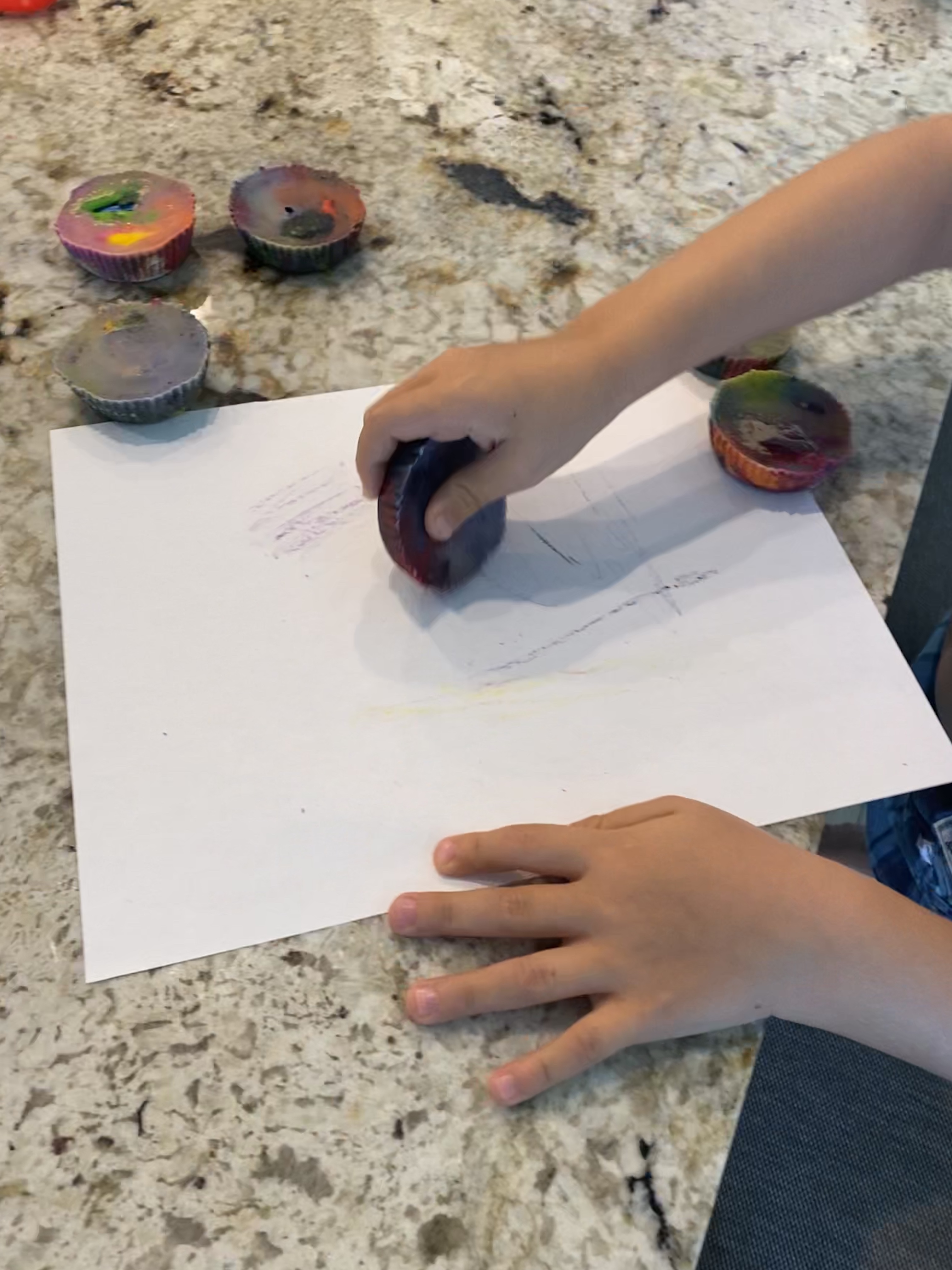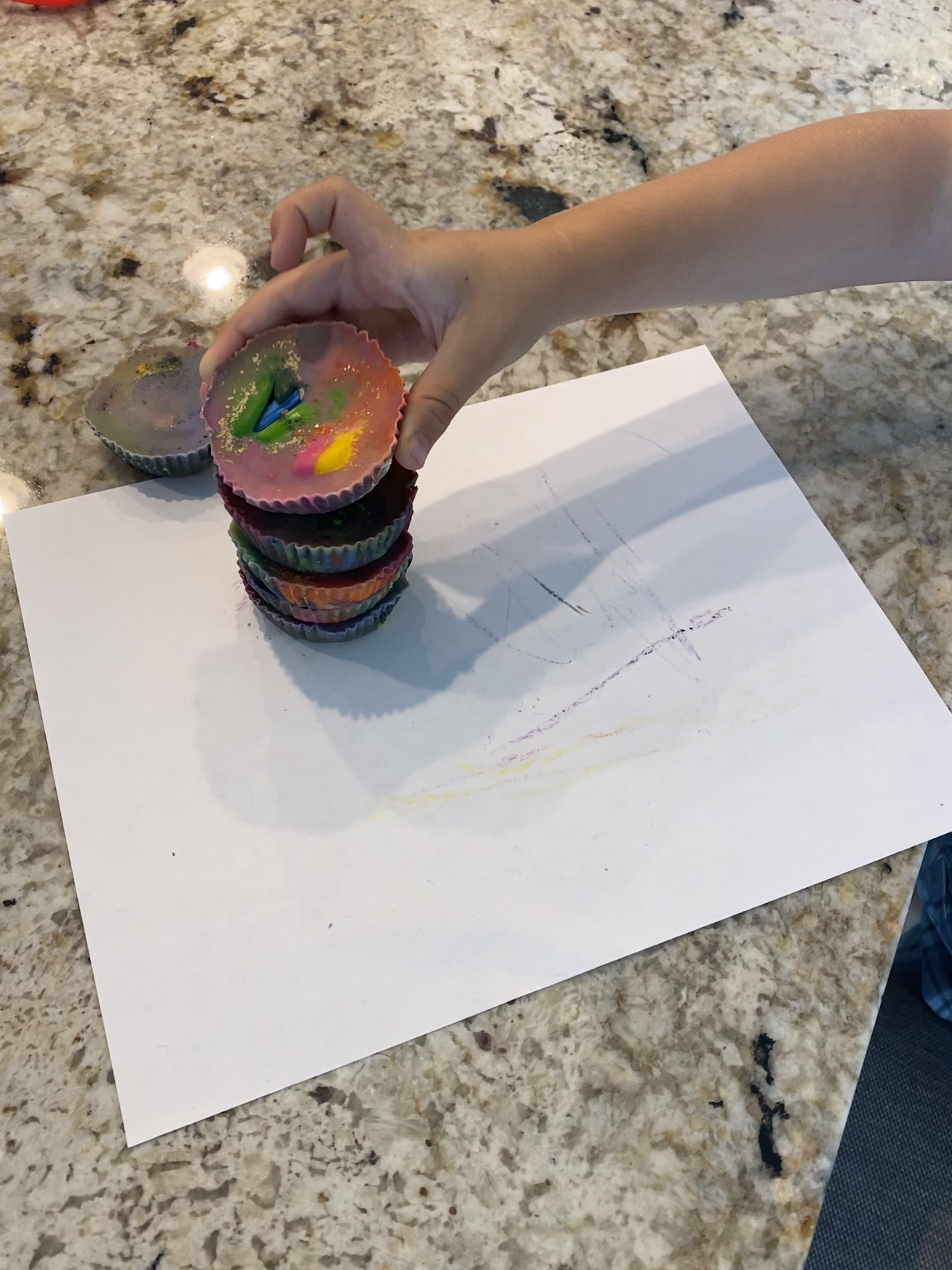 -Recycled crayons: I used to do this as part of our economics unit when I taught elementary school- we would make recycled crayons (a want), sell them to our school community to earn money, then donate the money to water aid- a nonprofit corporation that provides wells (a need) to people in developing nations. This week we just made them for fun! We peeled a bunch of old crayons, then I had my little break them and place the pieces in tinfoil muffin wrappers. We baked them in the oven at 250 for about 15 minutes until the crayons completely melted- another great opportunity to discuss what “melting” is. Then we let them cool, took the wrappers off, and colored with our new “tie dye” crayons (the boys also enjoyed stacking them up)!