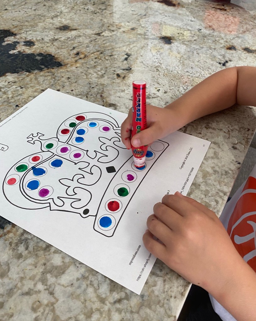 -Polk-a-dot patterns: I printed this do-a-dot page out and I had my little decorate the crown with patterns. We reviewed what a repeating pattern is before we began, and I had him tell me what a pattern was in his own words when we finished.