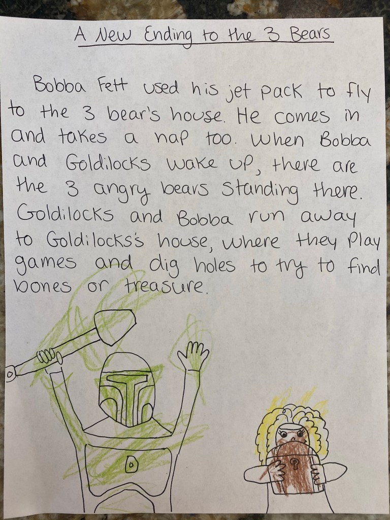 -Rewrite the ending activity: Have you ever read a “twisted fairy tale” where the author takes a traditional story and rewrites it a bit? (“The Princess and the Pizza” and “Goldilocks has Chickenpox” are two that come to mind! Come to think of it, I should’ve borrowed those from the library this week!) This week I did something similar with my little by reading him most of “Goldilocks and the Three Bears” (up to the point where she falls asleep) then having him reimagine the end to the story. Right now he’s a little Star Wars obsessed, so of course Bobba Fett shows up…hahaha TIP: Your little may just ramble off a great, detailed creative story, or they may need some prompting- depending on the day, my little has done both with his story telling. You can encourage more details by asking them questions (ie. What happened after that? What were they playing? Where did they go next?)