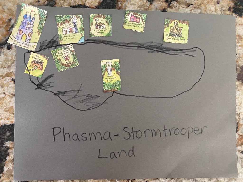 -Make a map of a fairytale kingdom: We reviewed what maps are and what they help us do, then I gave my little fairytale pictures that I printed and cut out from this map and had him glue them on a sheet of paper to make his own fairytale map. He added roads to link the locations, and named his kingdom too!