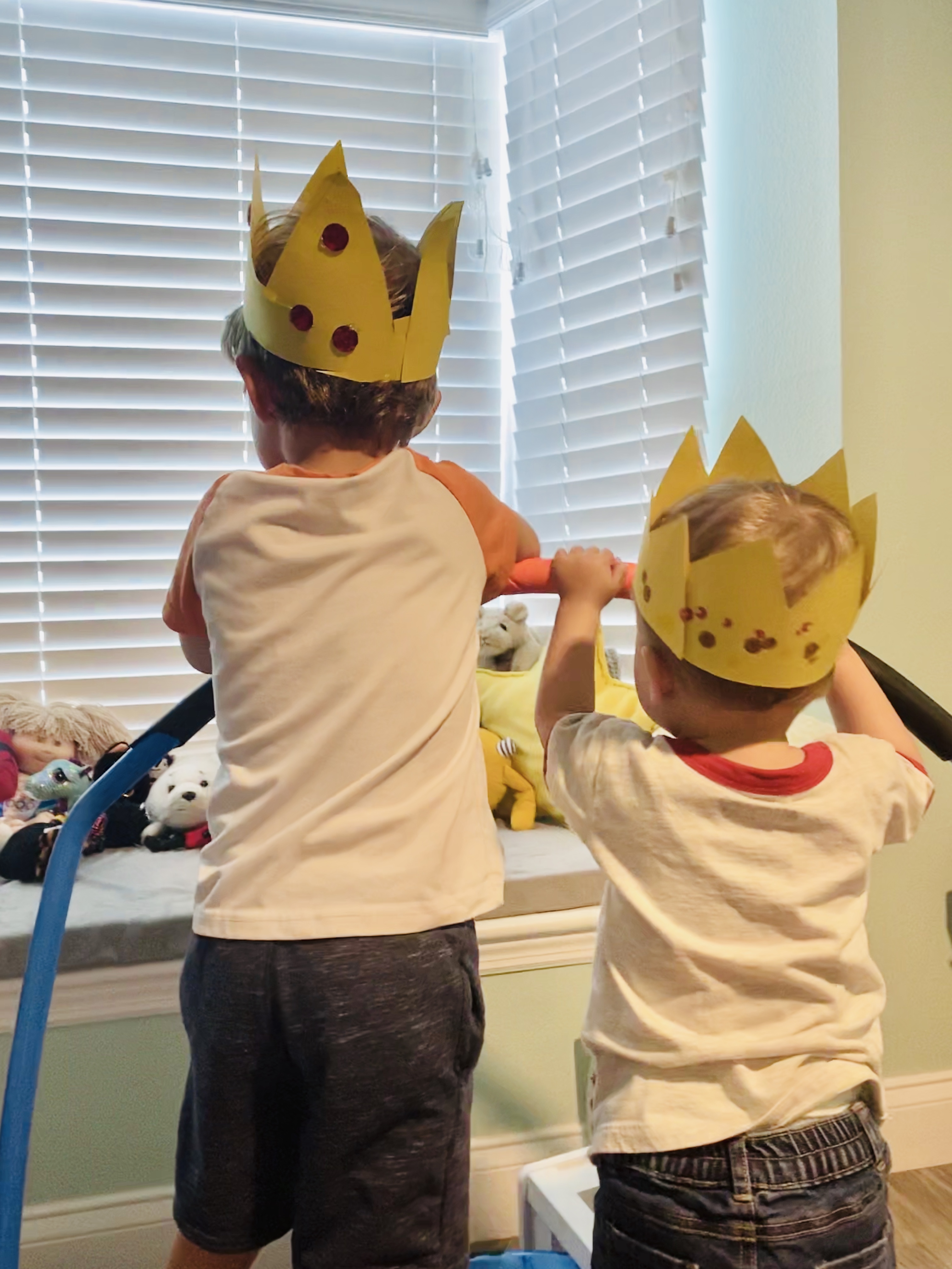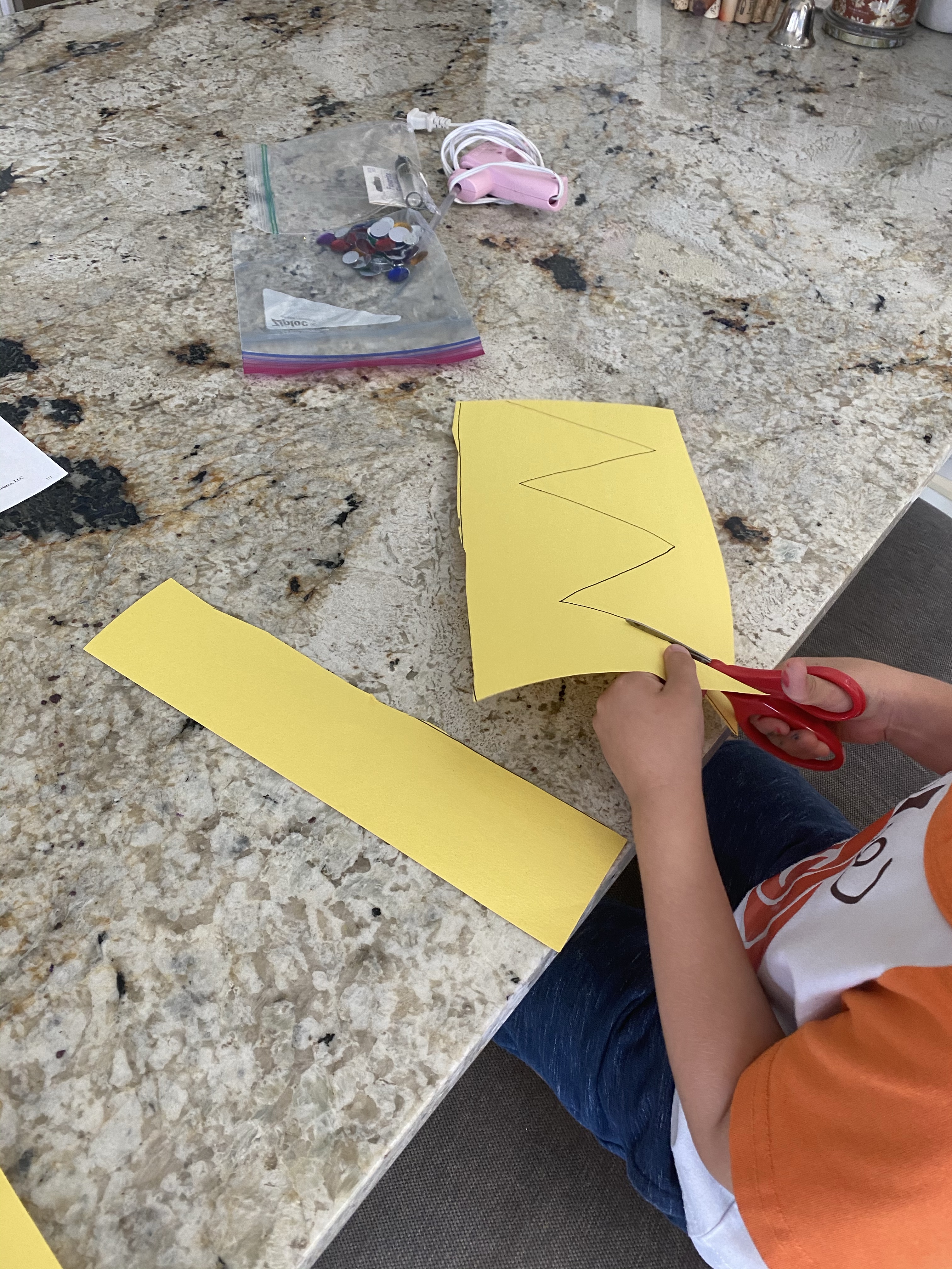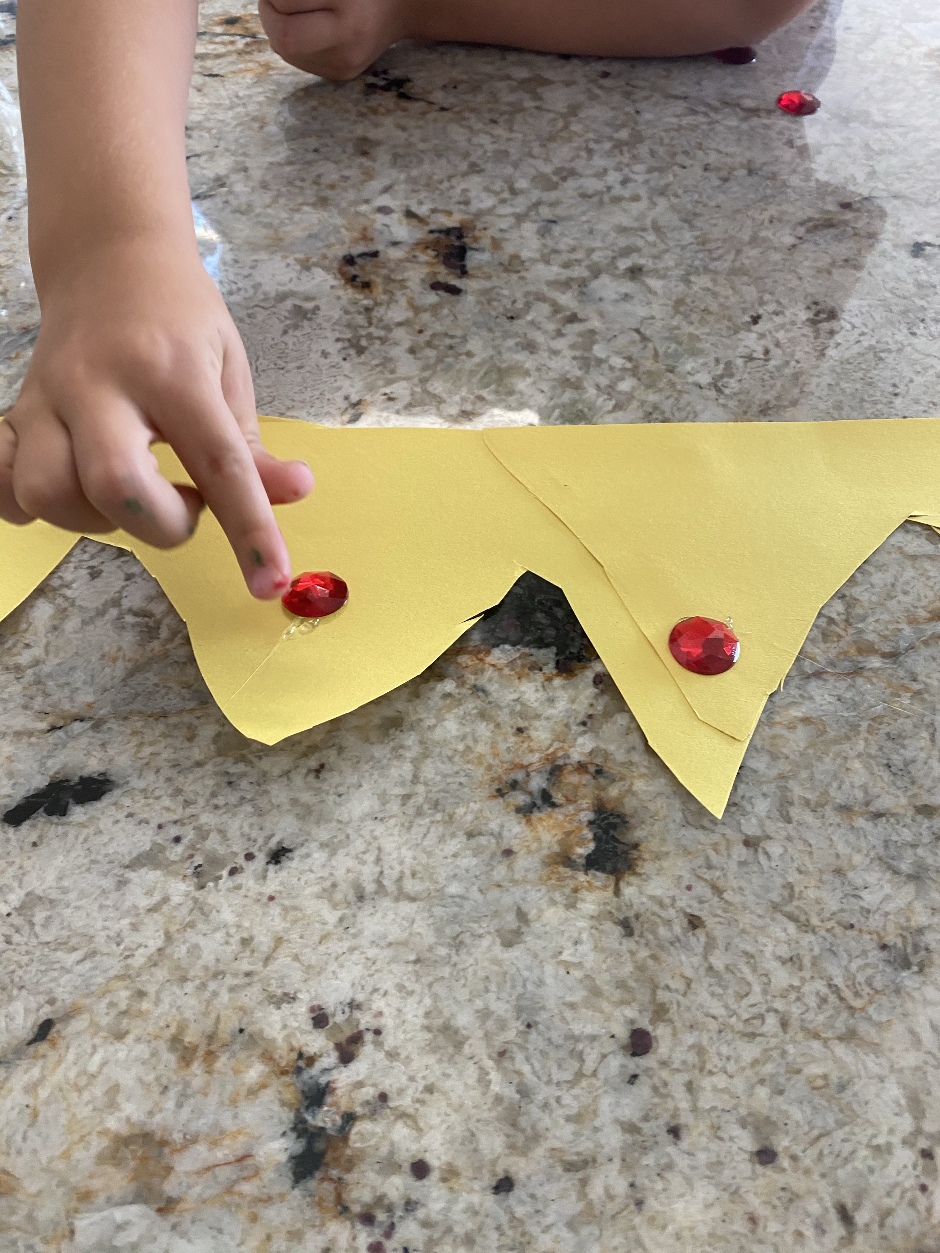 -Crown making: I drew a zig zag on a piece of yellow paper and had my little cut it out (meaningful scissor practice is the best kind!). Then I glued the two zig zags together- points facing up- and helped him hot glue gems on the crown (he chose the gems and pointed where he wanted them, I put the hot glue down, and he stuck the gem on top- you could also use regular wet glue but hot glue sticks SO much better and dries instantly). Then I glued the crown in a circle to fit his head and voila! Your Majesty!