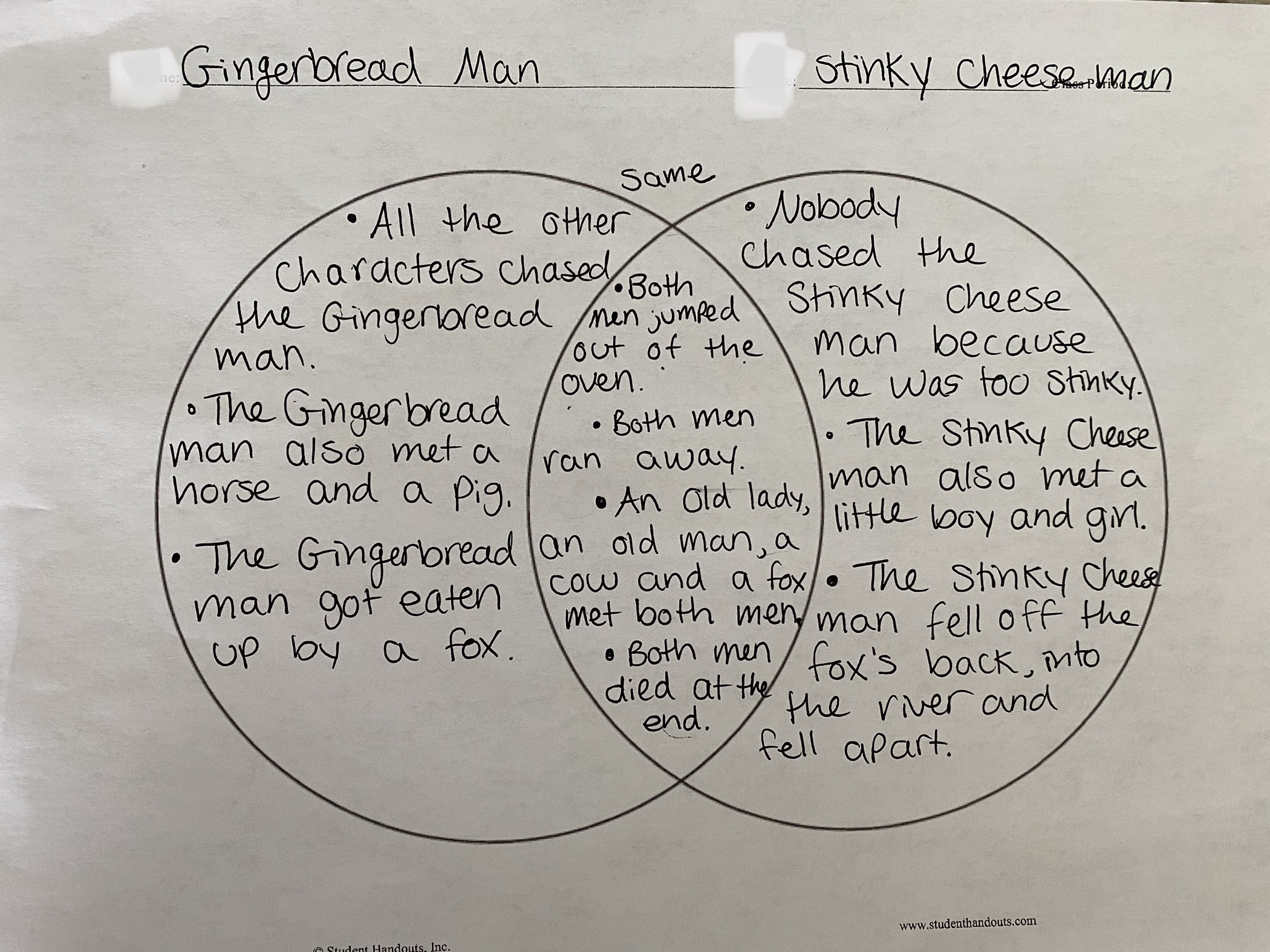 –Venn Diagram compare and contrast: We read “The Gingerbread Man” and “The Stinky Cheese Man” (from the book “The Stinky Cheese Man and Other Fairly Stupid Tales”…not my favorite title, but it has some silly twisted fairy tales in it that are great for a compare and contrast activity!) then we used a Venn Diagram to write down how the two stories were the same (comparing) and how they were different (contrasting). Before we began reading, I told my little to think about how the two stories were the same, and how they were different as we read so he would be ready to discuss them when we finished.