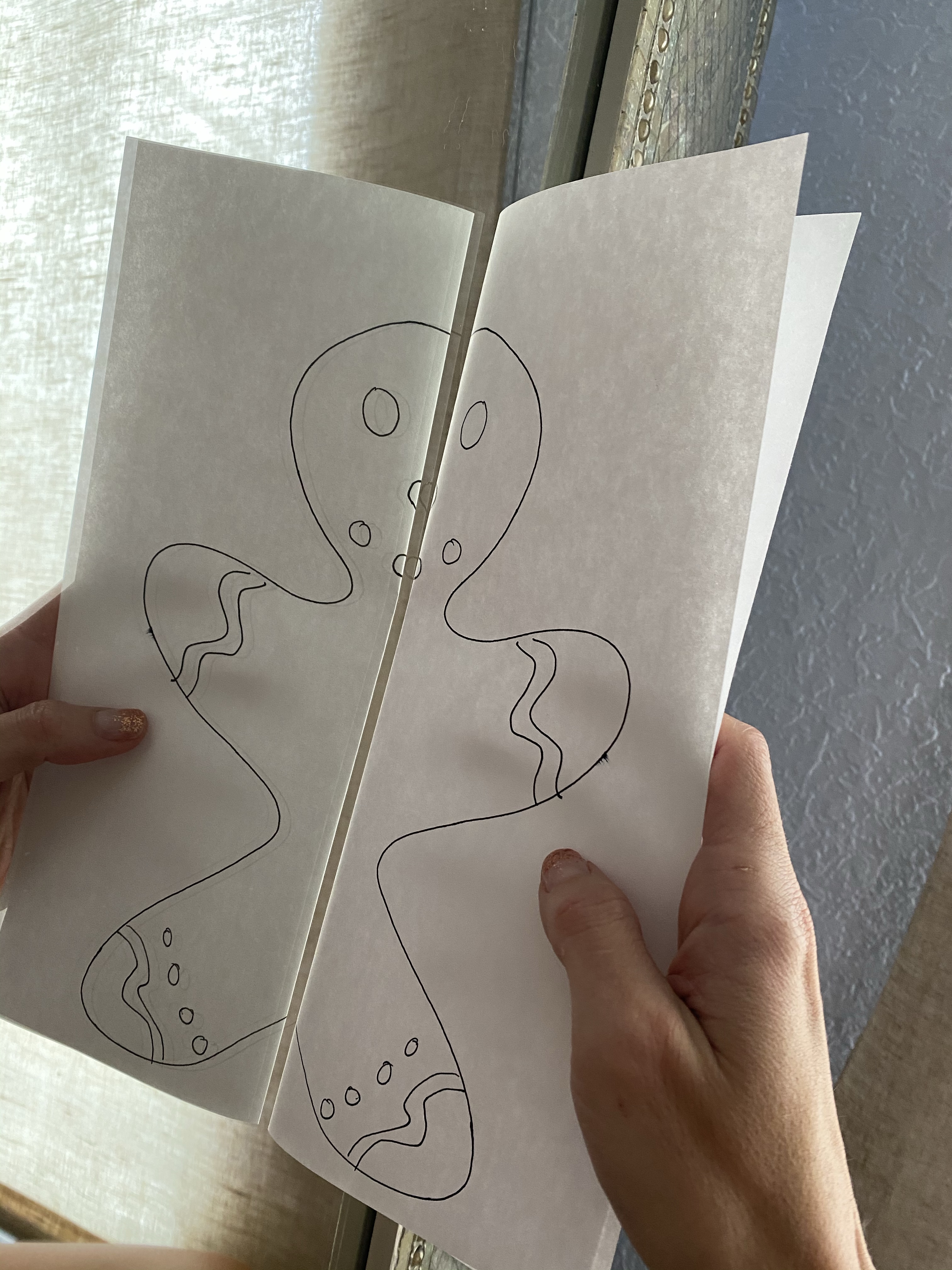 -Magic mirror symmetry activity: I drew half of a gingerbread man, folded the paper in half, then asked my little if he wanted to see a trick in my magic mirror. Of course he said “Yes!” so I went to our bedroom and said “Mirror, mirror, on the wall, show me a gingerbread man, show him ALL!” then I held the paper up to the mirror with the fold touching it so that between the mirror and my drawing it appeared he was a full gingerbread man (my little’s face was priceless when I did this! hahaha) Then we discussed symmetry- or when something is exactly the same on both sides- and how the mirror makes a symmetrical gingerbread man because it’s reflecting the exact same side I drew so they look identical. Then I had my little try to draw the other half of the gingerbread man (I helped him by drawing the body, he added the decorations) so that both sides looked the same. I got this idea from PBS parents– a great free resource for preschool learning ideas!