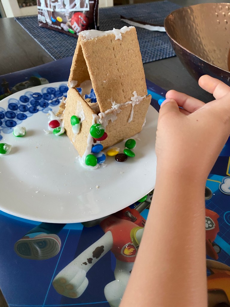-Decorate a gingerbread house: First, I built a “gingerbread house” using graham crackers and frosting. To make the frosting I used about 1 1/2 cups confectioner’s sugar and 1 TBSP of milk- you want the frosting to be thick and sticky, not runny! TIP: let the house sit and dry for about an hour so the walls are sturdy and won’t fall down while your little decorates (I didn’t do this and our house tipped over like 5 times! Lesson learned!) Then let your little decorate the house by dipping candy (we used M&Ms) in the frosting and sticking it to the house. When they’re finished, they can eat it for a fun snack!