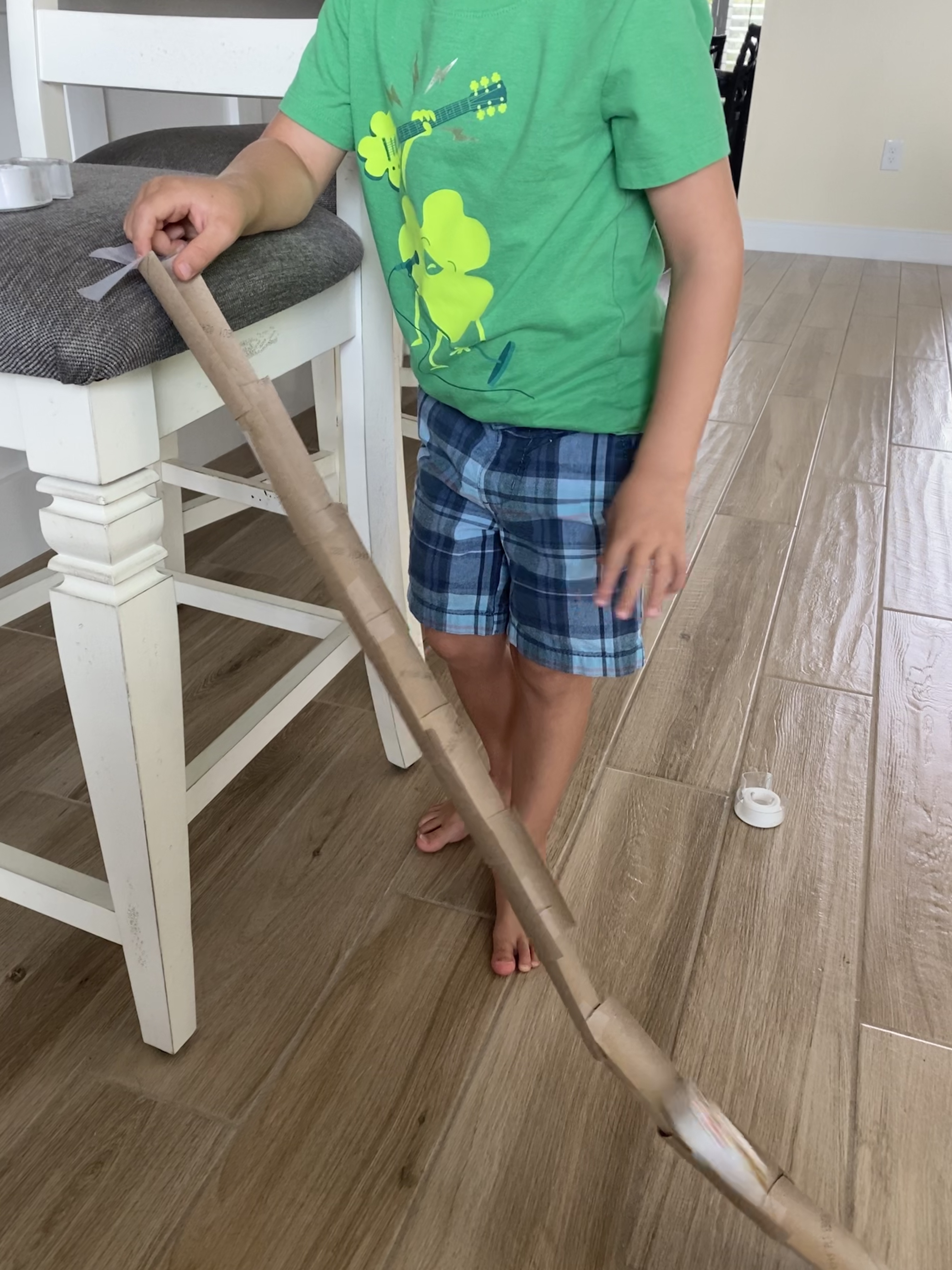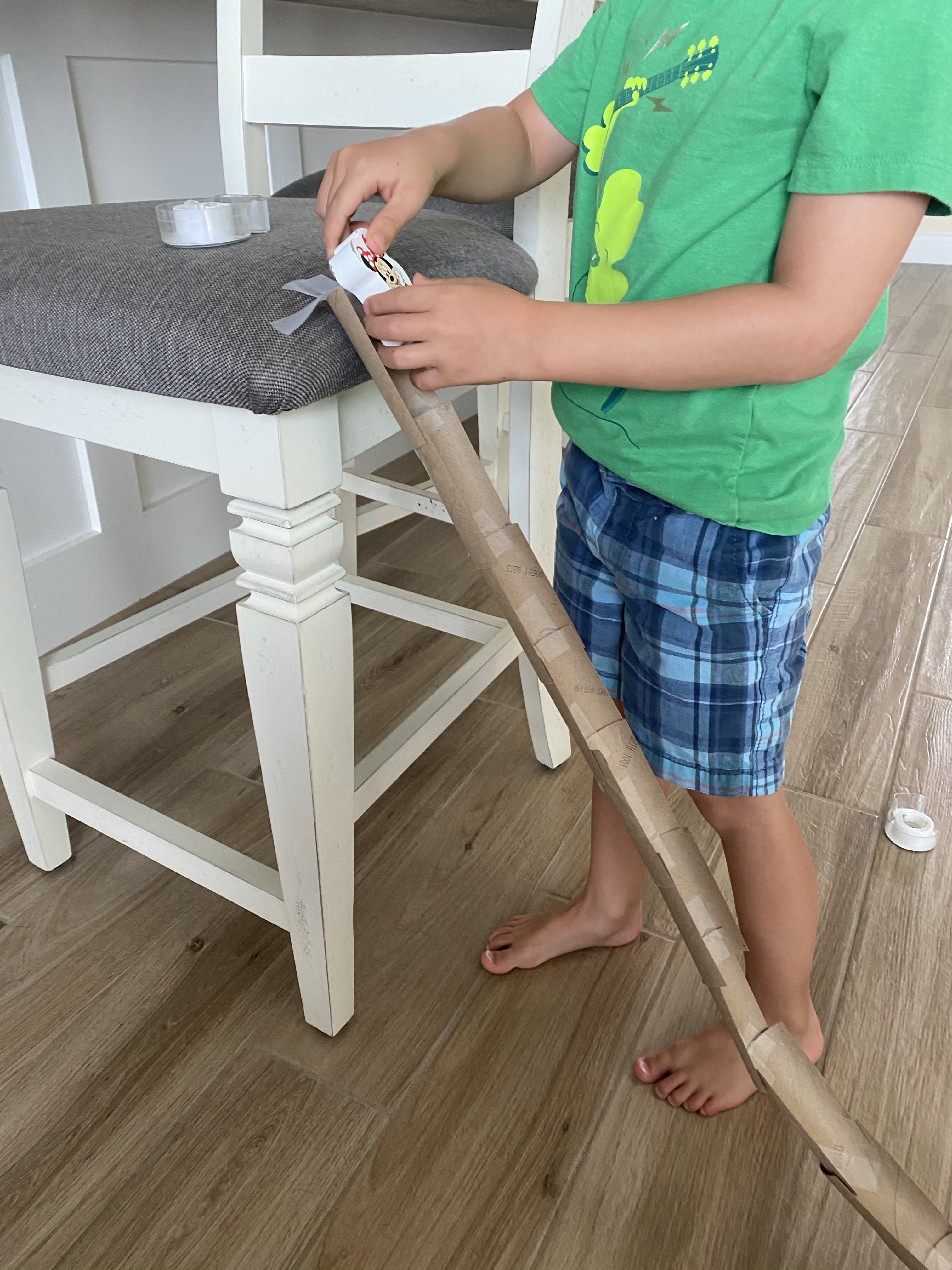 -STEM Rapunzel slide: We read the story “Rapunzel”, then I told my little Rapunzel was tired of being trapped in her tower, so we were going to build her a slide to escape! I gave him some toilet paper tubes that were cut in half length wise and some tape, and we worked together to make a slide (he tore off pieces of tape, I held the tube halves, and we took turns taping them together.) Then we secured our slide to the top of our “tower” (a bar stool) and he tested it out by sending Rapunzel (a Minnie Mouse toy- but a small princess doll would be even better!) down the slide! I got this idea from Math Geek Mama!