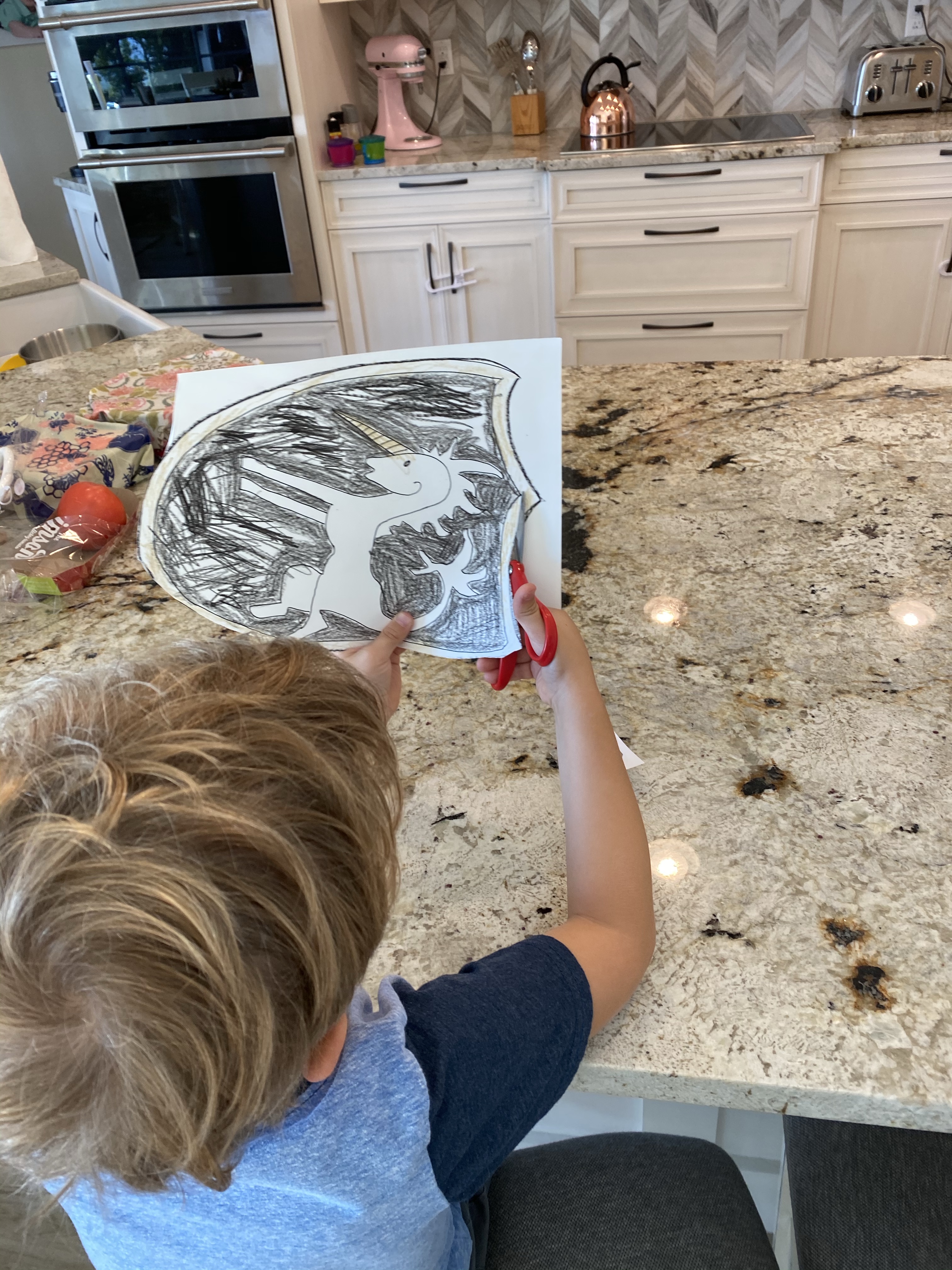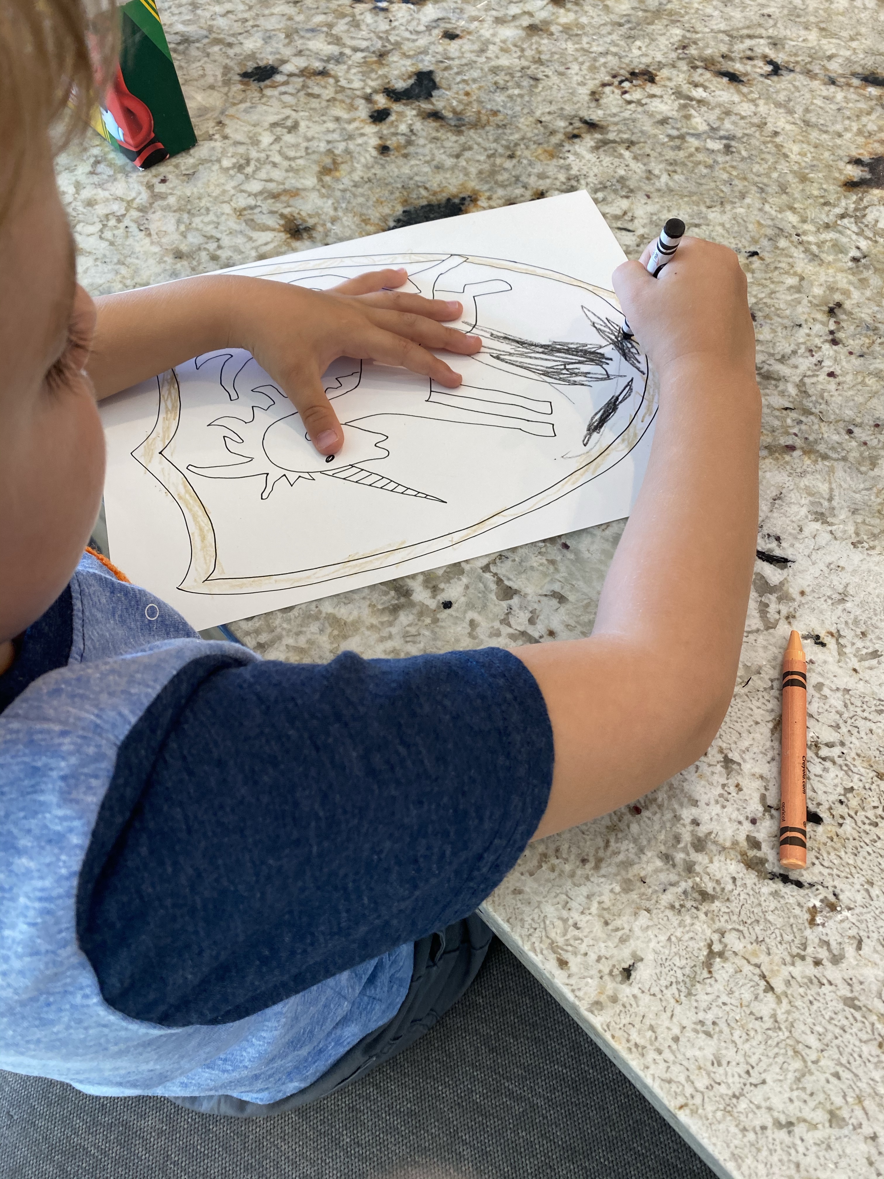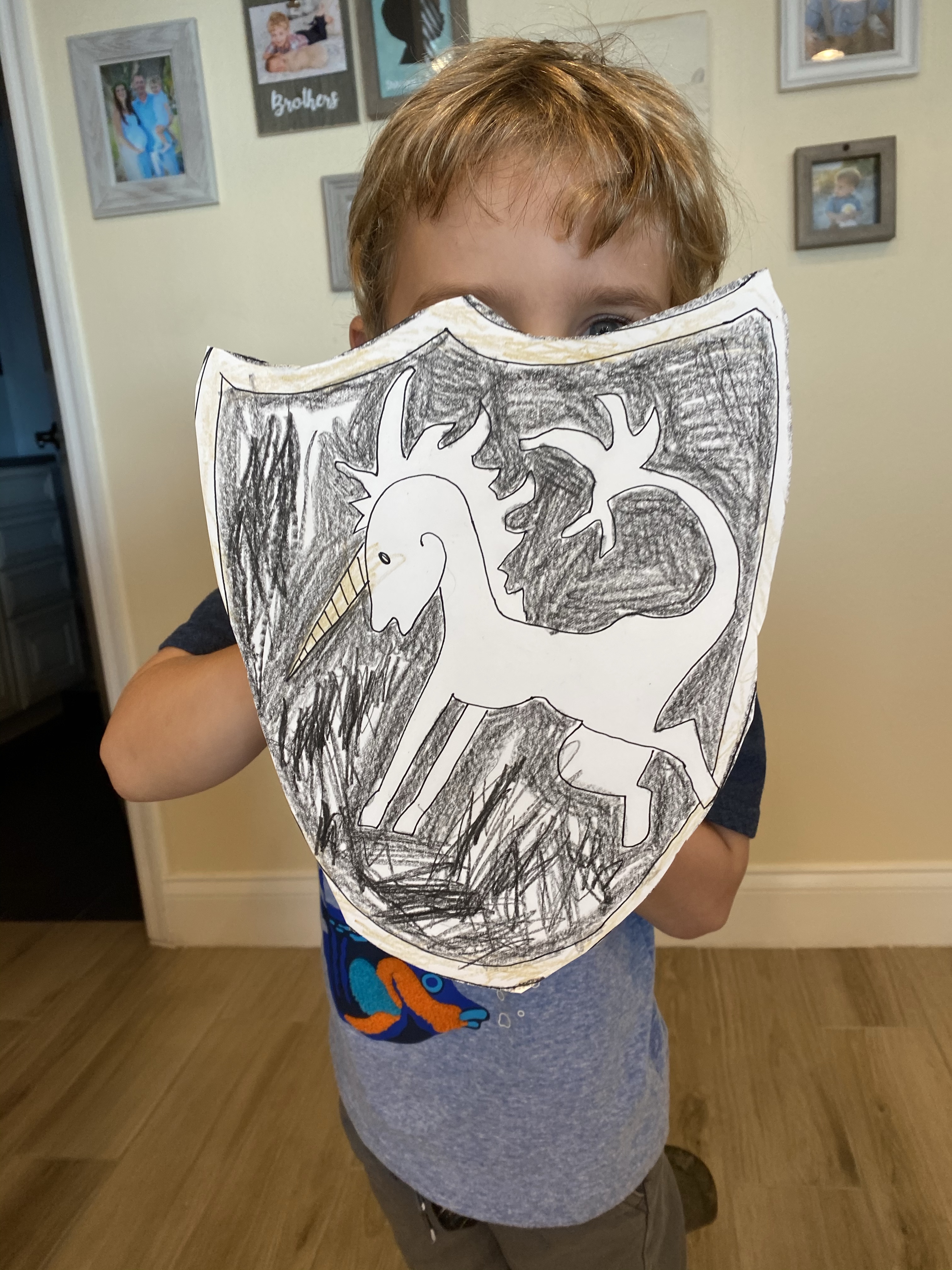 -Shield crest design: We discussed how knights often had a special picture or “crest” that they would use to decorate their shields and flags that represented their family. My original intent was to have my little design his own crest, but after looking through examples on google, he ended up picking one and asking me to draw it for him, so I obliged! I drew it on cardstock, then he colored it (he asked for help around the unicorn), and cut it out. Then I hot glued a tin foil handle on the back so he could play with it!