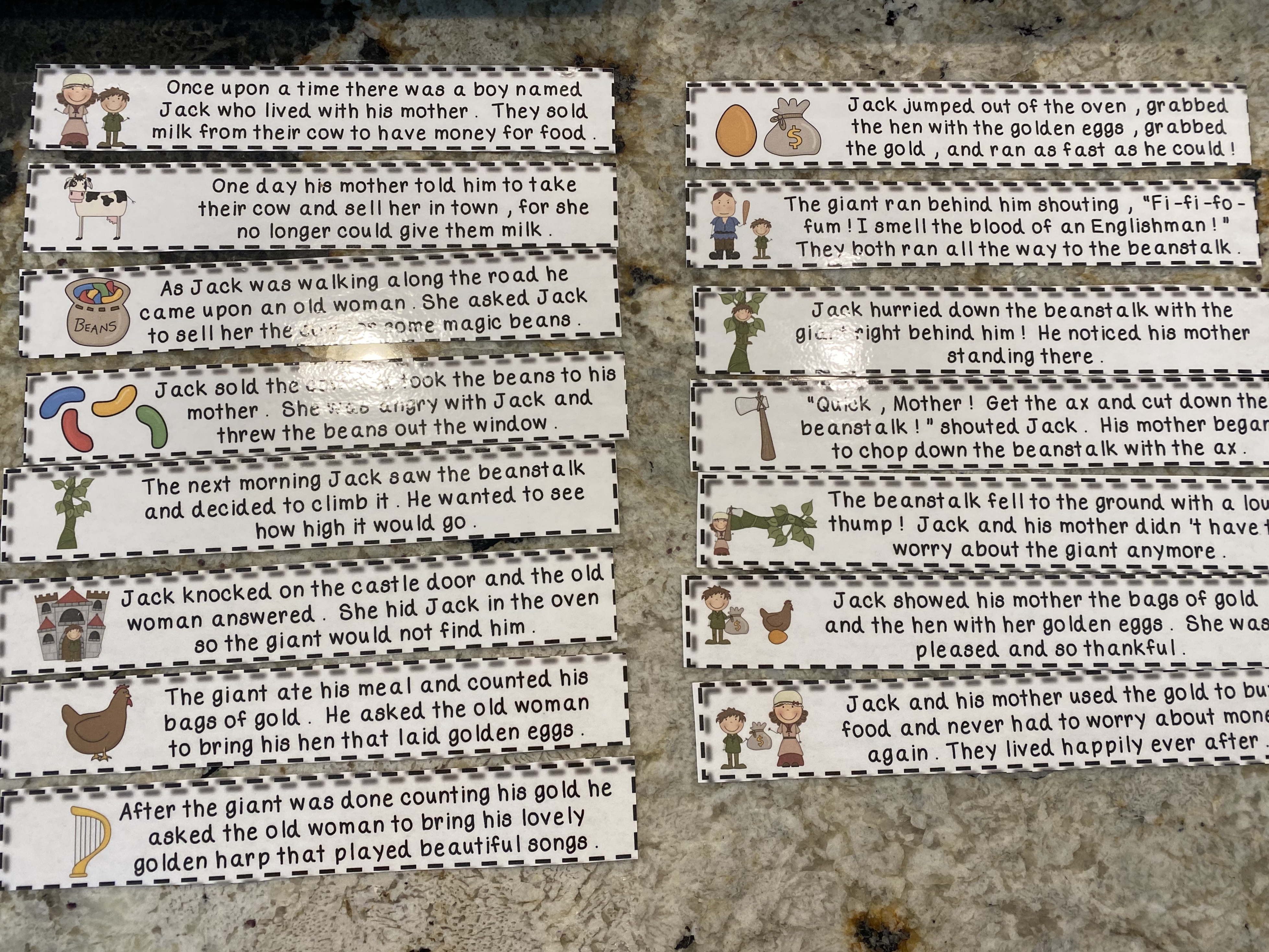-Jack and the Beanstalk retelling: We read “Jack and the Beanstalk” then my little retold the story by putting story cards in the correct order. I got them on Teachers Pay Teachers, and just removed the cards that didn’t fit with our version of the story, then I broke them into groups of 5 (beginning, middle, end) so it wouldn’t be as overwhelming for him to order them. We worked together to sequence the story cards- I read them, and he decided what order they went in (with my help when applicable).