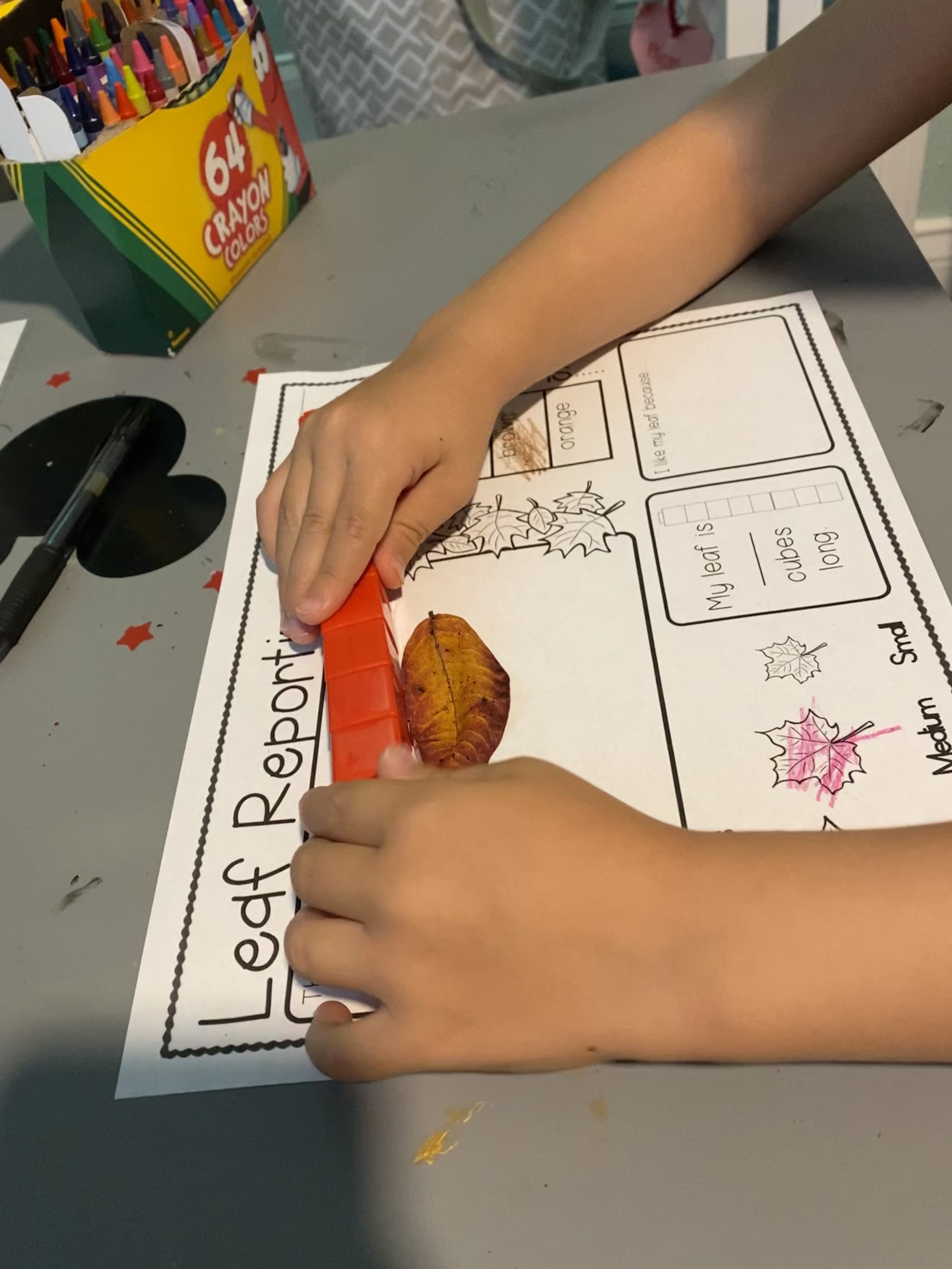 -Fall leave sort and measure: I cut out some different sized leaves from cardstock using Anyway, after I cut out the leaves, I had my little sort them from largest to smallest. Then he used unifix cubes to measure the leaves by putting the cubes at the end of the leaf, and counting how many cubes it took to get to the other end. You could also use a ruler if you don’t have cubes! I got this idea from Turner Tots!
