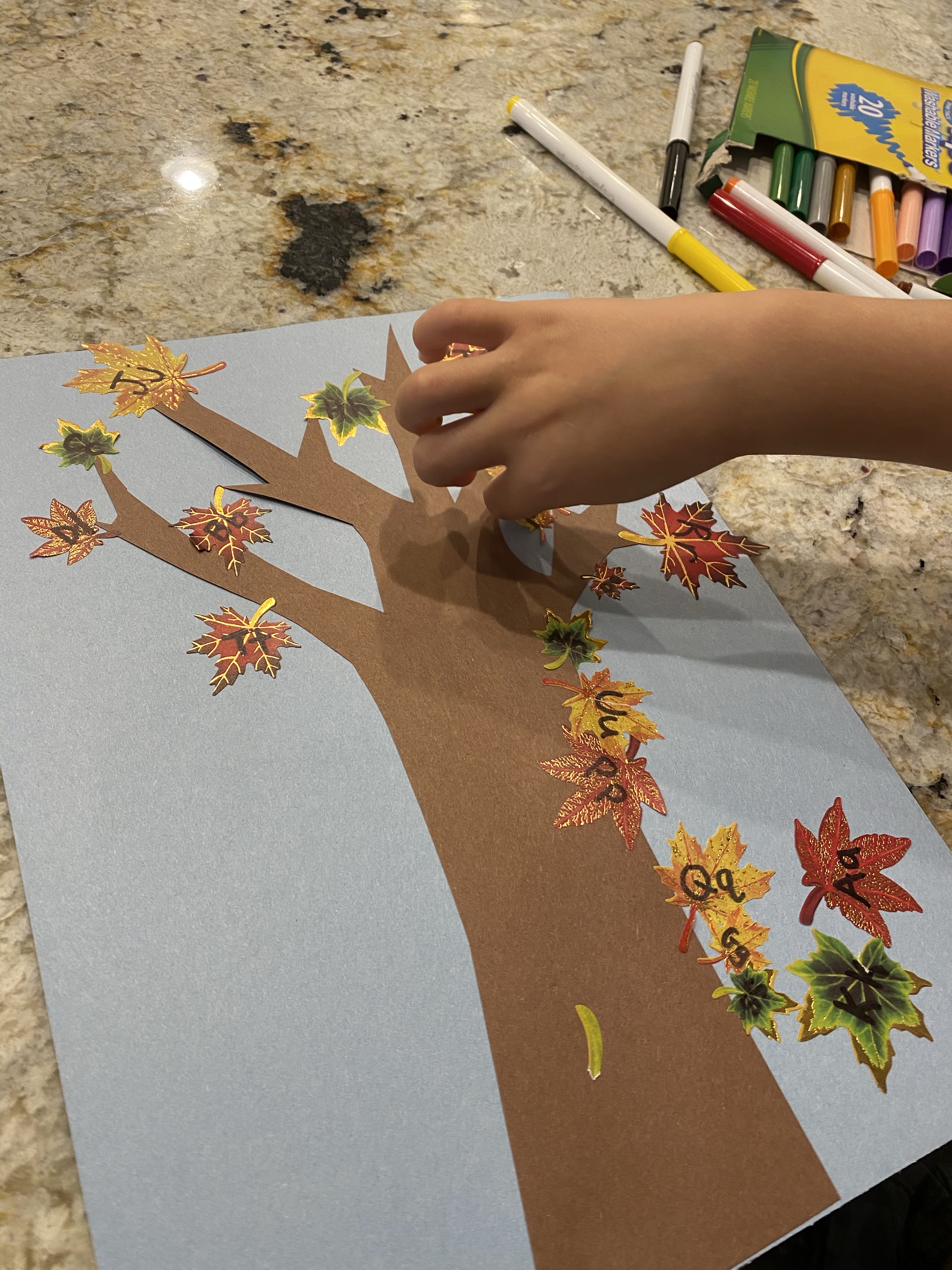 -ABC fall leaf tree: I got some fall leaf stickers at Walmart and wrote the alphabet on them. I cut out a tree trunk and stuck it to a piece of blue paper, then had my little stick the leaves on the tree. As he peeled them off, we reviewed the letters and their sounds.