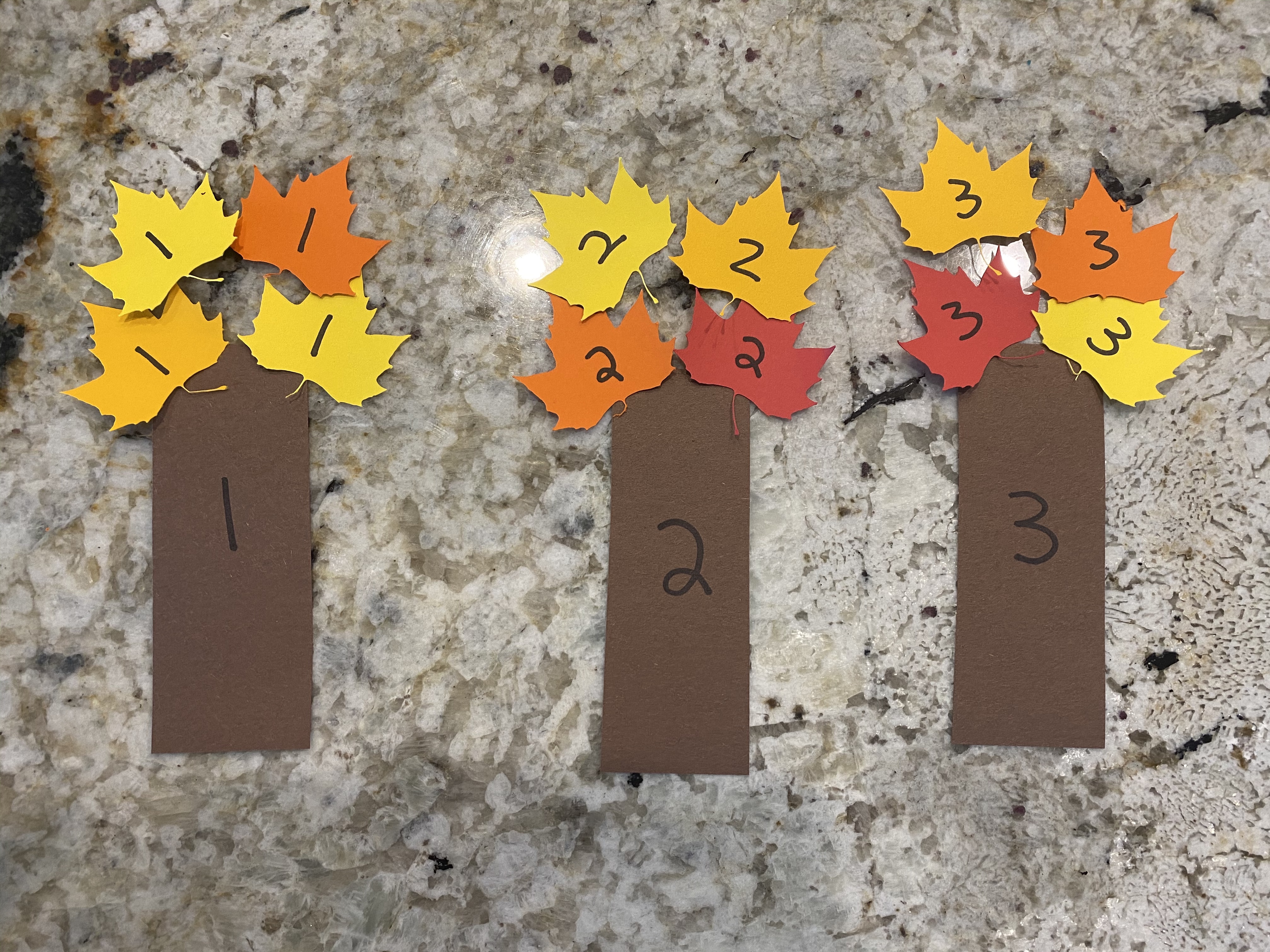 -Fall leaf number matching trees: I cut out brown rectangles and labeled them 1-10. Then I used my Silhouette Portrait cutting machine to cut out some small fall leaves from cardstock. (If you don’t have one and are in any way crafty, they are AWESOME! It’s like a dye cut machine that can cut any shape from any thin material! I have the smaller, less expensive one and it’s seriously my favorite crafting tool!) I labeled the leaves 1-10, with 4 leaves for each number. Then I had my little match the leaves to their tree trunks. We reviewed the numbers’ names as we went! I got the idea from A Dab of Glue Will Do, and just modified it to make more realistic trees!