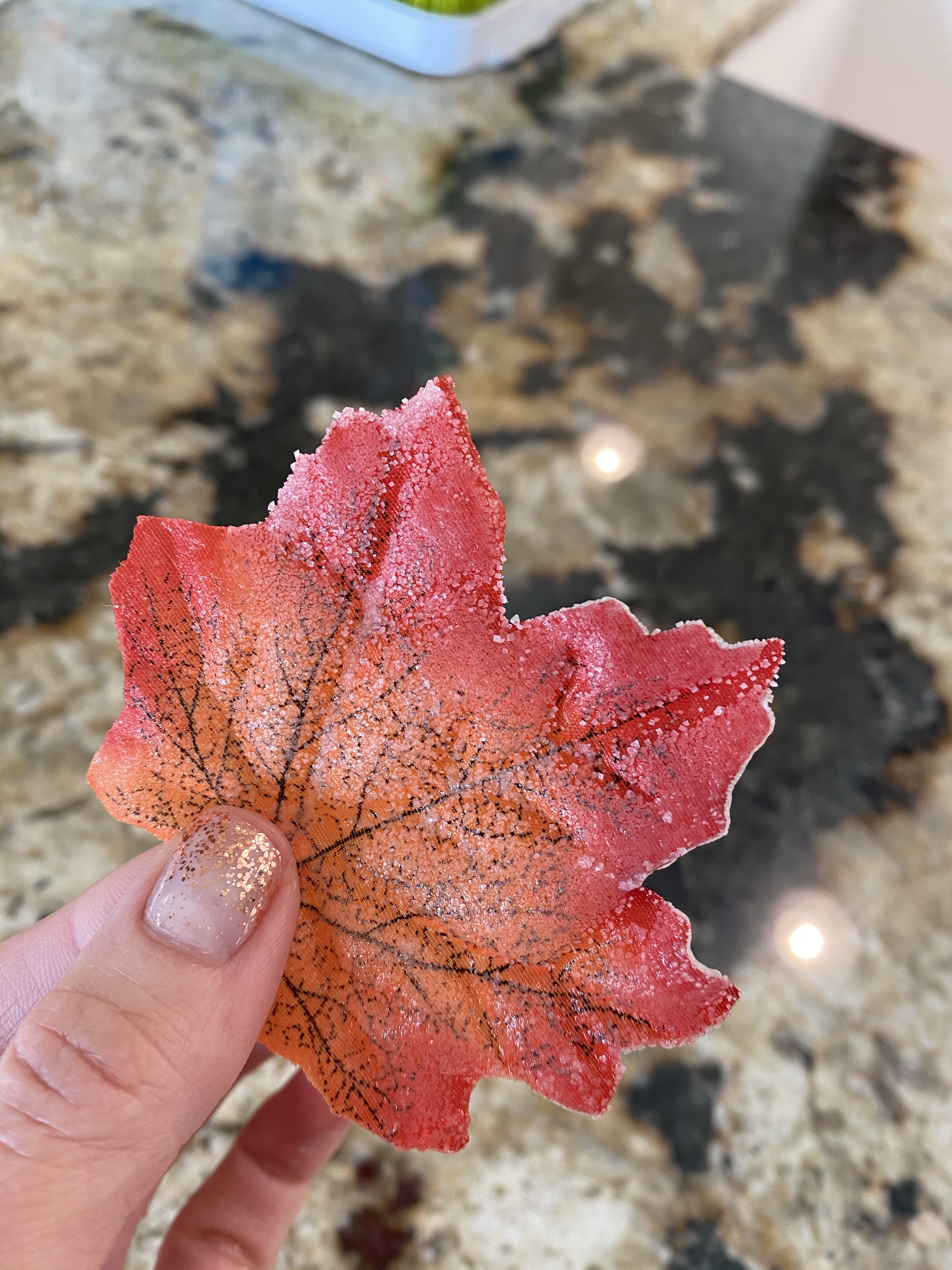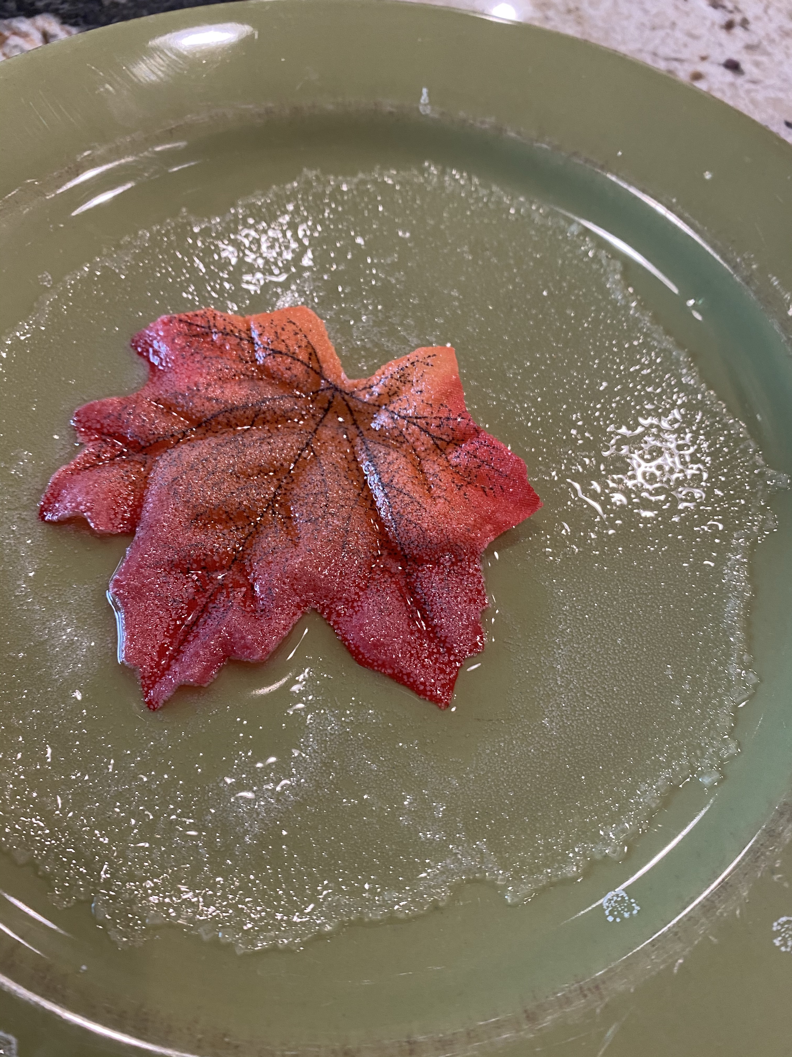 -“Frost” experiment: Since we don’t really get fall or frost until December where we live (actually, I don’t think my littles have ever SEEN frost! LoL) we discussed what frost is and how it forms (the water vapor in the air condenses or turns back into a liquid when the air cools at night, then lands on surfaces…and if the air cools off enough, it freezes making a thin layer of ice on everything in the morning!) Then I mixed salt into 1/2 a cup of boiling water until the water couldn’t hold anymore salt- you just keep sprinkling it in and stirring until there’s salt on the bottom of the bowl that won’t dissolve- this makes a “super saturated” solution. I placed one of our silk fall leaves on a plate, and spooned the water on it so it was just covered. Then we waited overnight and when we woke up- we had “frost”! (I did have to explain to my little it wasn’t real frost because he thought it was…which lead into a great discussion on saturated liquids and how crystals form!)