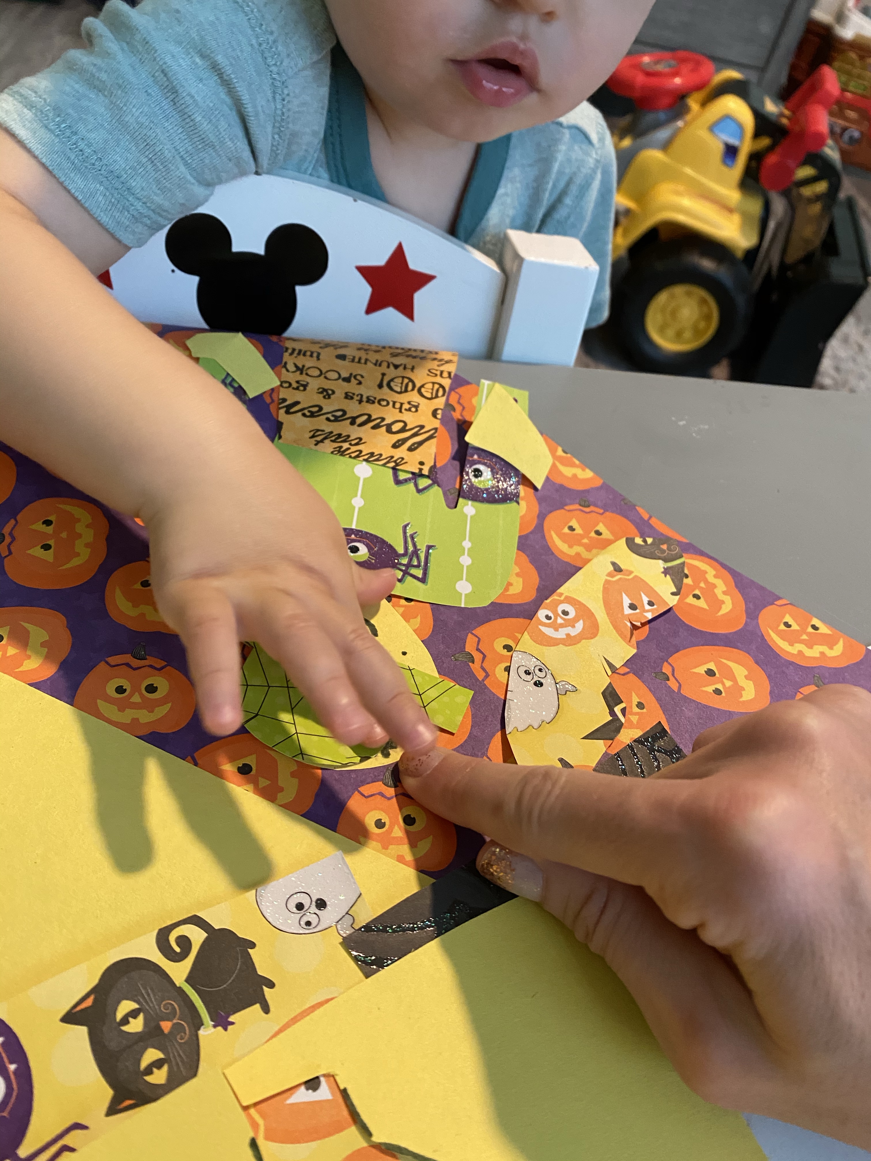 -Scarecrow crafting: I pulled out all my fun Halloween scrapbook paper (I know, it’s early, but it still makes for such cute scarecrows to use patterned paper!) and let each of my littles choose 3. For my preschooler, I drew pants and a shirt on the back of the colors he wanted, then had him cut them out. Then he cut out a hat from the third piece of paper (he wanted to do that on his own). Next, I had him cut out a head (which I drew) and do a fringe cut along a piece of yellow paper, which I trimmed to fit the scarecrow’s hands and feet. I drew a “scary face” on the head (at his request), then he glued all the pieces together! My toddler made one too, but I had to do all of the cutting (I did let him try the safety scissors while I held the paper for him- I used his cuts to make the hands and feet) and half of the gluing! LoL He glued on the hands, feet and hat by himself though!
