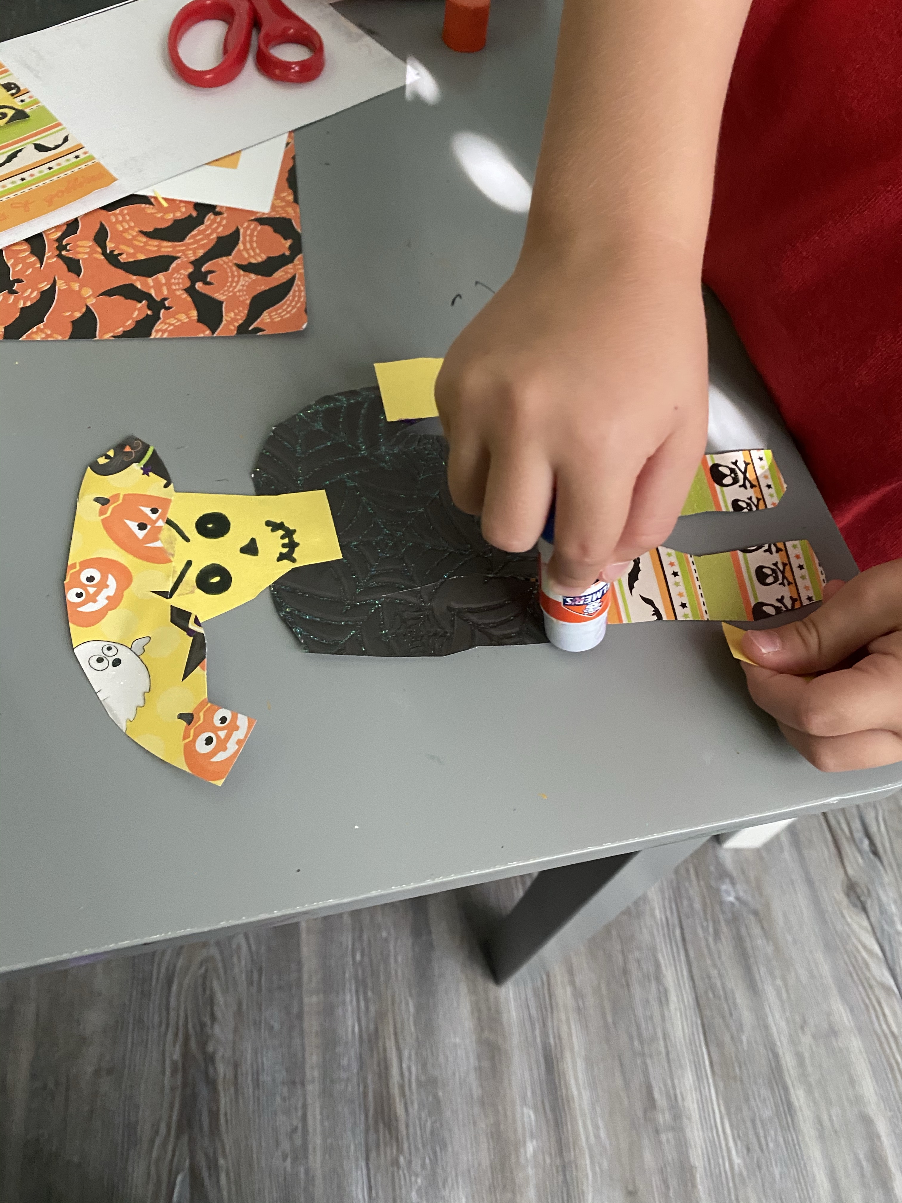 -Design a cozy fall blanket using patterns: First I had my little choose what colors he wanted his “blanket” to be. Then I cut strips from two of the colors (we used the third as a background to glue them on) and had him glue them down in a pattern (he chose blue, red, black- since the background was black, I showed him how he could leave a space for the black to show through). Then I cut some thinner strips of the base paper (black) and had him glue those down in the opposite direction to make squares so the blanket looked a little more “plaid”. You could also do this with just two colors- just play around with the design and have fun!