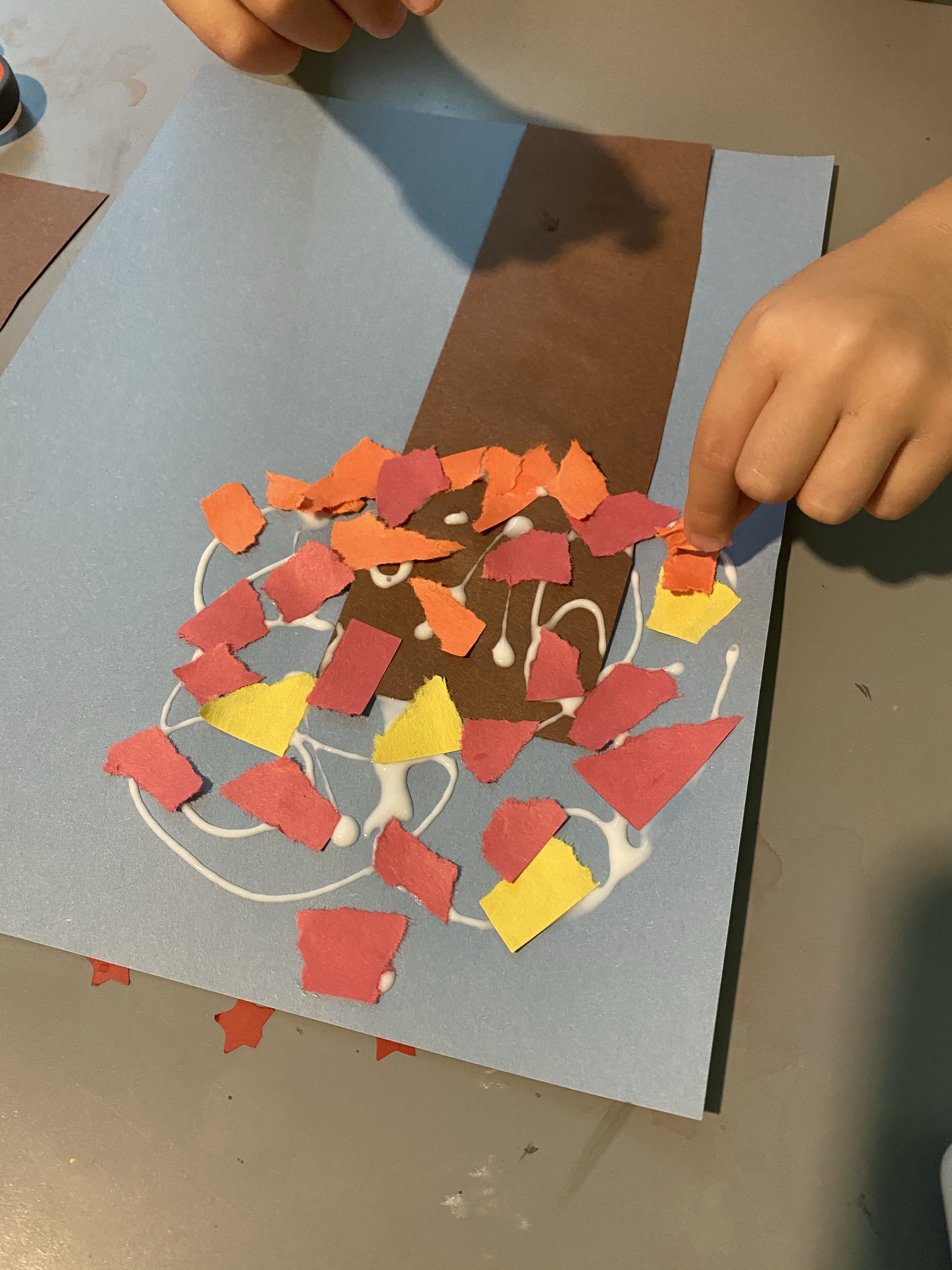 -Paper tear tree: I had my little cut out a tree trunk and glue it to a piece of blue paper. Then we tore up pieces of yellow, red and orange and glued them to the top of the tree for leaves!