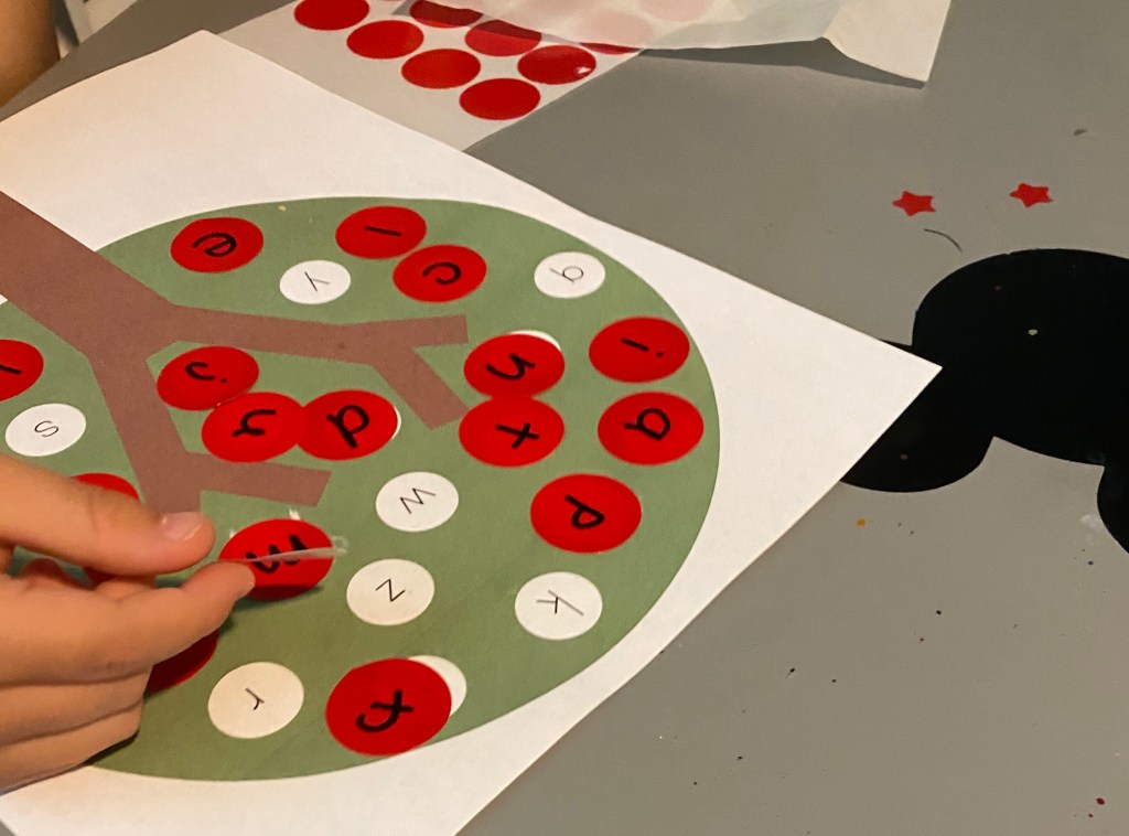 -Apple tree ABCs: I printed this cute tree for free from I Heart Crafty Things, then wrote the corresponding lowercase letters on some red dot stickers. Then I had my little match the stickers to the letters on the tree!