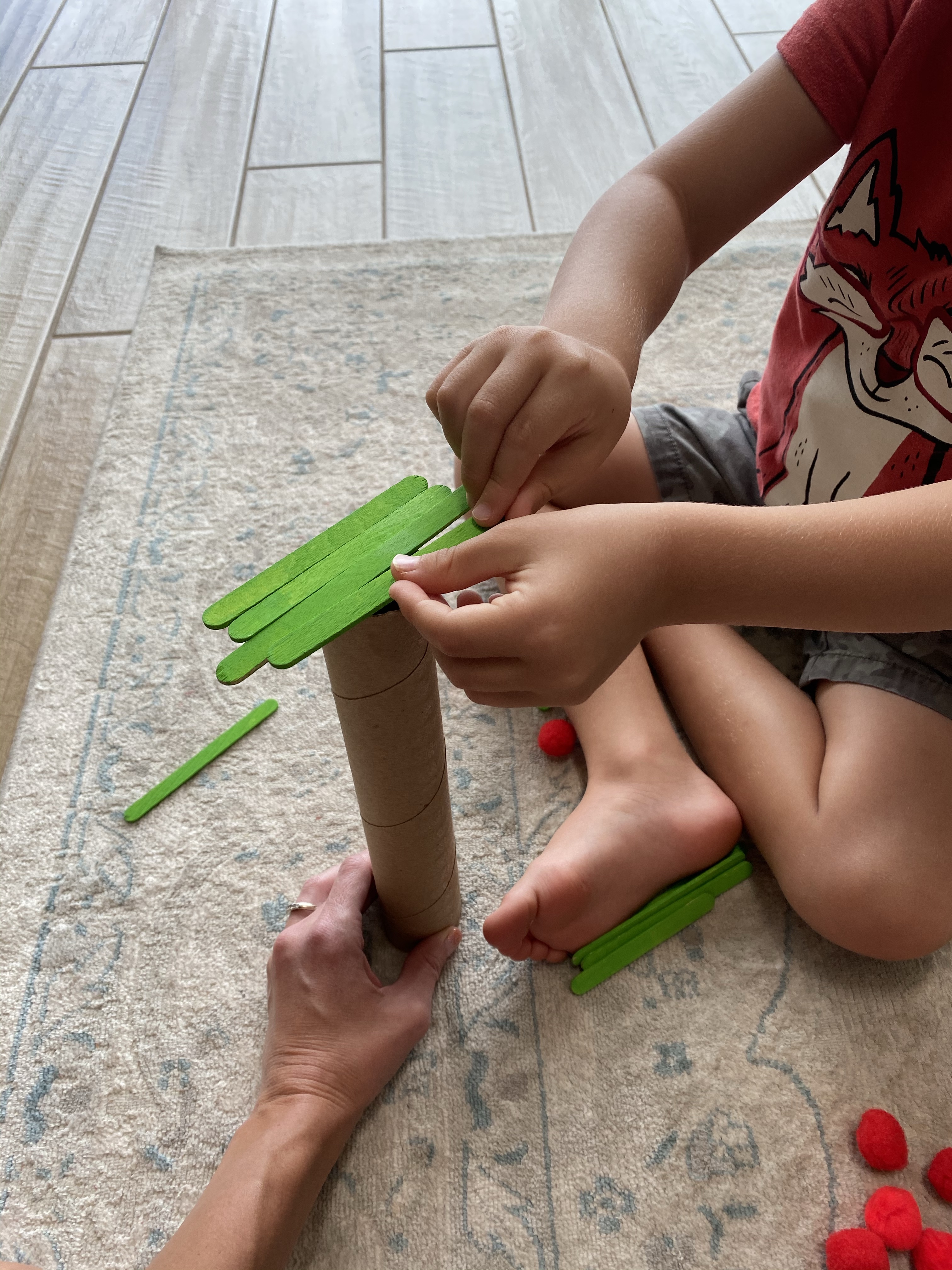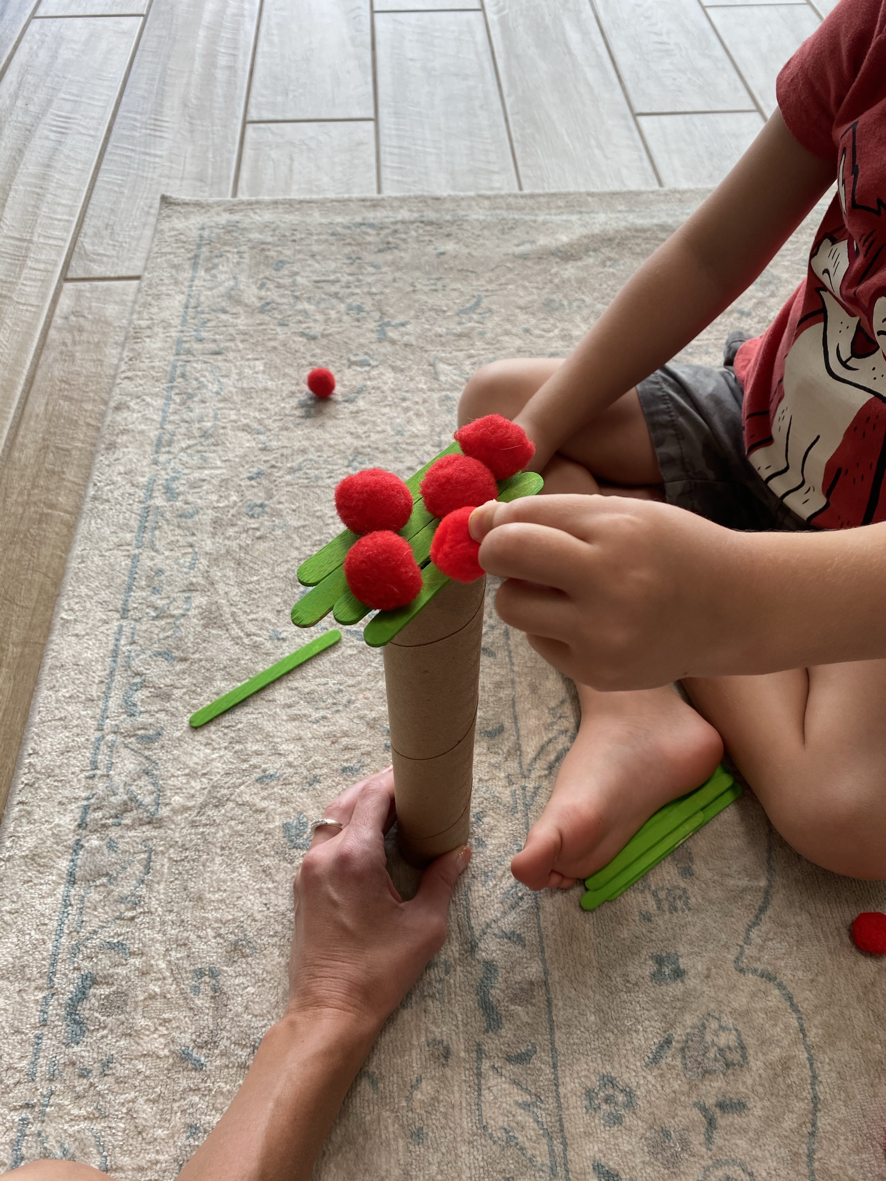 -STEM build an apple tree: My little loves STEM challenges, and this one was no exception! I painted several popsicle sticks green, then gave my little a “tree trunk” (I intended to use a toilet paper tube, but he wanted the giant paper towel tube he saw in my craft drawer instead…), the sticks and some red pom poms and told him his challenge was to build a tree so he could balance as many pom poms on the top as possible. We had fun building and playing together (he worked through the challenge alone first, then we tried it together!)