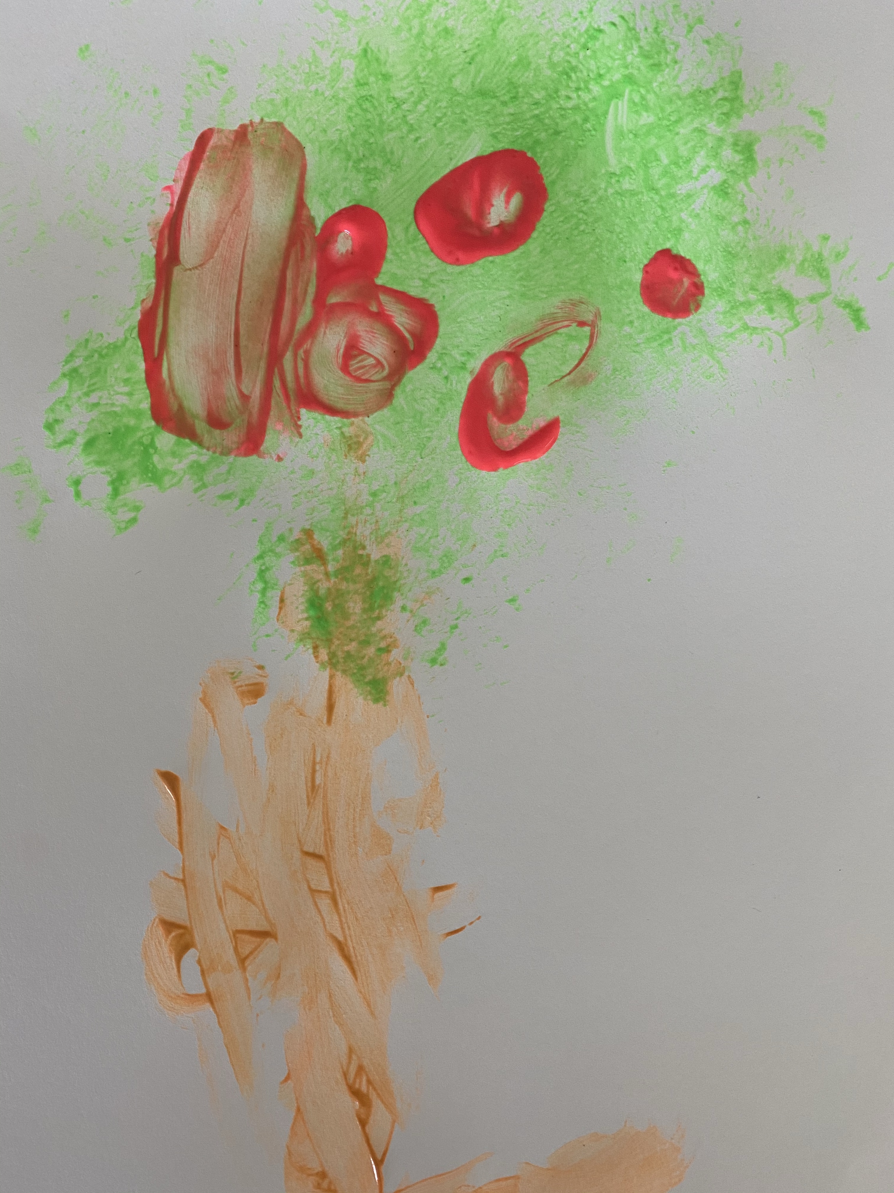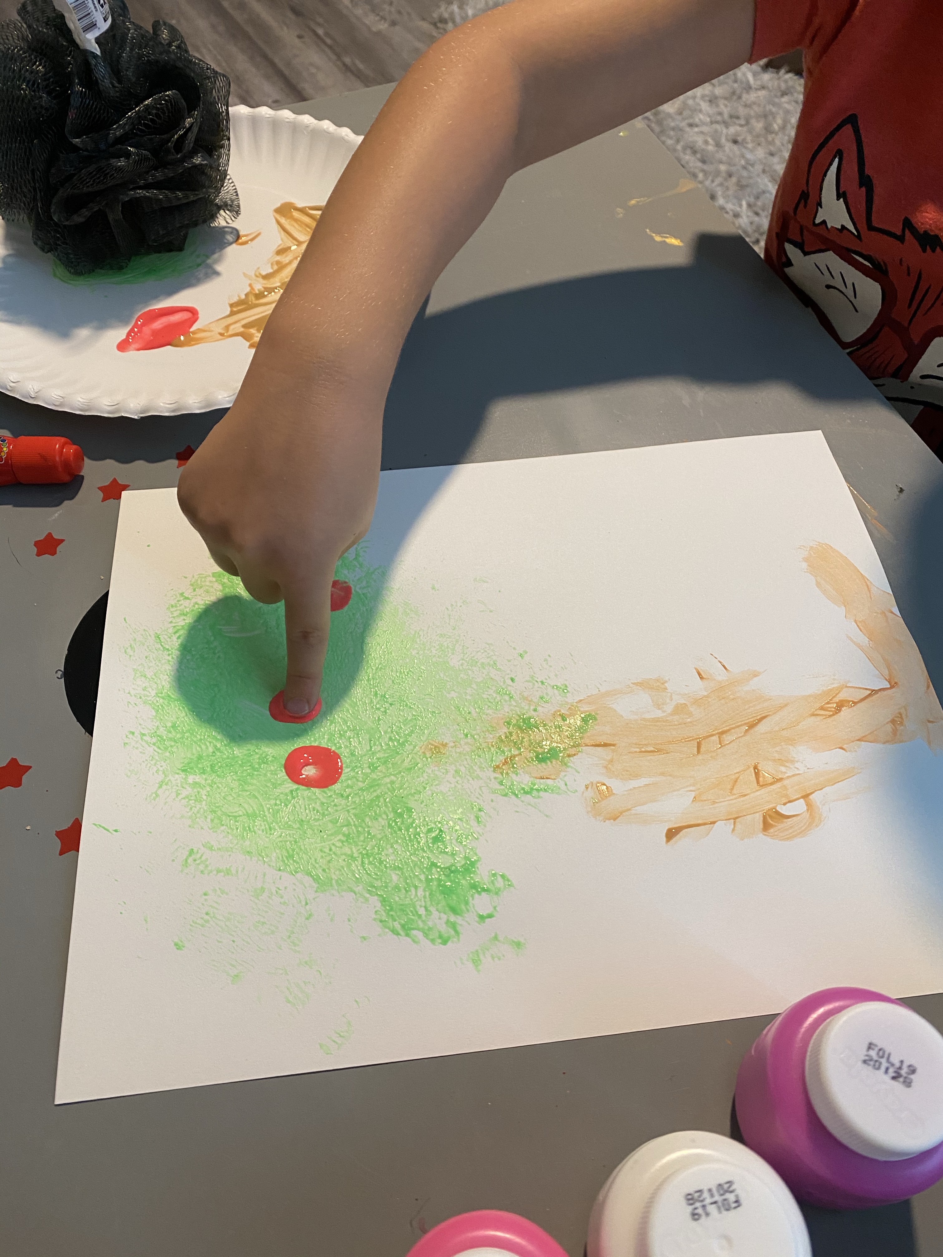 -Apple tree loofah painting: Painting with a new “brush” is always exciting, and in this case our brush was a loofah! First my little painted a tree trunk with a regular brush (please excuse our neon paint…I accidentally ordered it and haven’t got around to getting “normal” colors yet, so all of our art has an 80’s vibe! LOL). Then he added the leaves with a loofah and some green paint. Finally, he painted on some apples with his finger! I got this idea from Crafty Morning!