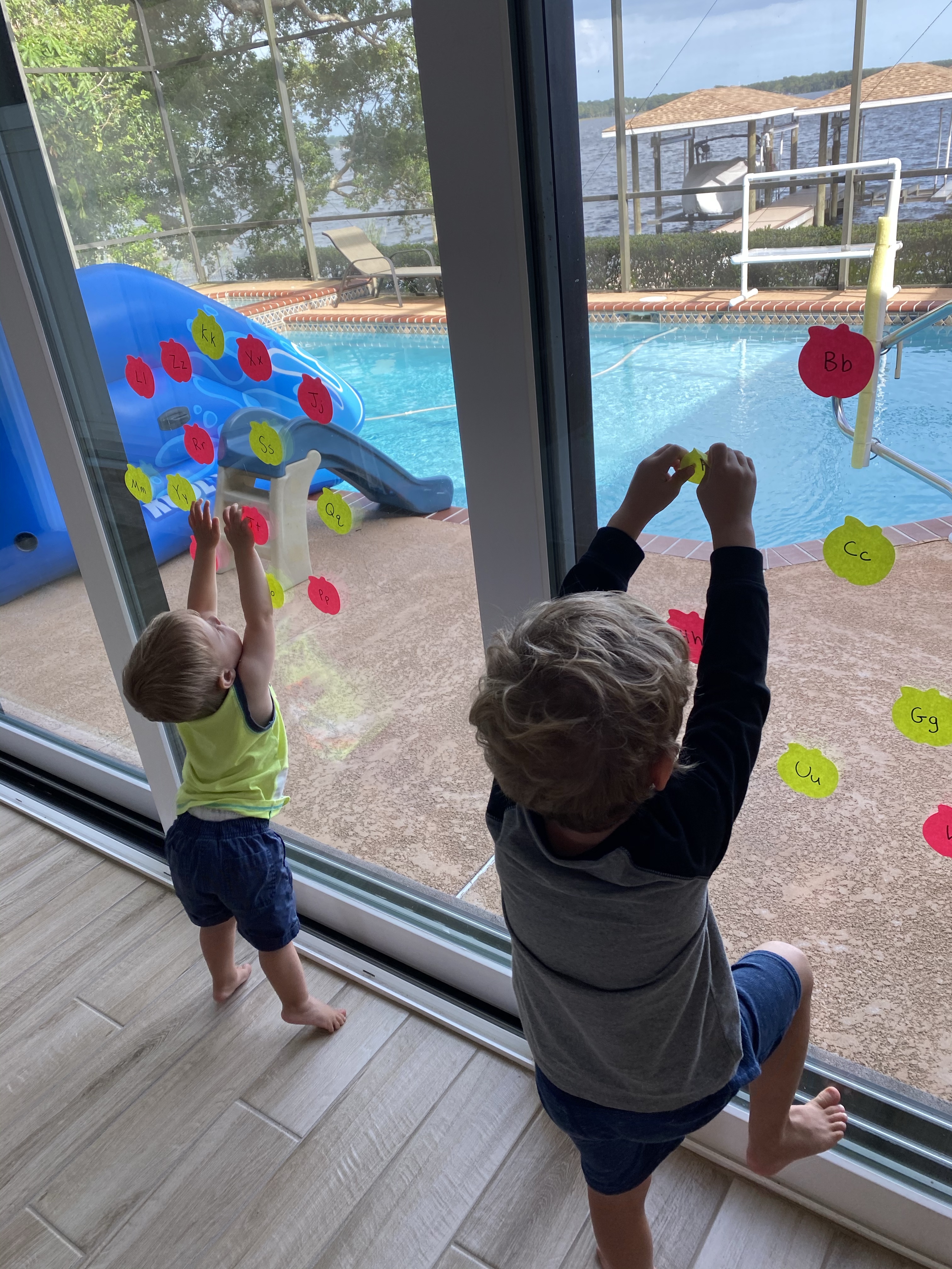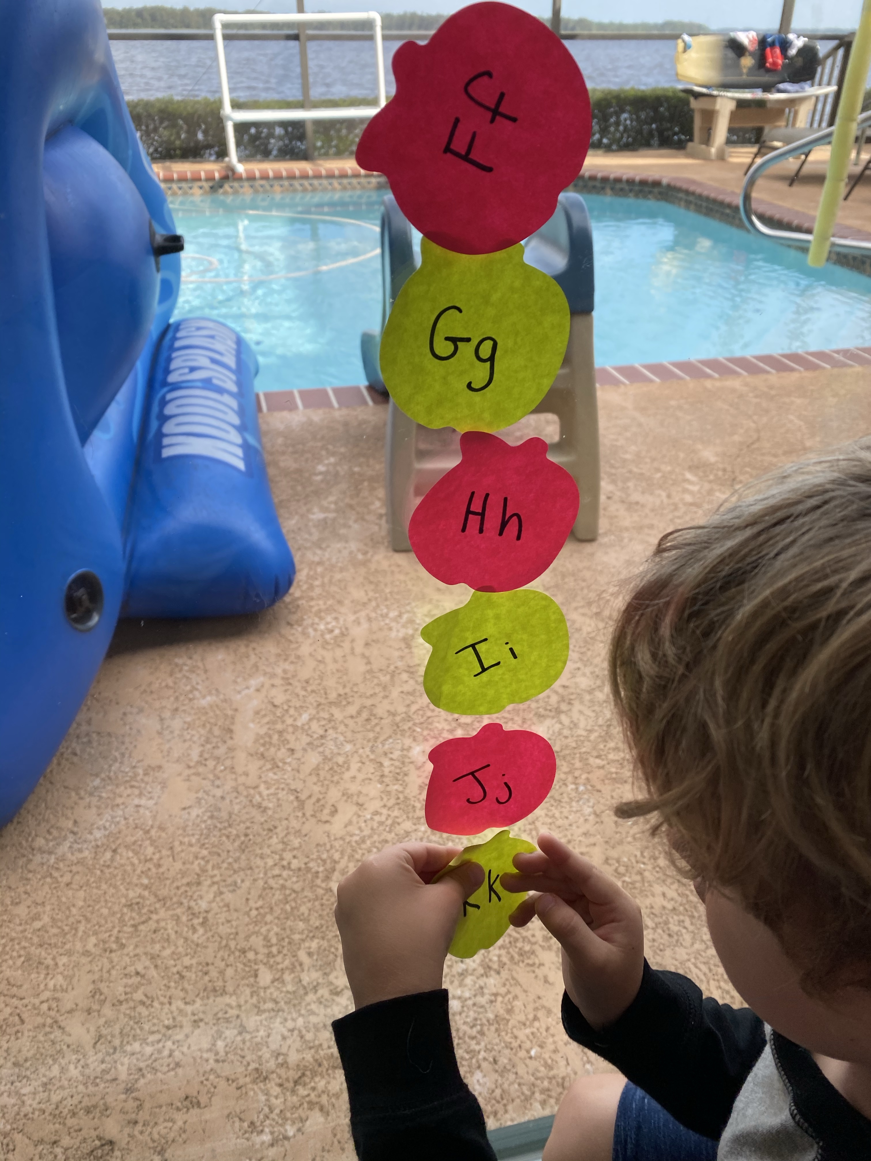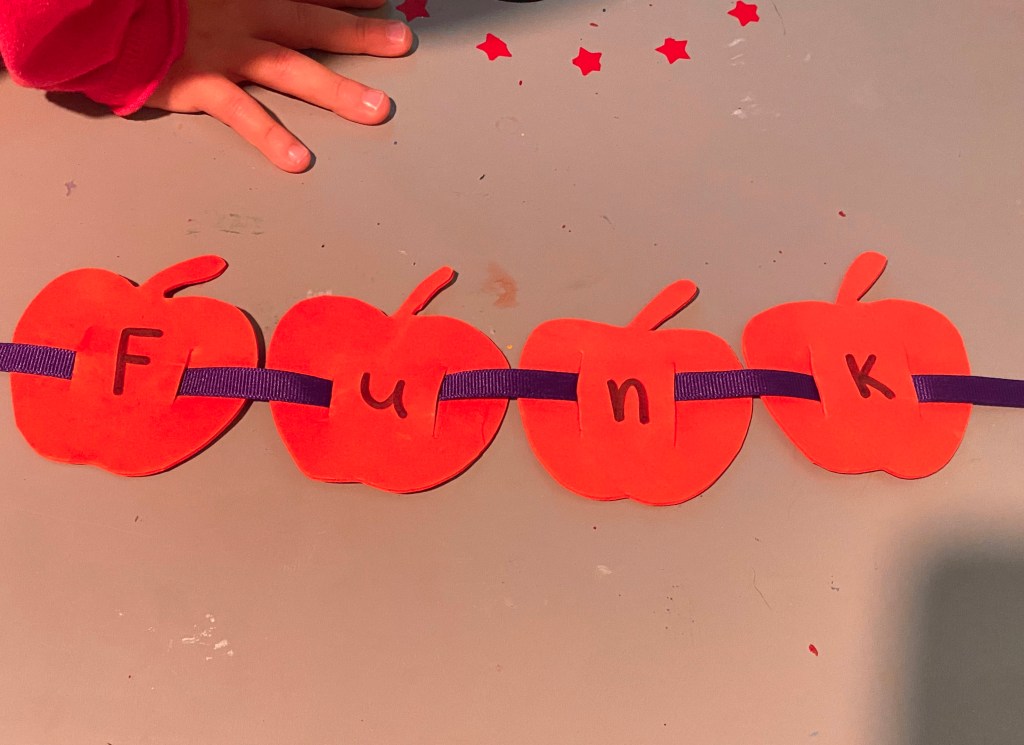 -Apple picking ABC play: I got some apple post it notes from Amazon and wrote the capital and lowercase letters on them. Then I made “trees” on our sliding glass door and had my little “pick the apples” in the order of the alphabet and stick them in the correct order further down the door. I got this idea from The Activity Mom.