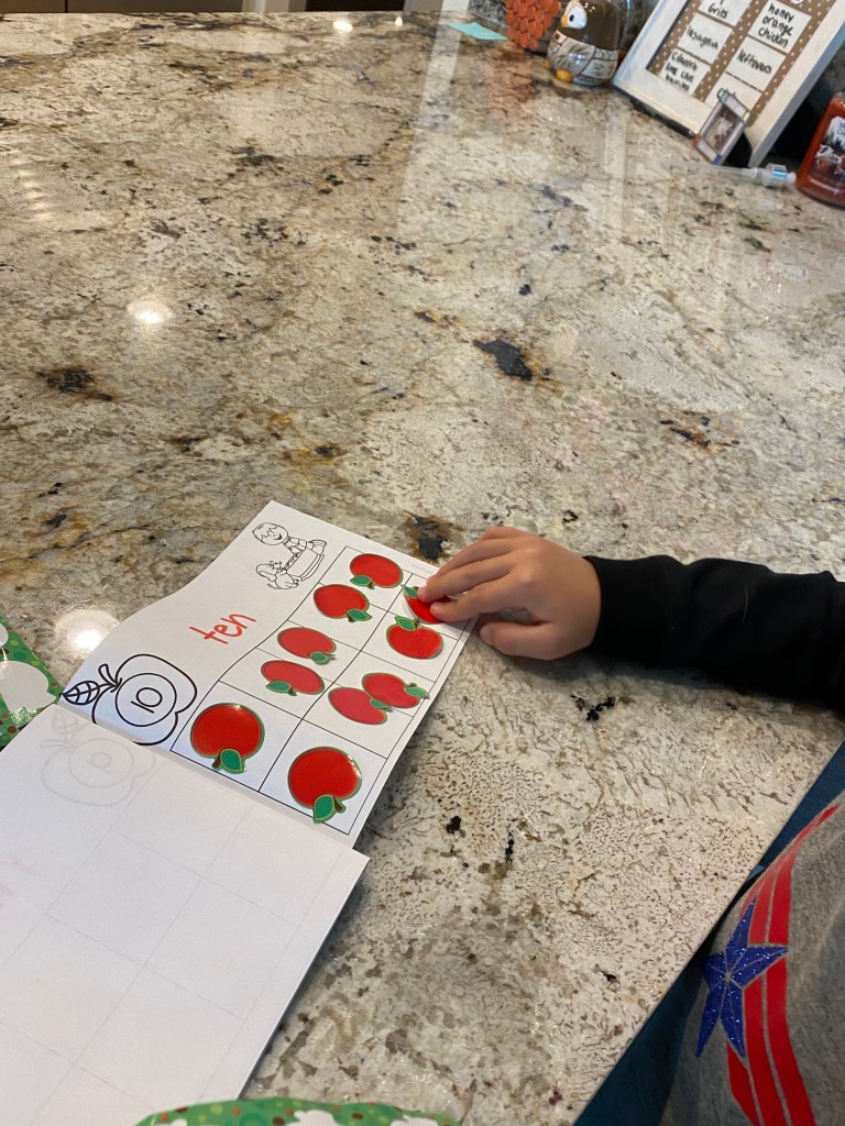 -Apple 10 frame book: I got this cute apple ten frame printable set for free on Teachers Pay Teachers. I cut the pages out and made them into a book, then had my little identify the number at the top of each page and add apple stickers to match the number. It takes nearly the whole pack of stickers to do this project, so if that gives you heart palpitations you can just use a red dot marker, but for $2.50 I figured it was worth it! hahaha