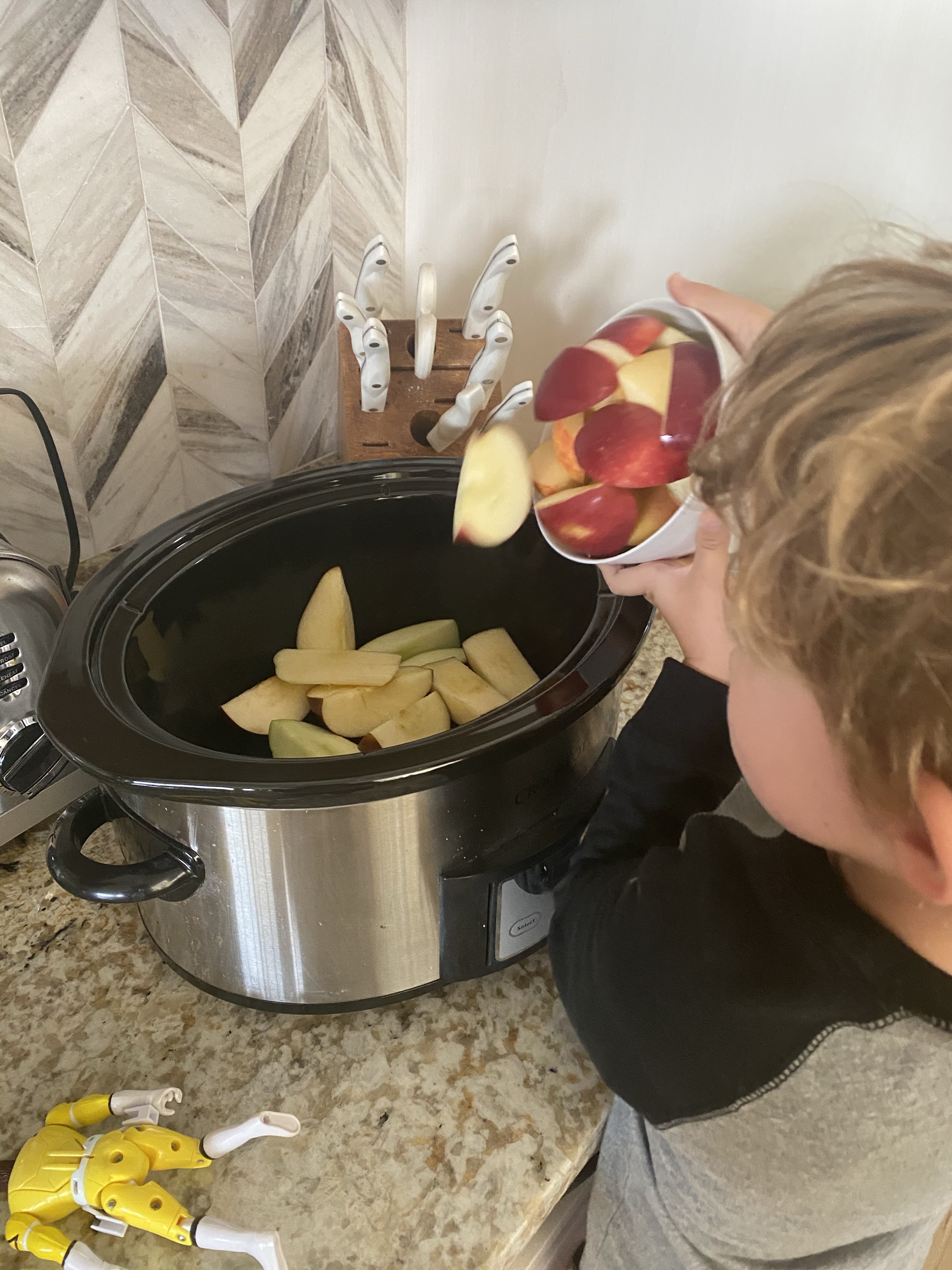 -How does food change when cooked? experiment: Since we had a bunch of cut up apples, I asked my little how he thought they would change when we cooked them. Then we tossed them (we used 6 apples, cored but not peeled) in the crockpot on high with 1 cup of apple cider, 3 teaspoons of cinnamon, and 1 TBSP of lemon juice and let them simmer until soft. When they were finished I took them out to cool and had him tell me what they were like before and after cooking. We talked about how sometimes cooking can make things soft, like carrots, potatoes, broccoli, etc. Then we popped the apples and all the juices in the blender and made applesauce! YUM!
