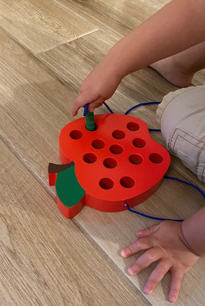 –Apple and worm threading: We got this activity on Amazon for the boys for long car rides, so I had to pull it out for apple week! They practice fine motor skills by threading the worm through the holes in the apple!