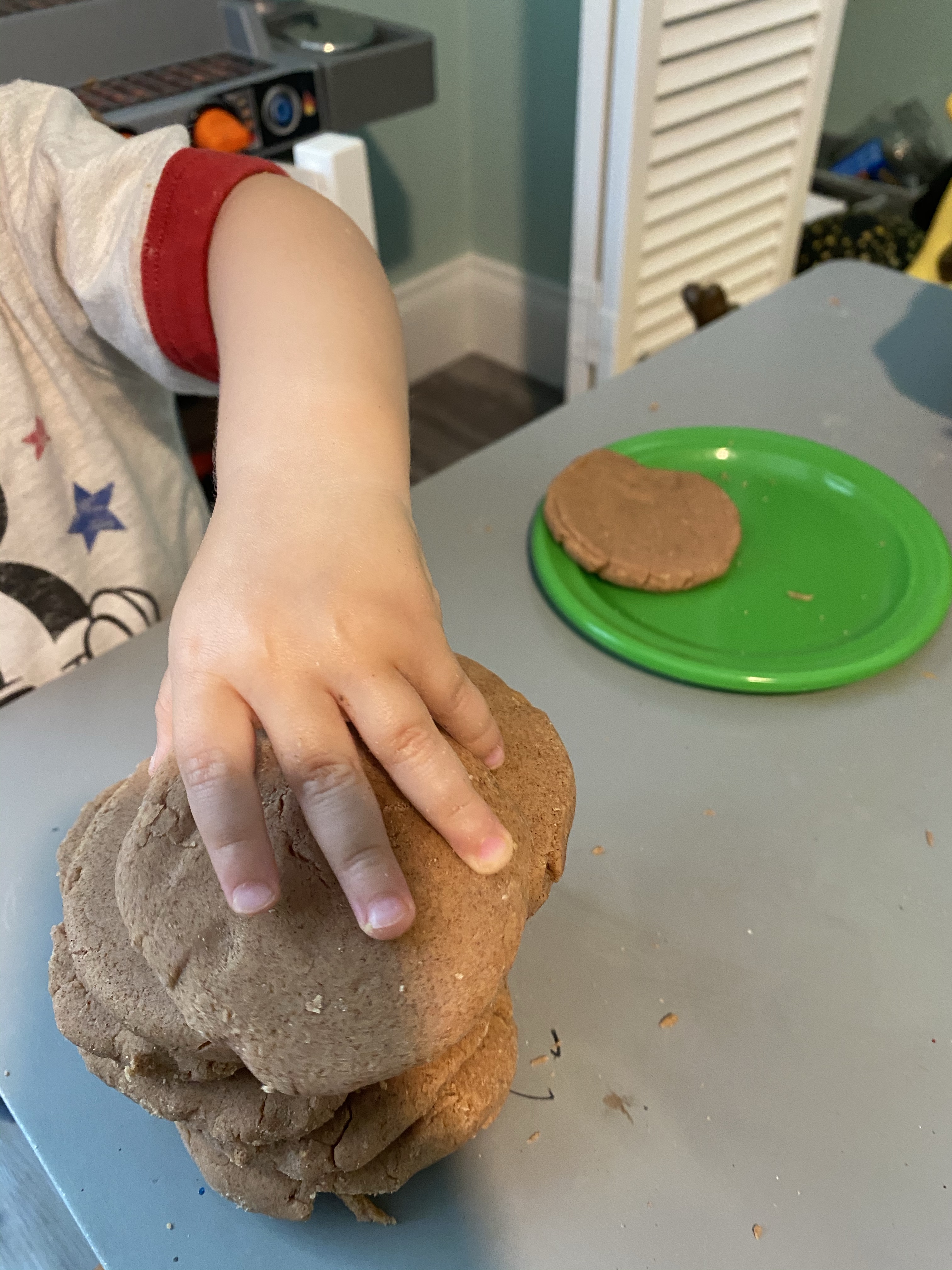 –Apple cookie recipe: So our “cookie shop” play with our apple pie playdough inspired us to find a real recipe for apple cookies, and we found one at My Recipe Magic that turned out pretty yummy! They came out kind of huge because I cut the recipe in half but then accidentally added too many eggs because I wasn’t paying attention (mom life with a toddler and a preschooler!), but they were still yummy and super soft!