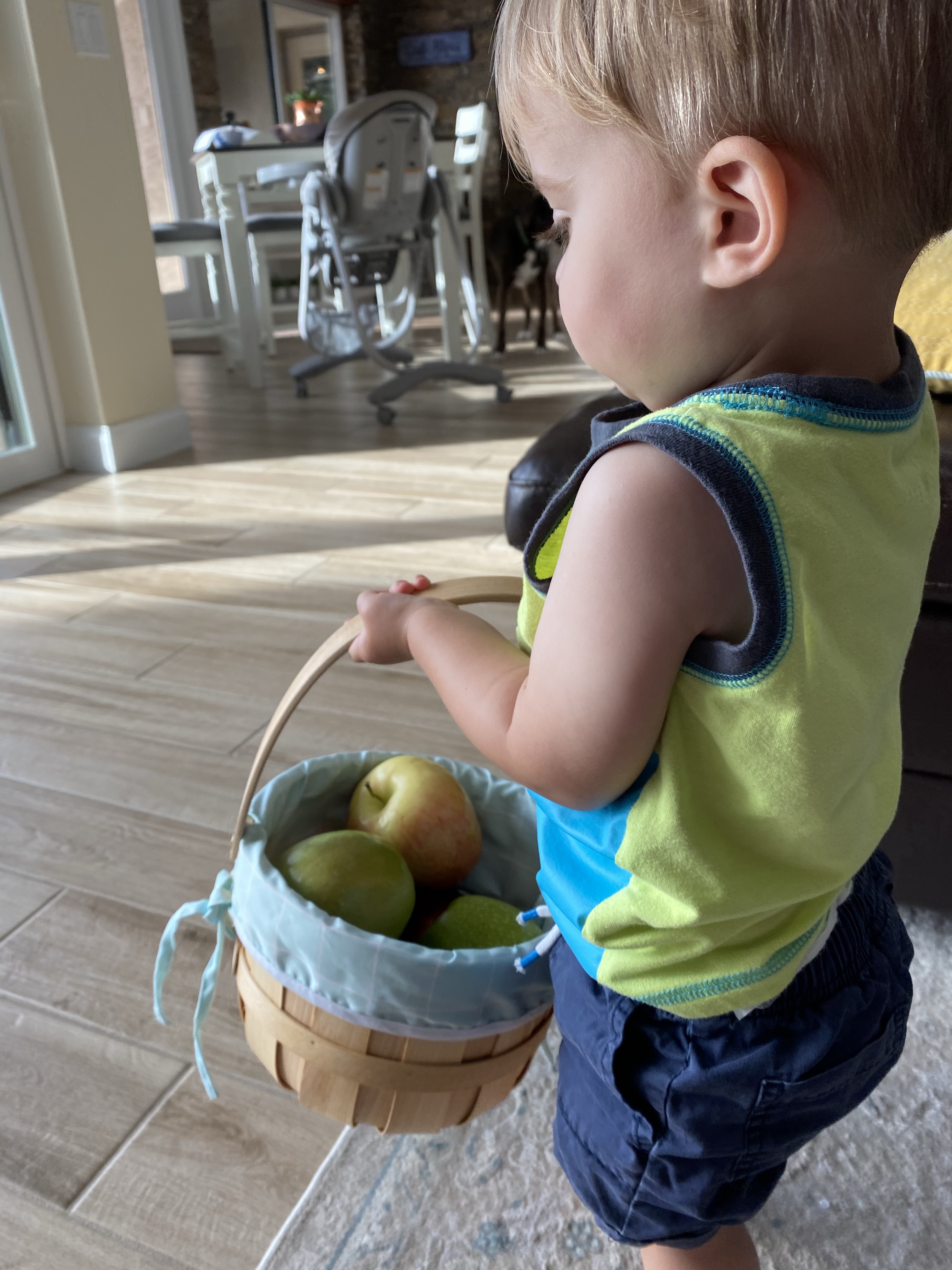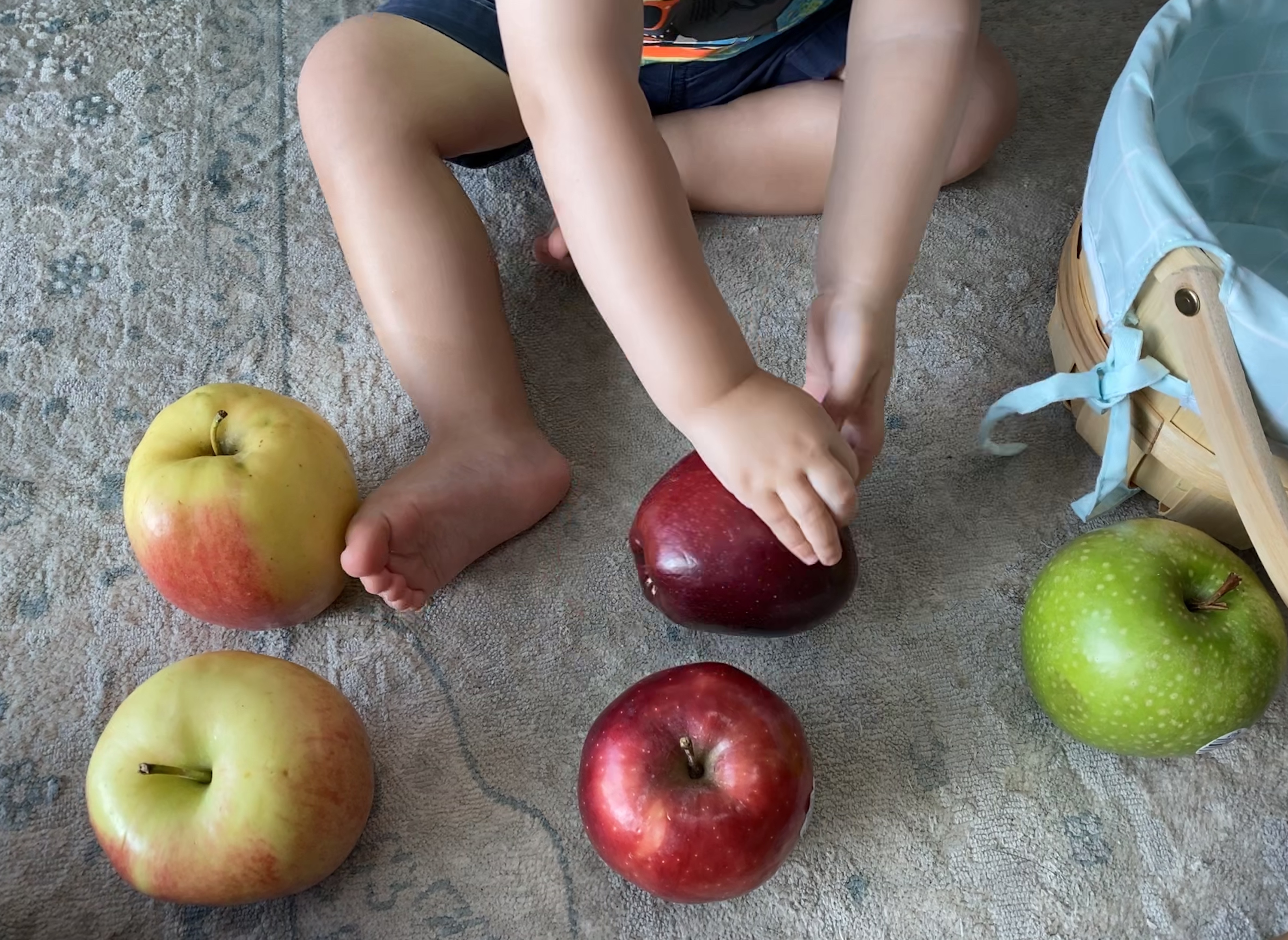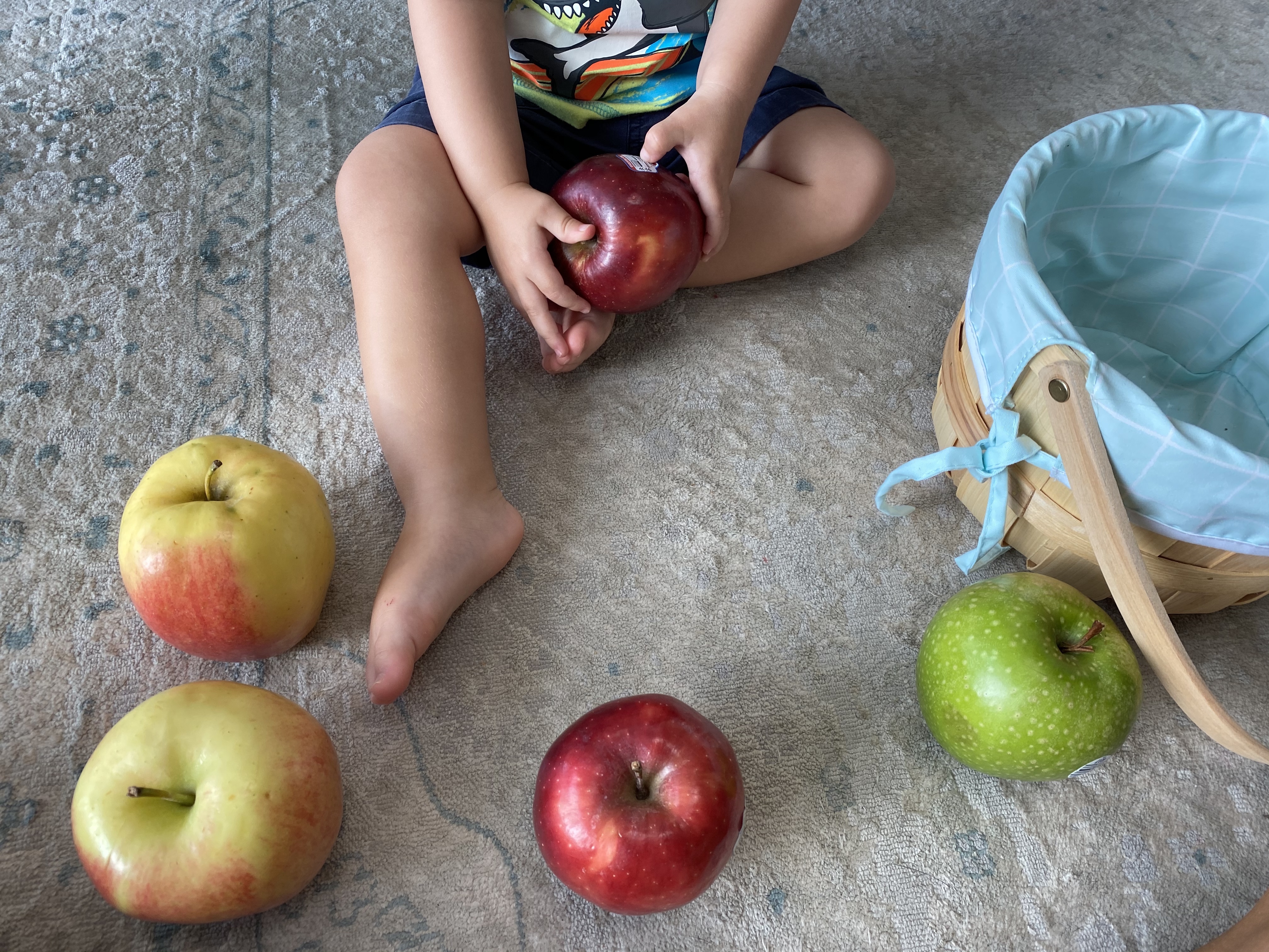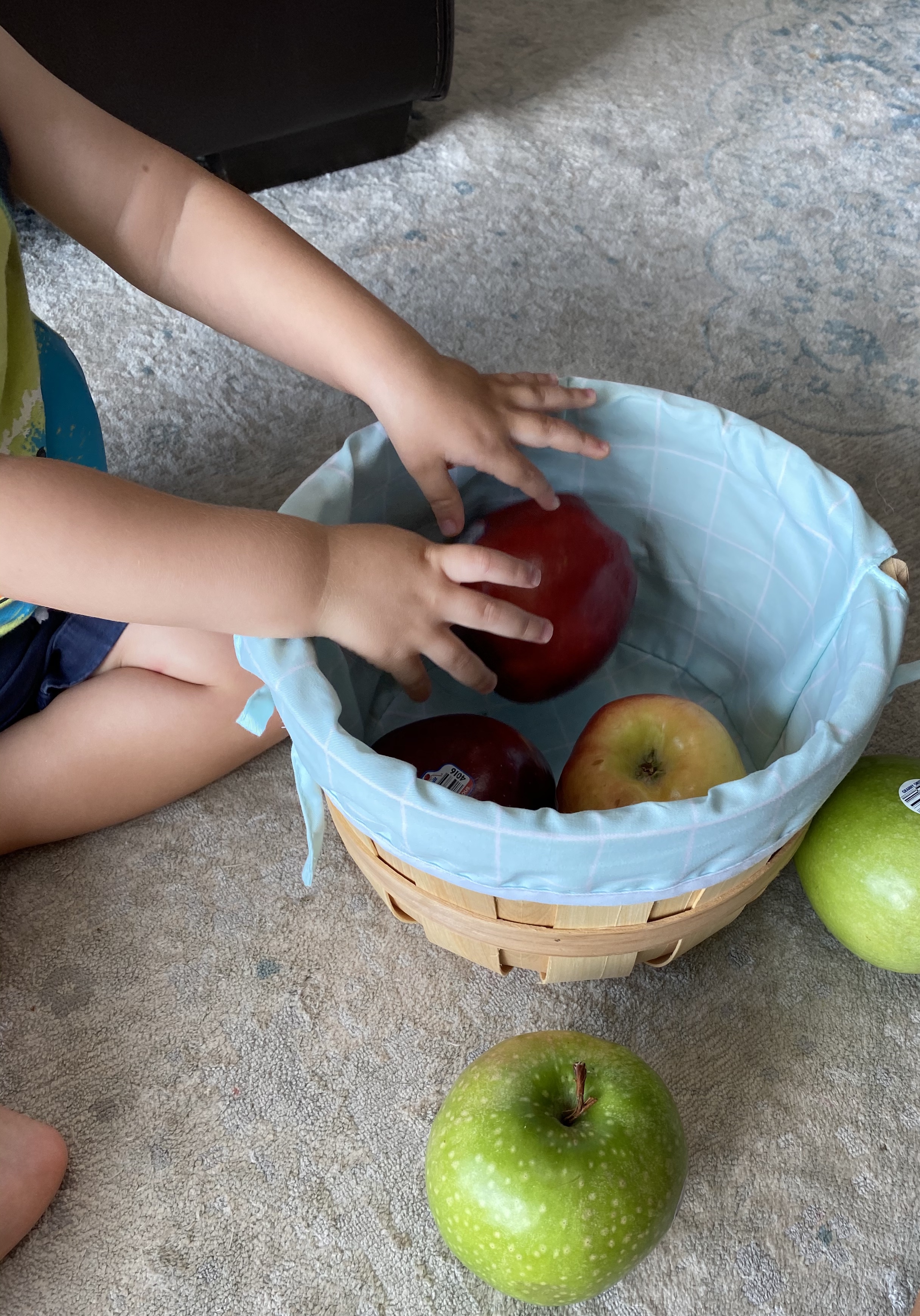 –Apple counting: After we finished our apple sorting, I asked my little to put the apples back in the basket (we just used an Easter basket from the closet!) and I counted them as he went.