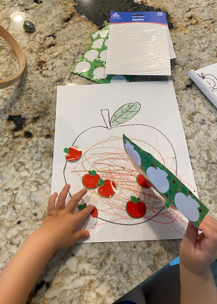 –Apple coloring and stickers: My preschooler was working on an apple counting activity with stickers and his little brother wanted to get in on the fun, so I drew an apple on a sheet of paper and let my toddler color it then add some apple stickers. Stickers are great for building fine motor skills, and kids LOVE them!
