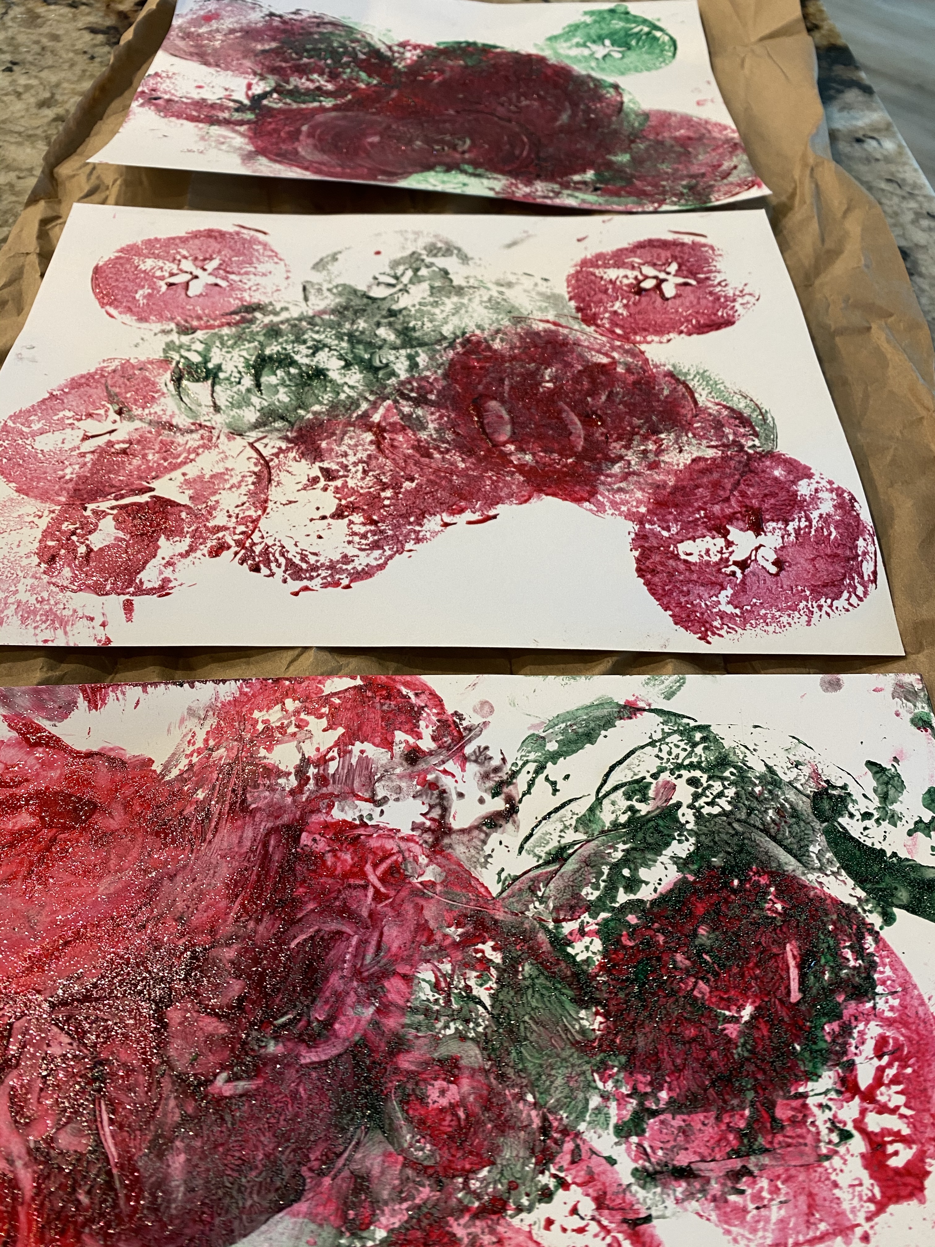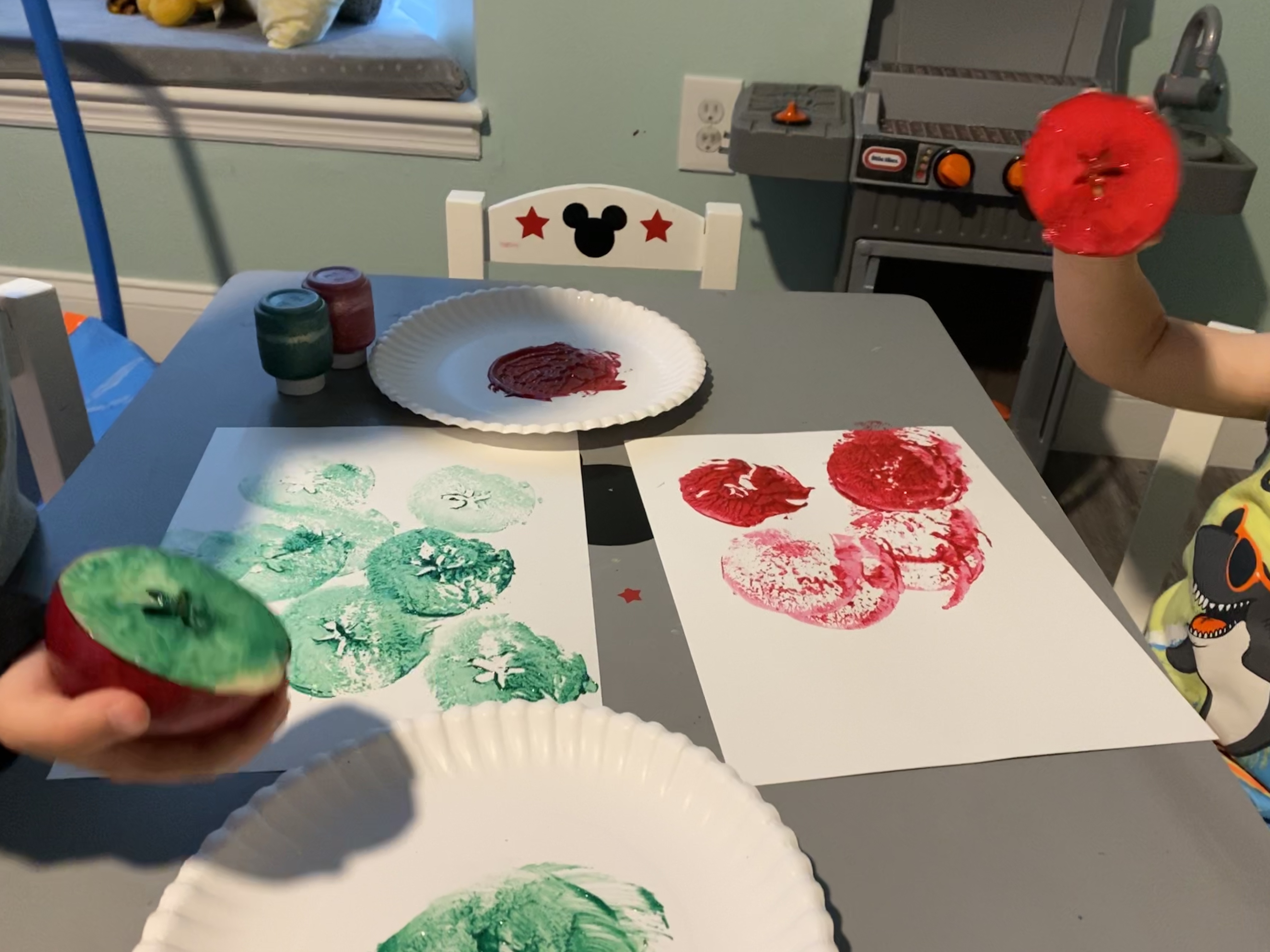 –Apple stamping: Oh man did my toddler LOVE this activity! You simply cut an apple in half through it’s middle (rather than stem down) and you get a fun star stamp! Swirl it in a little paint and let your little go to town stamping on a piece of card stock! I got this idea from Green Kid Crafts!