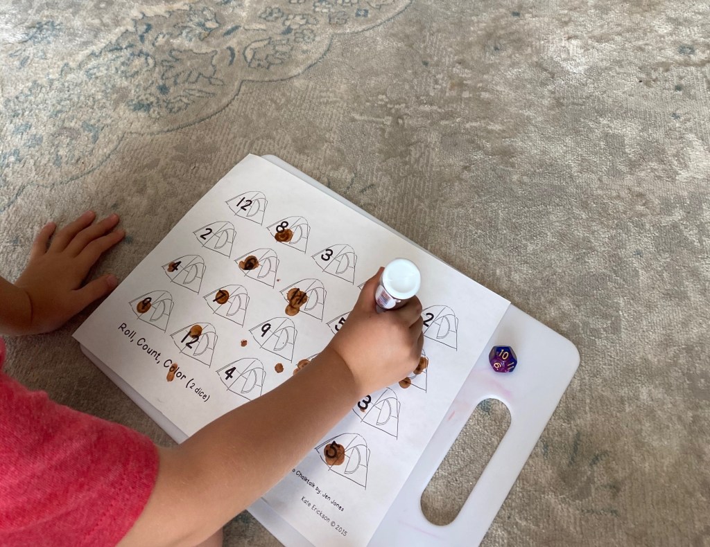 -Tent roll, count, dot: This was another gem I found for free on Teachers Pay Teachers! They had two sheets- one for one dice with numbers 1-6 and one for two dice with numbers 1-12. I picked the 2 dice page because I wanted to work on the numbers 1-10. Instead of using a traditional dice, we used our 12 sided dice because I also really wanted to focus on number recognition rather than counting, which my little is already good at. I had my little roll the dice, identify the number (or I would help him), then find it on the page and put a dot on it. He loves anything with dice rolling so this one was a hit!