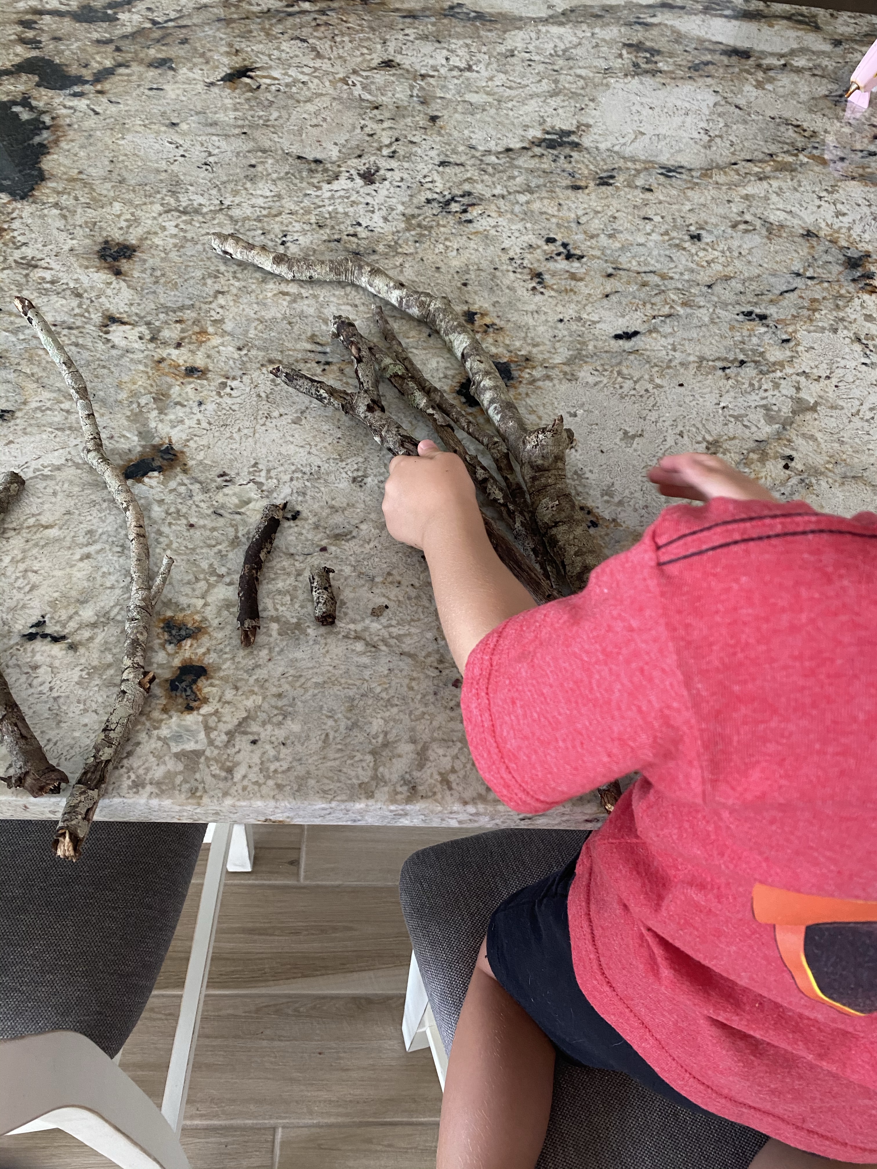 -STEM challenge- build a stick raft: My little LOVED this activity! I gave him the challenge “Build a raft out of sticks from the yard that will allow your stormtrooper action figure to float.” Then I gave him 2 minutes to gather up as many sticks from the yard as he could. Next, I had him think about what size sticks would make a good raft and had him sort out the good, sturdy ones from the tiny, spindly ones. Then I had him organize the sticks so that they could be glued together securely (I did the gluing with hot glue after he had finished). Finally we tested the raft out in our pool (a bath tub would also work!)- success!