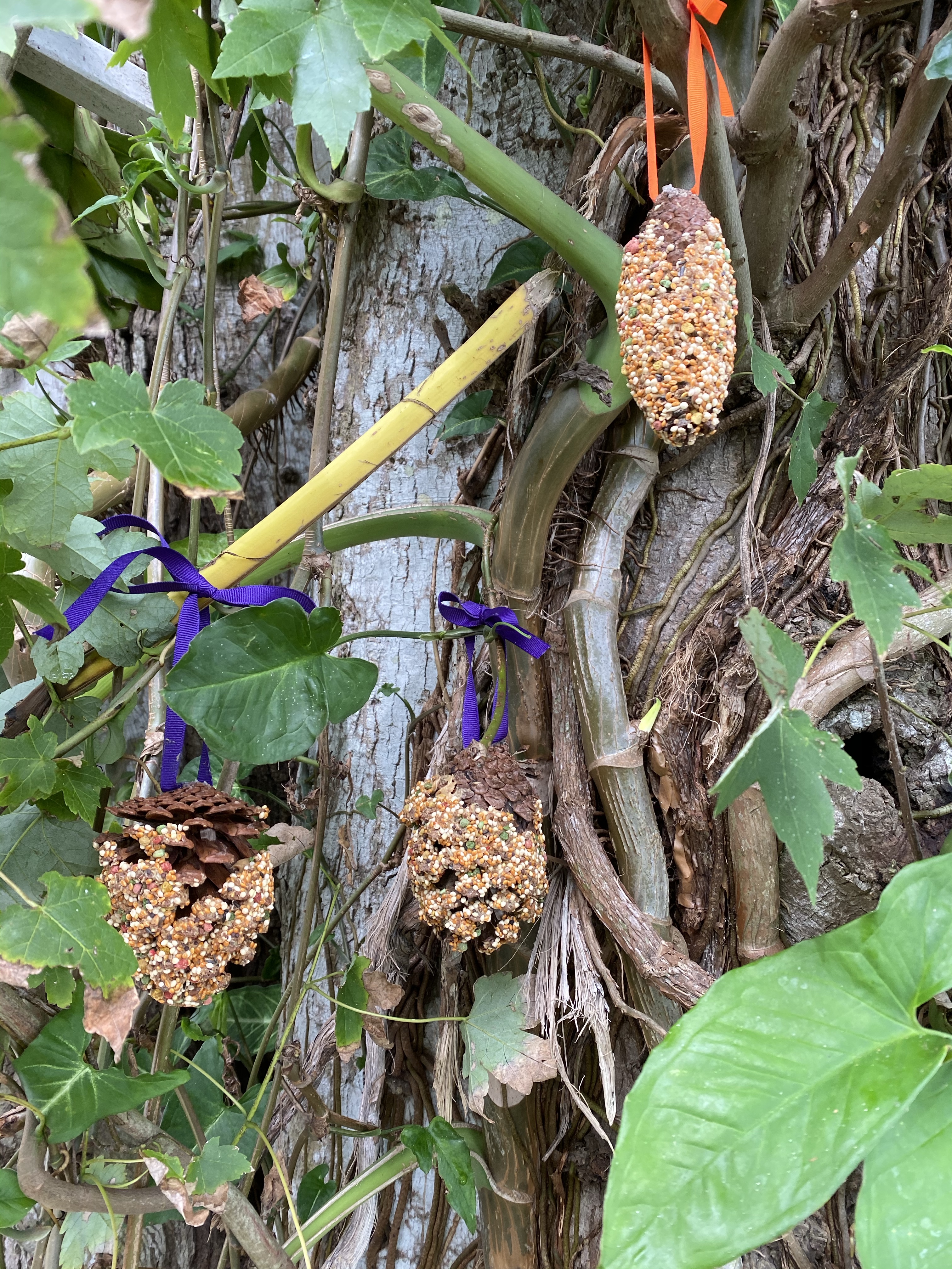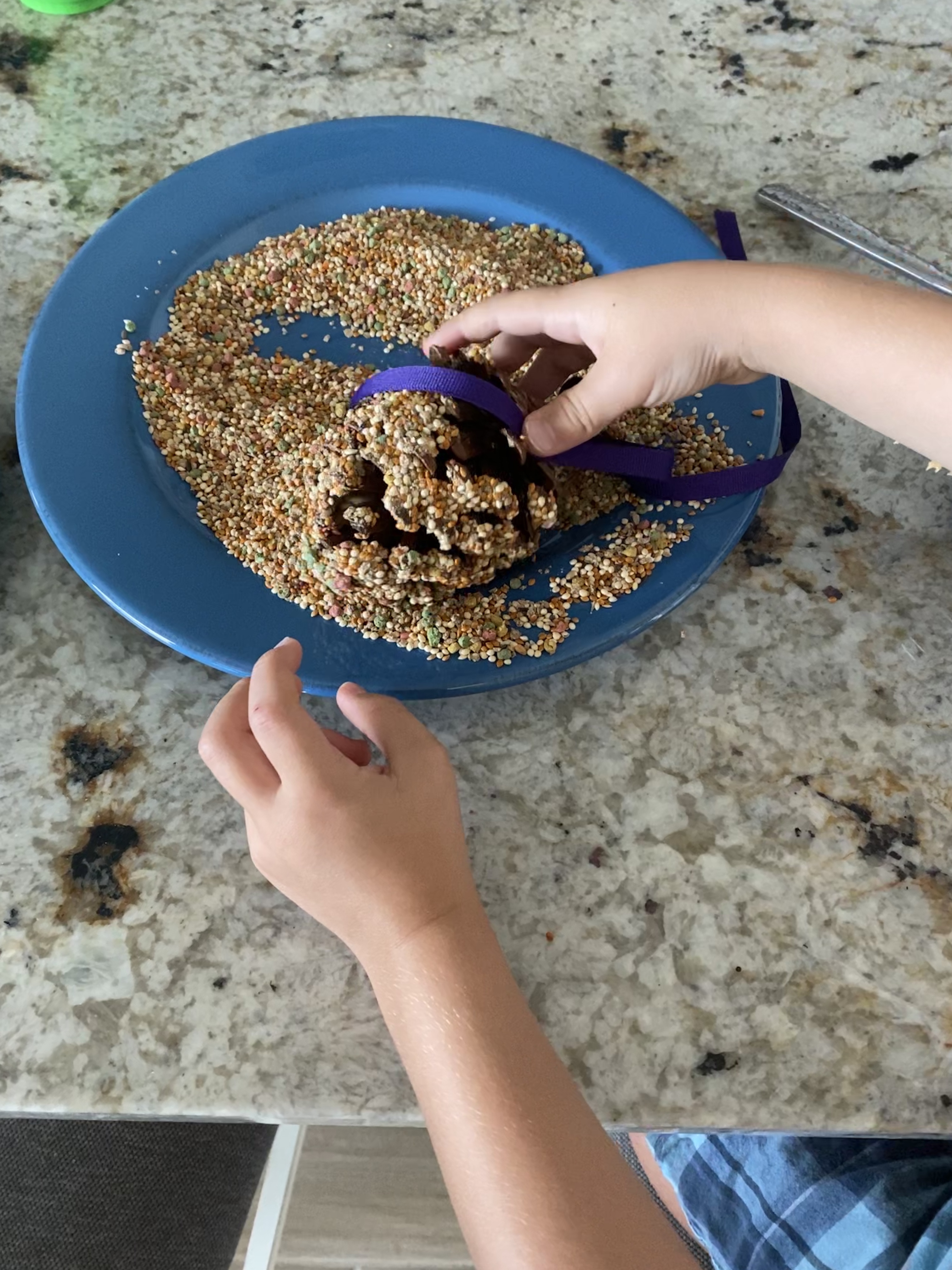 -DIY bird feeders: I totally remember making these in elementary school! We lived in freezing cold Northern Maine, and we hung them in the forest behind our school so the birds would have food for the winter! You just find a few pinecones, hot glue ribbon or string to the top of each one, then have your little cover them with peanut butter, and roll them in bird seed. When they’re finished, hang them in a nearby tree and watch your feathered friends feast! This is a great spring board for discussing what makes an animal a bird- we talked about bird features as we made our feeders! Although I made these as a kid, I got my inspiration to do them with my little from Mudpies and Manicures!