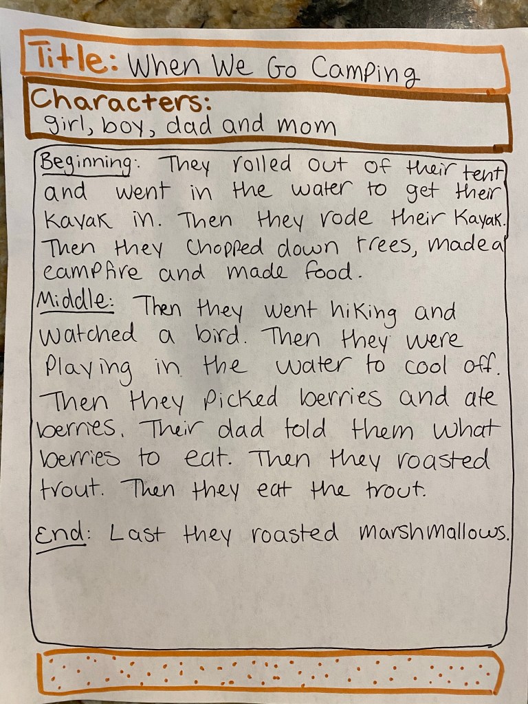 -S’more graphic organizer: I drew this s’more retelling graphic organizer, then had my little use the pictures in the story we read with our flashlight to retell the story. I wrote down what he said, then read it back to him when he had finished.