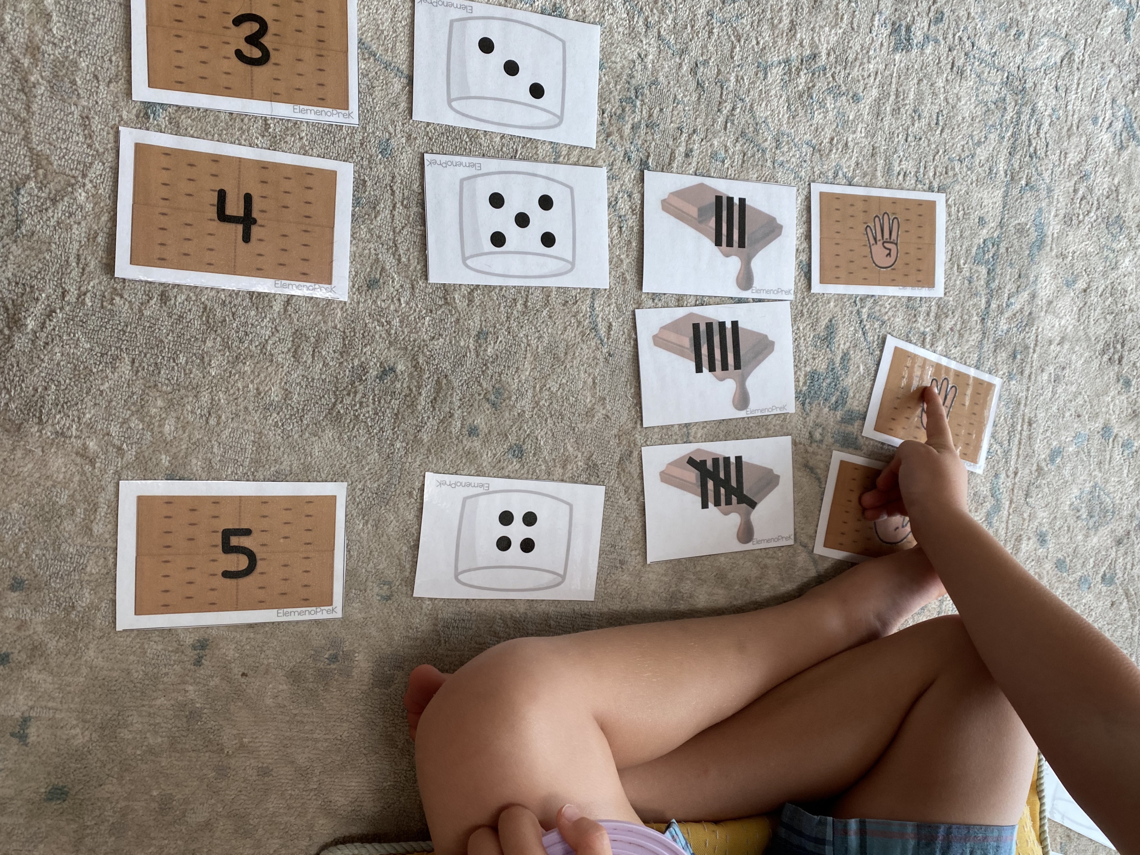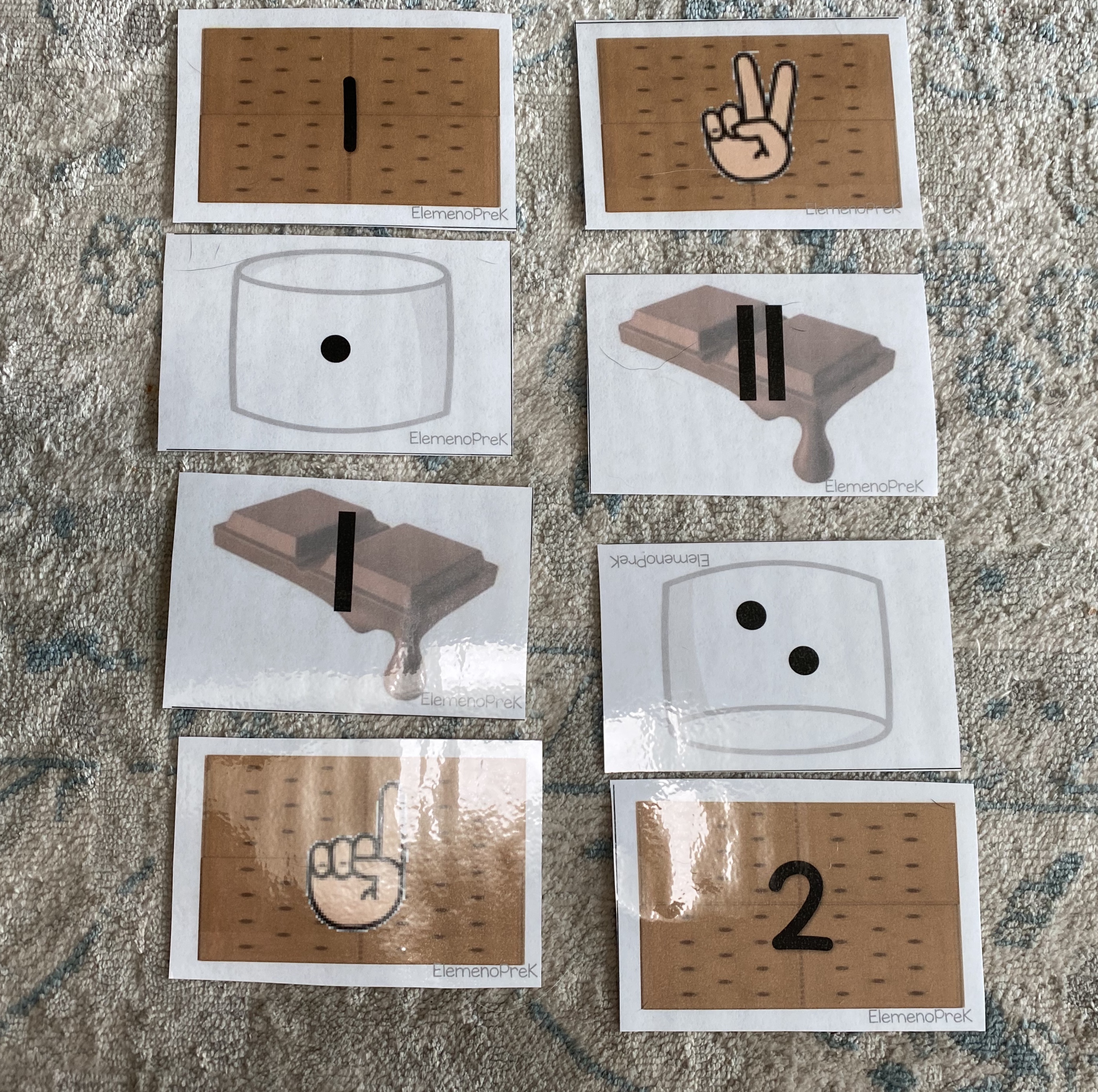 -Number recognition s’mores: I got this cute idea from Teachers Pay Teachers (for free of course!) You just print and laminate the cards, then scramble them up and place them in rows (see photo). Next, have your little find all the cards that show 1, then 2 and so on and put them together to make s’mores! We worked on numbers 1-5 and then 6-10 so it wouldn’t be so overwhelming with 40 cards to sort through!