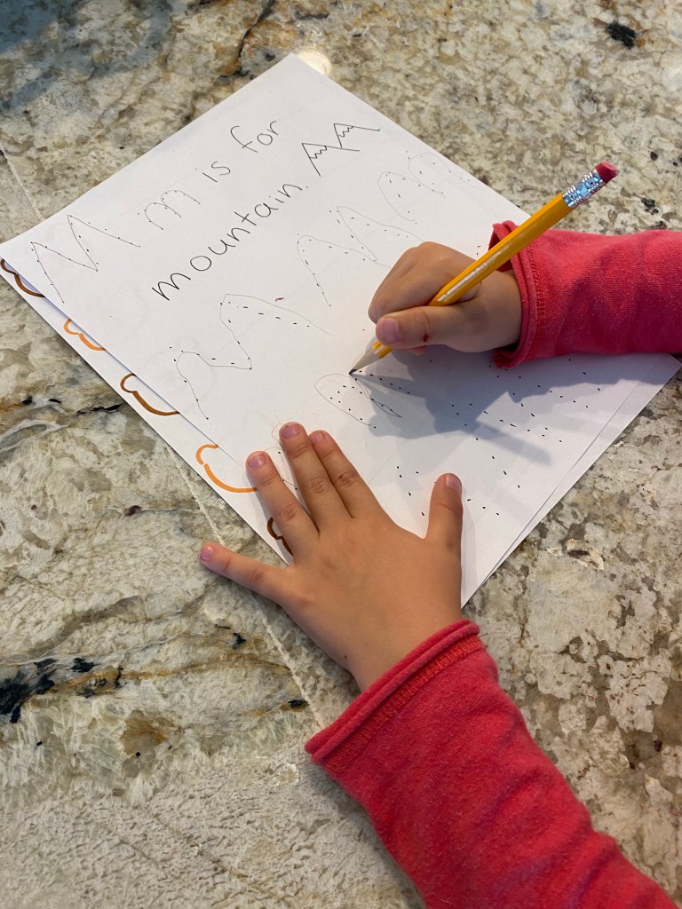-M is for Mountain: I made this writing practice page by drawing Ms with dots. Then my little used a pencil to trace the letters!