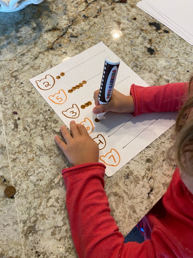 -Bear track counting practice: I drew some bear head silhouettes on a sheet of paper and put numbers in each one with a line next to them. Then I had my little identify the numbers and use a dotter to make “bear tracks” along the line that matched the number!