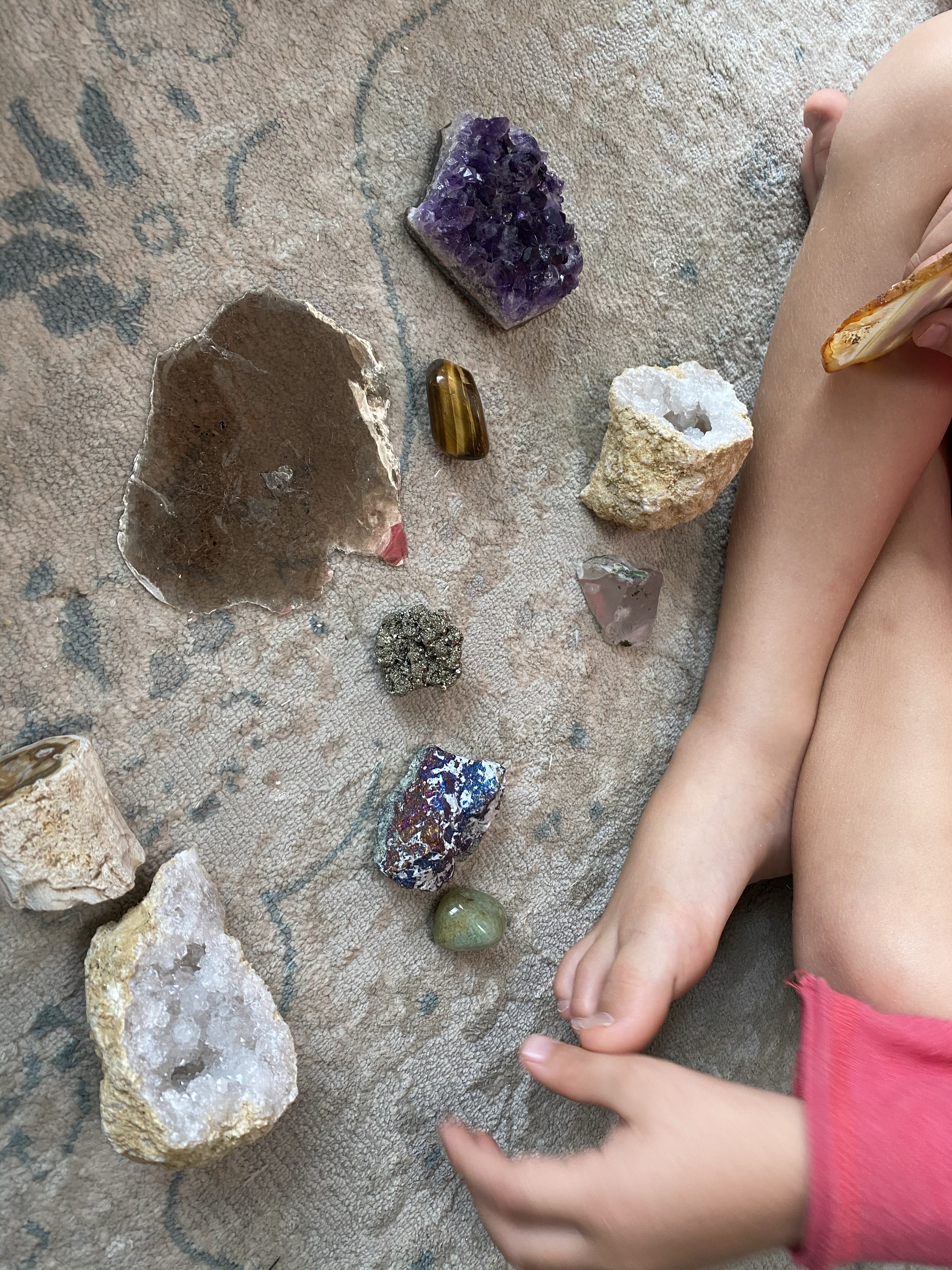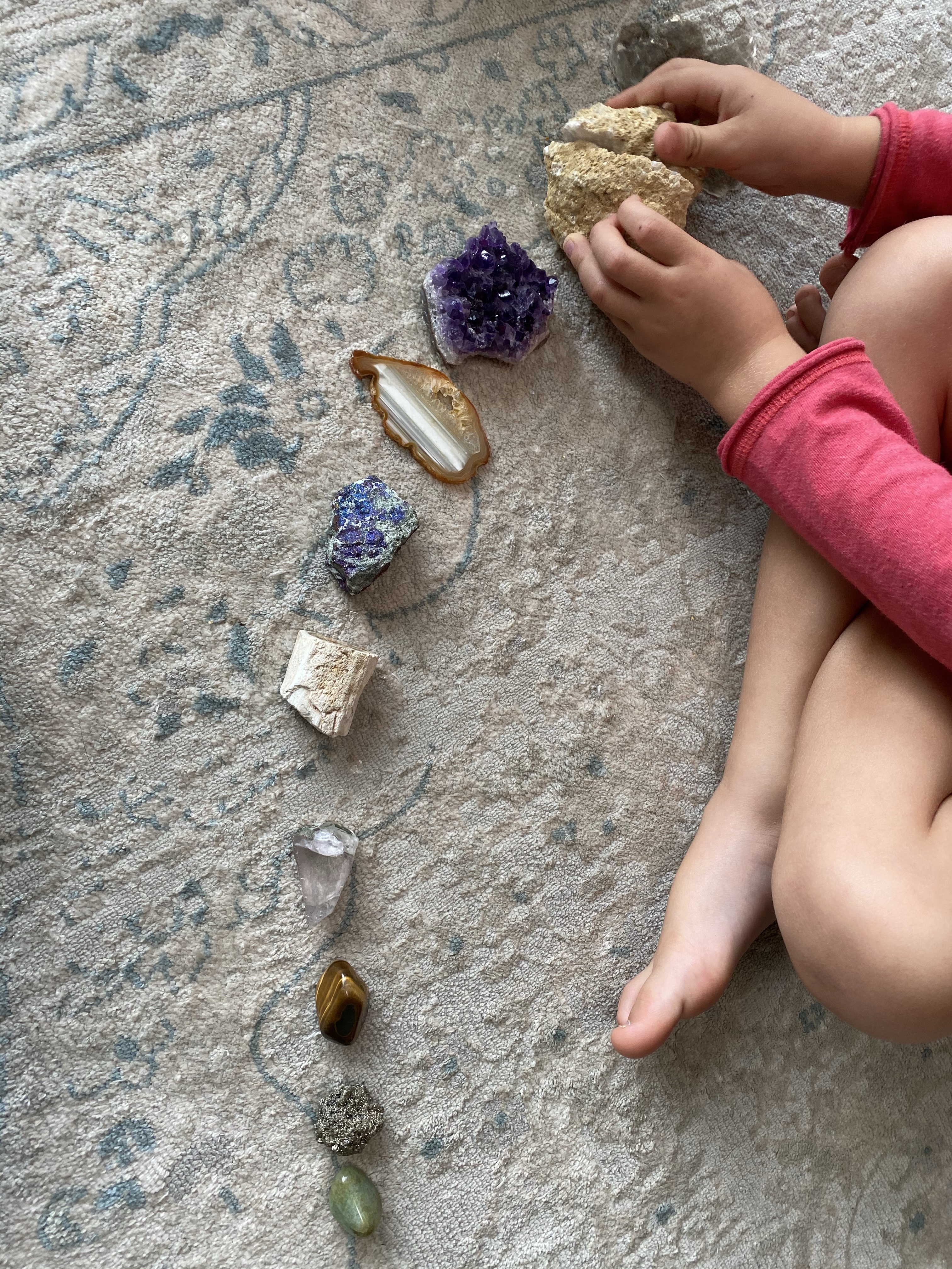 -Rock collection size sort: I busted out my rock collection and told the boys what each rock is called- the one in my hand below is my favorite! It’s called peacock ore and has unbelievably beautiful colors- it blows my mind that it’s found like that in nature! We used that as a springboard to talk about how awesome God is, creating all these beautiful rocks for us to admire! Then I had my little put them in order from smallest to largest. This could be done with rocks you find outside too!