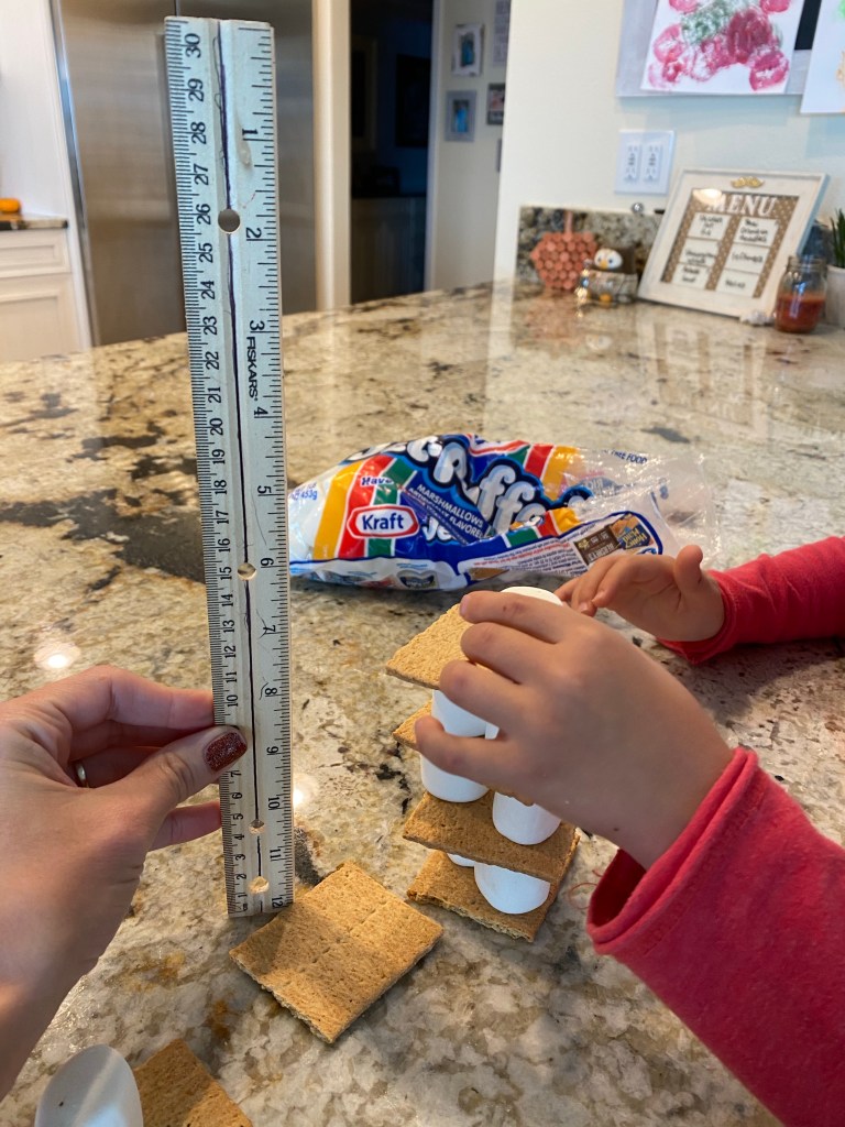 -STEM s’more towers: I gave my little the challenge “Build a tower out of graham crackers and marshmallows that is 6 inches tall”. Then I let him build (we discovered two marshmallows made each level sturdier than one- three probably would’ve been even better). I got this idea from Fun A Day!