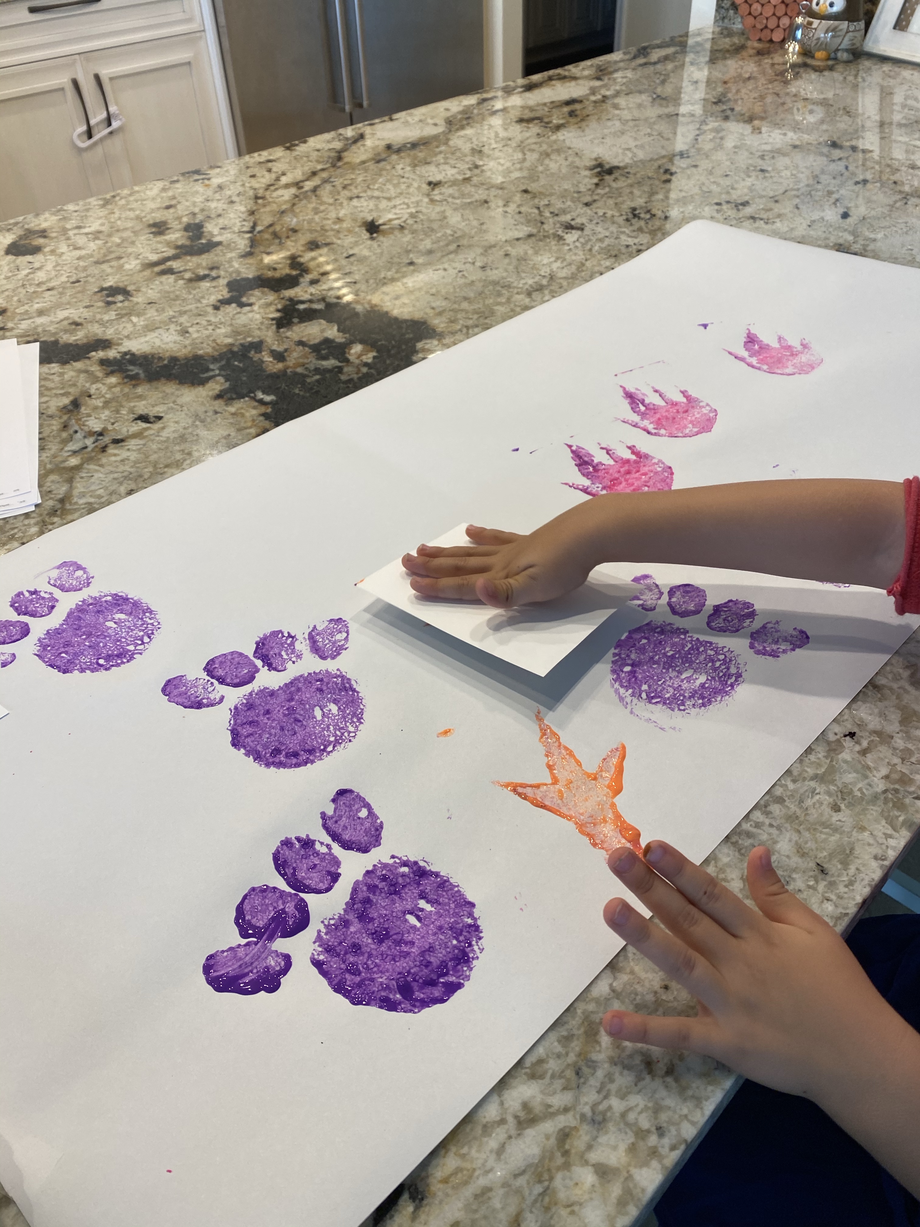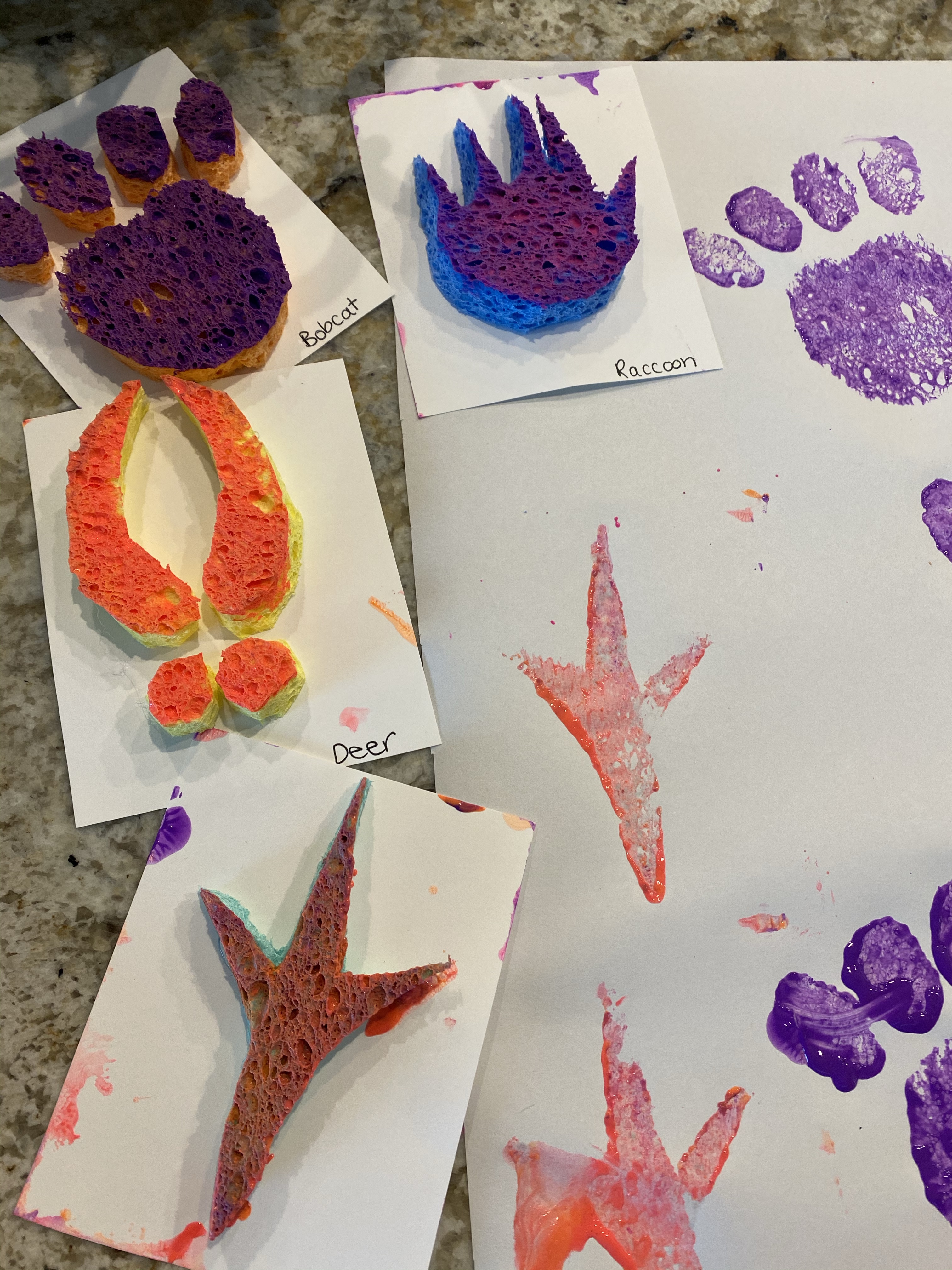 -DIY animal track stamps: I posted this on my toddler page too, but I think it’s more suited for prek since the stamps are pretty big and hard to manage- my toddler could do it, but he needed help! Anyway, you just make animal track stamps by cutting out their shapes from sponges and hot gluing them to pieces of card stock. We talked about which animal made each track, then I let the boys stamp away on our giant roll of easel paper!