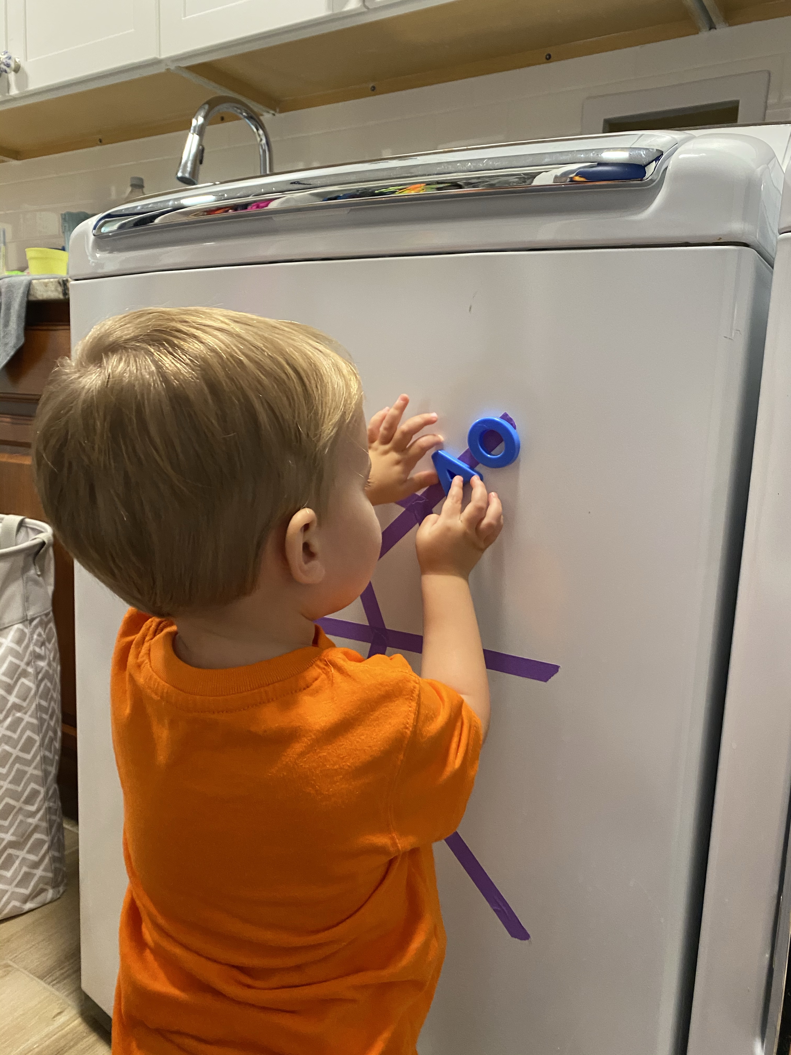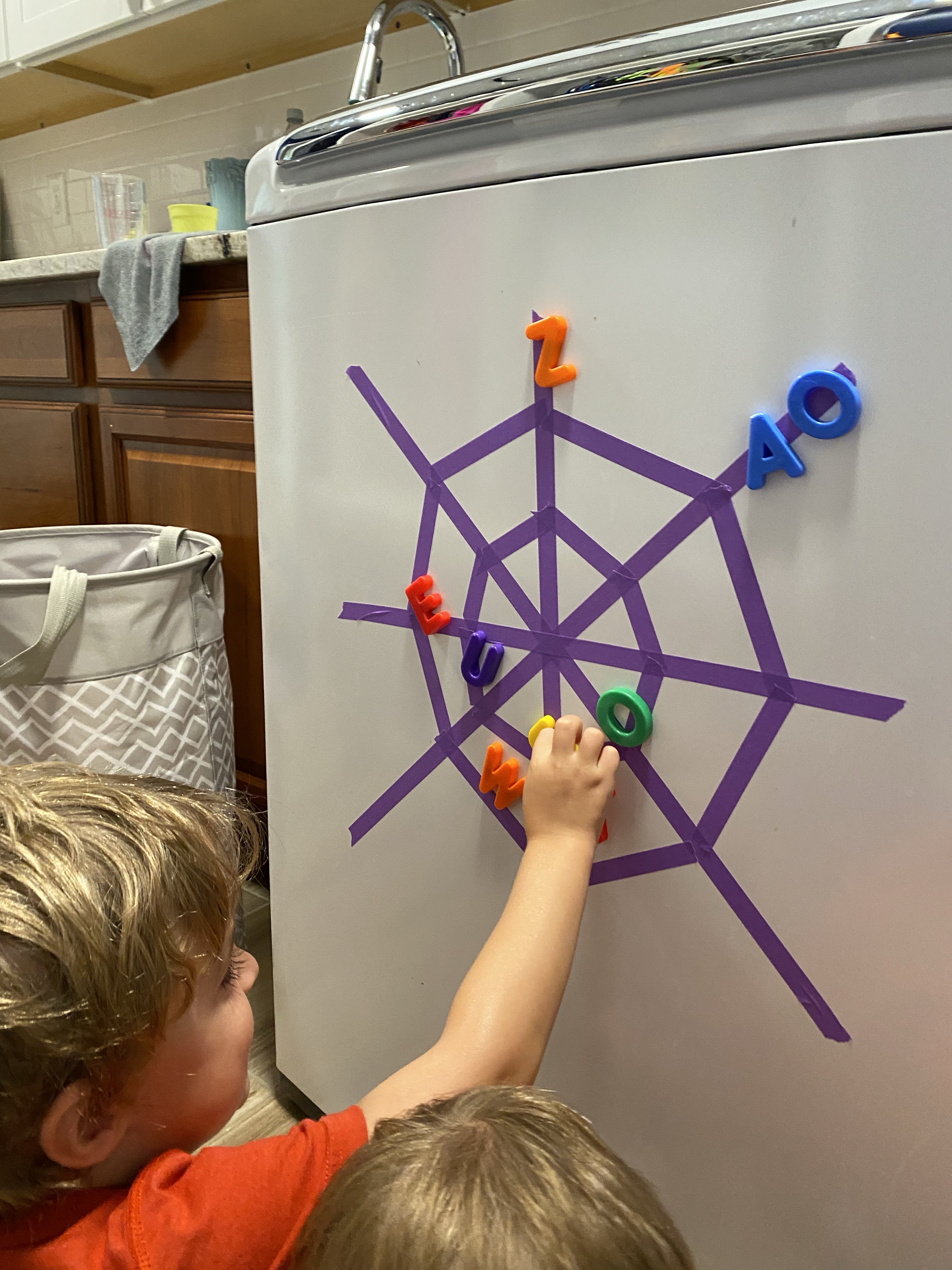 -Magnetic spider web letter practice: This was so much fun and both of my boys were totally into it! I made a spider web out of washi tape on our washing machine (our kitchen appliances aren’t magnetic- but if yours are, that would work too!) Then I had my little pretend our ABC magnets were flies getting caught in the web. I had him identify each letter as it got caught to work on letter recognition! I got this idea from the early literacy blog, Growing Book by Book!