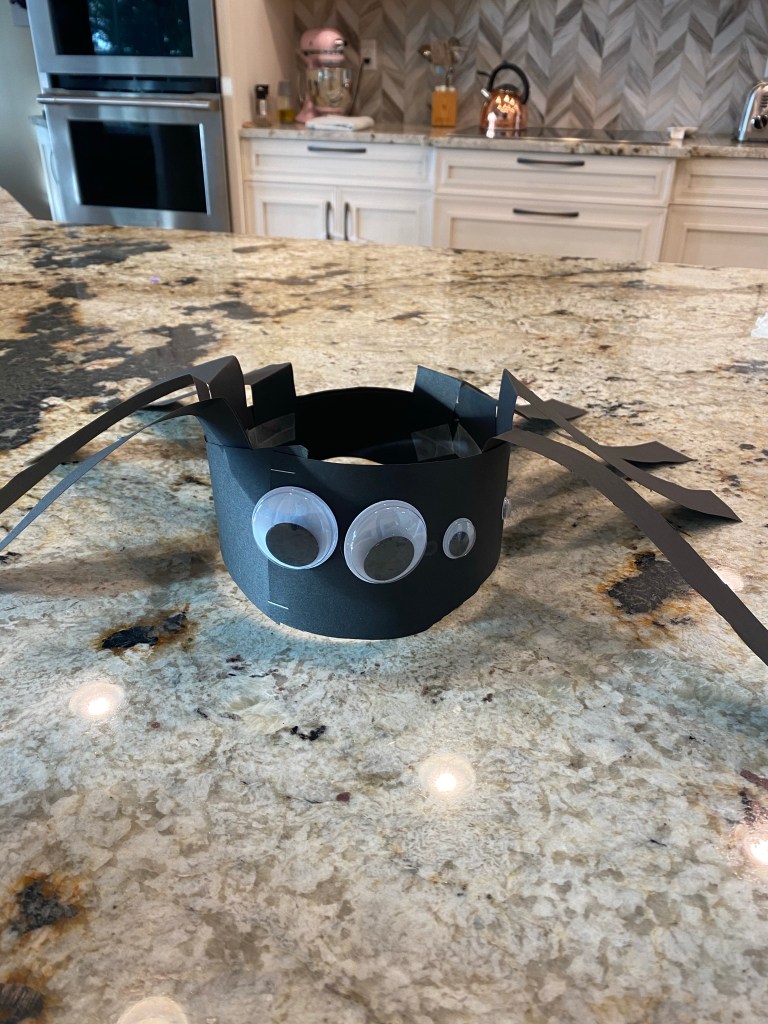 -Spider hat: I used to make these with my class during Halloween and they always come out so cute and funny! I drew some cutting lines on two sheets of black construction paper and had my little cut them out so that he had two strips for the head band, and 8 for the legs. I stapled the headband strips together, then he counted out and glued 8 googly eyes on it. When the eyes were dry, I stapled the headband in a circle to fit his head, then he taped on the legs and voila! Spider hat!