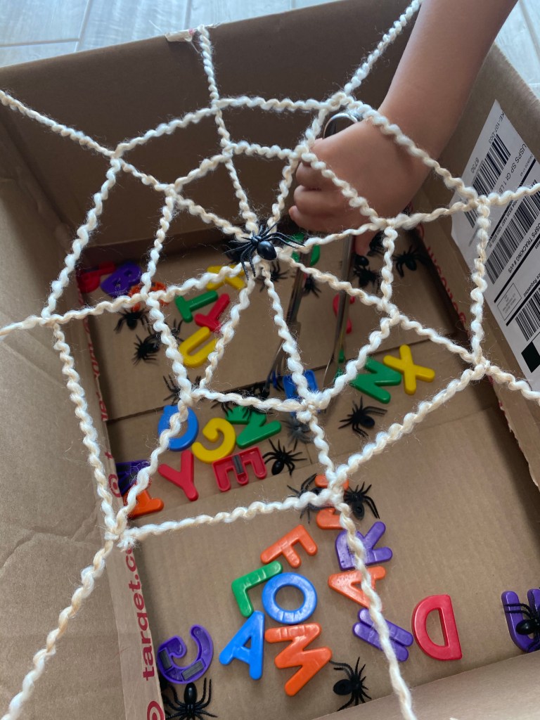-Spider letter hunt: I made a spider web by taping two overlapping Xs across the top of a box. Then I wove the circular part of the web by tying a piece of string to one of the base lines, and twirling the yarn around each base line as I went in a circle (if that makes sense!) Then I poured our magnet ABCs and plastic spiders in the box and had my little get the ABCs out with tongs (so the spiders wouldn’t bite him of course! hahaha). We identified each letter as he pulled it out. I got this idea from Pocket of Preschool!