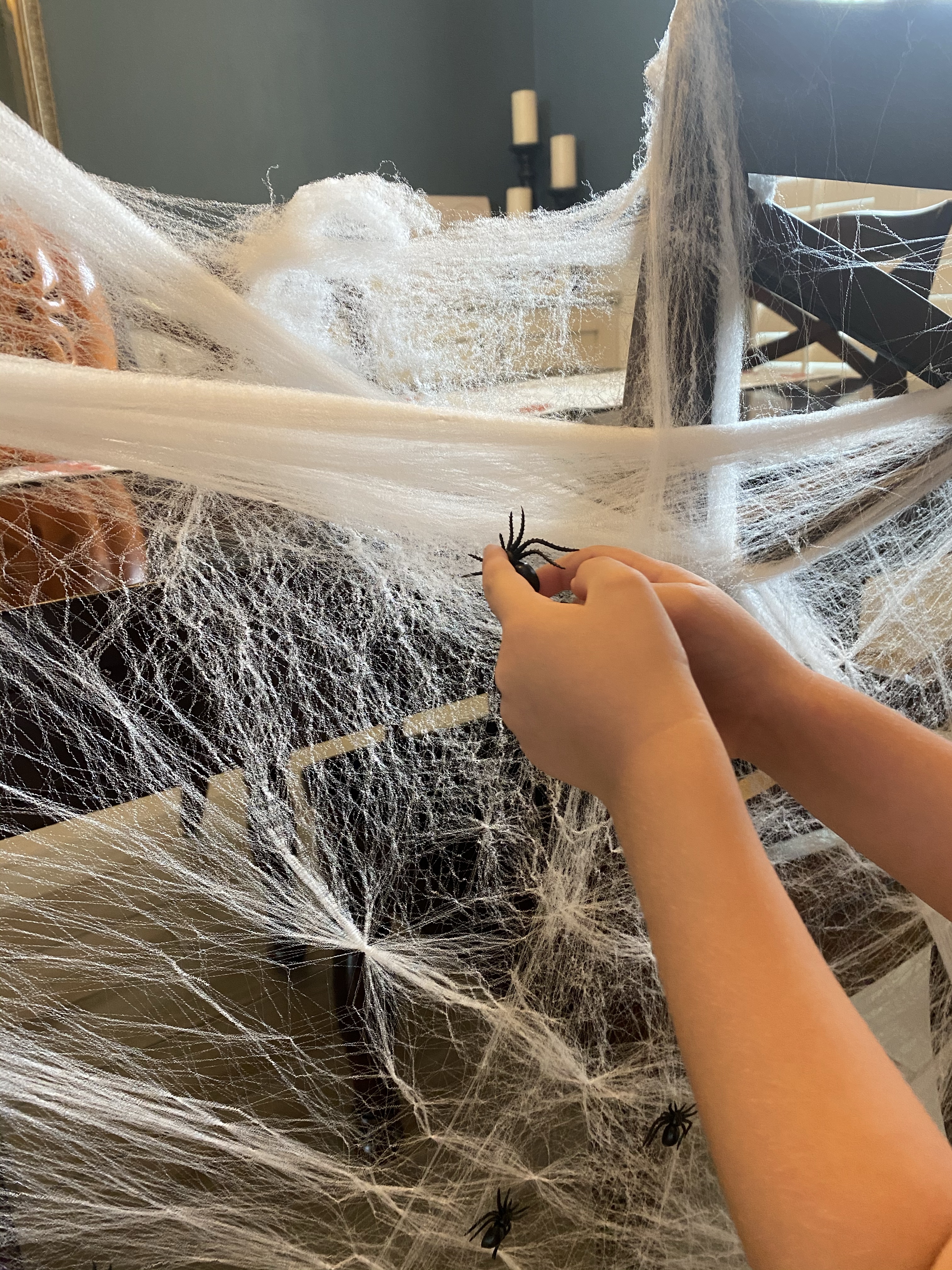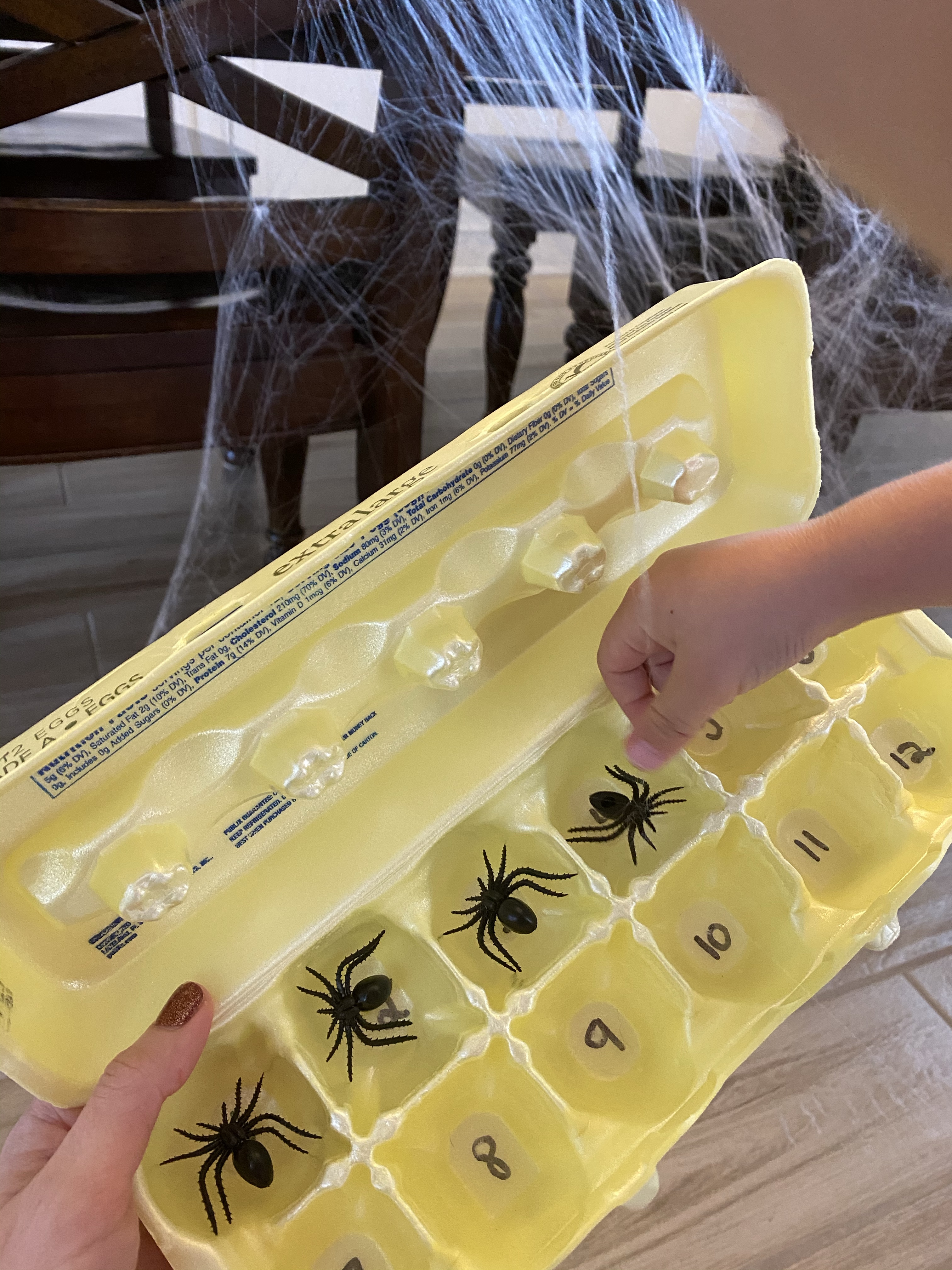 -Spider web counting: I strung up some fake spider web across our dining room chairs (which you can get pretty much anywhere for about $1.50 right now) and placed 12 spiders in it. Then I had my little remove and count the spiders by putting them in an egg crate (I MEAN spider cage!) that I had numbered 1-12. I got my inspiration from A Dab of Glue Will Do.