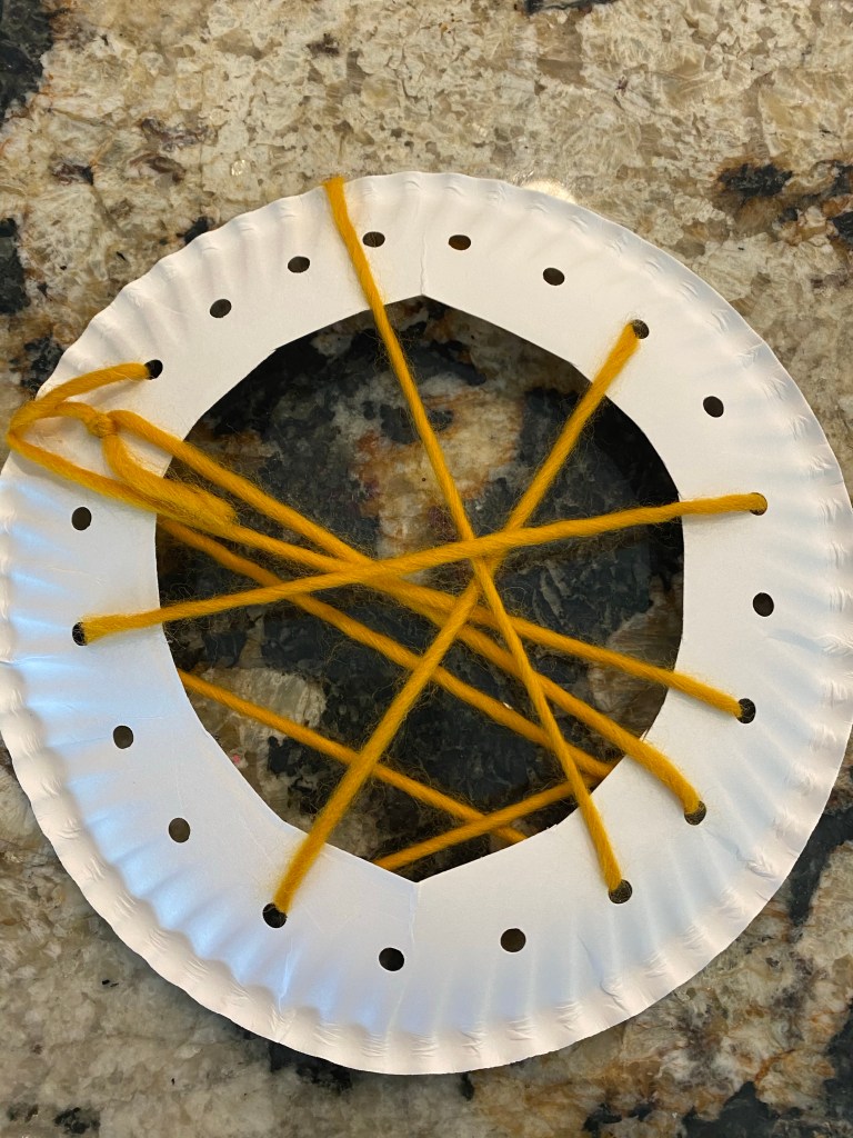 -Spider web plate threading: I cut a hole in the center of a paper plate then punched holes around the outside. I tied a long piece of yarn to one of the holes and taped the other end so it would be easier to thread. Then I had my little thread across the circle until the yarn was used up to make his own “web”! I got this idea from The Best Ideas for Kids!