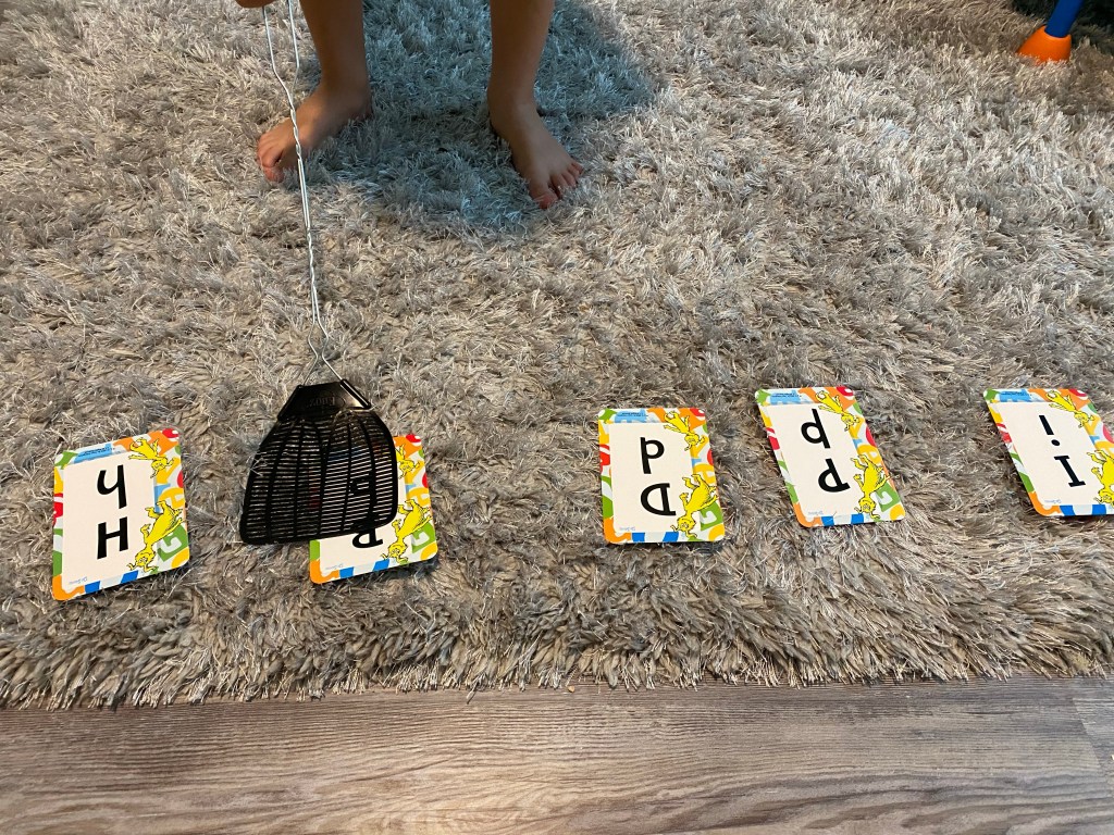 -Swat the spider letter practice: I placed 5 ABC flashcards on the floor, then called out a letter at a time and had my little hit it with a fly swatter, then replaced the letter with a new one until we ran out. LoL I got this idea from Mrs. Plemon’s Kindergarten! My little was aaaall about the fly swatter- I just had to watch my hands so I didn’t catch it!