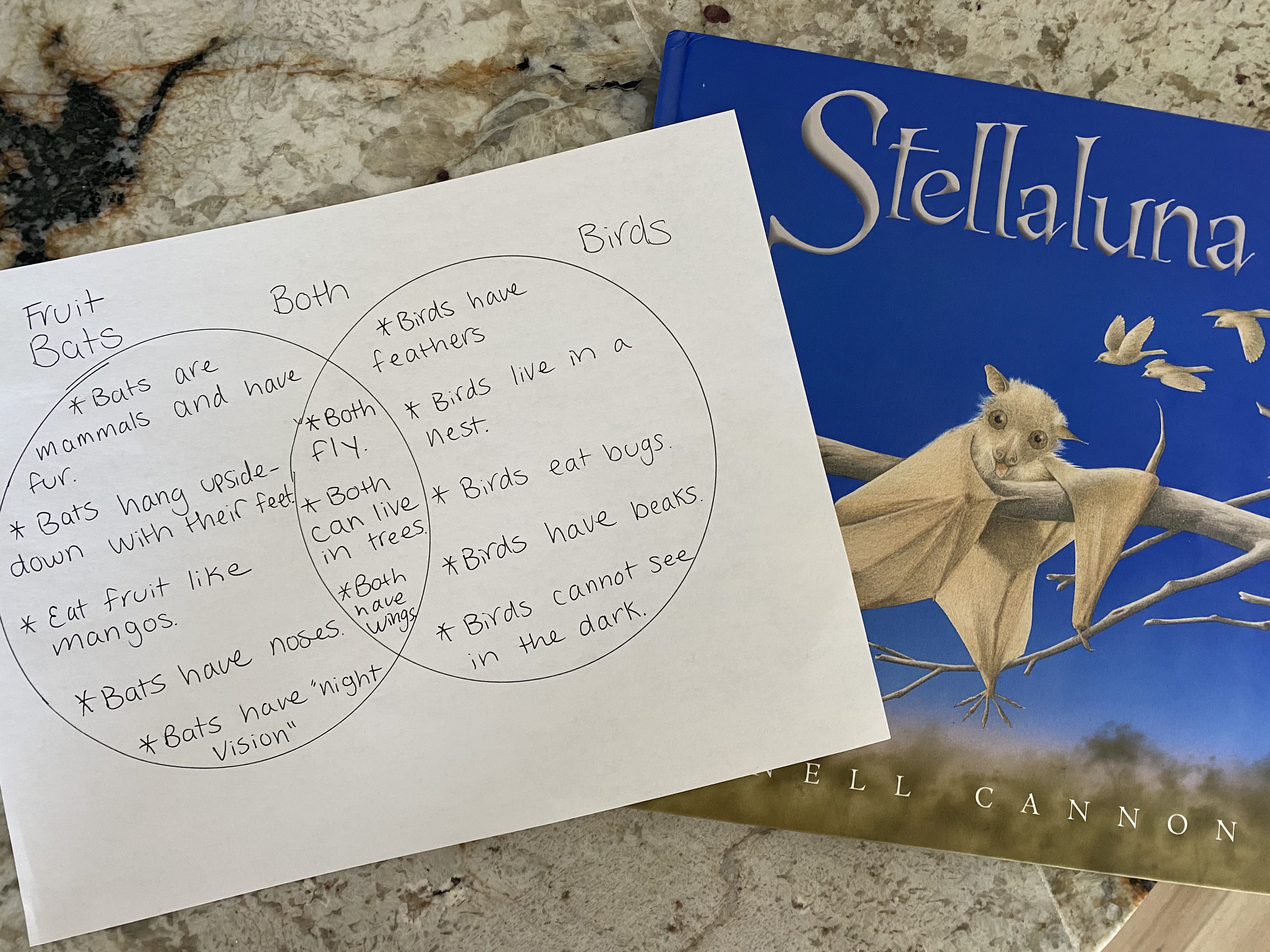 -“Stellaluna” compare and contrast: We read the classic kids’ book “Stellaluna” and then discussed how birds and bats are alike and different using the story as a guide. I wrote down my little’s thoughts on a Venn Diagram graphic organizer (ie. two overlapping circles- I just traced some kitchen bowls to make it, but you can print them free online too!)