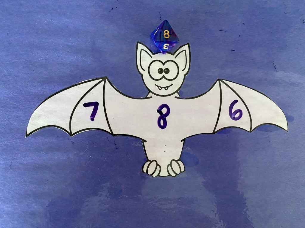 -Bat numbers, before and after: I printed out a cartoon bat then cut it out and laminated it on a sheet of blue paper (you could also print one and tuck it in a page protector). I had my little roll a dice to get the starting number, which he wrote in the center of the bat. Then I had him figure out what numbers come before and after it, and write them down on the wings. We practiced until he started to get the hang of it. I got the inspiration from Frogs and Fairies and added the dice part rather than printing out and laminating their 10 bats (which you could totally do if you want to sign up for their emails).