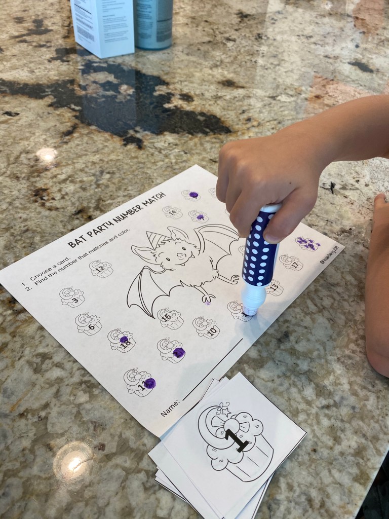 -Bat number matching game: I got this cute game for free on Teachers Pay Teachers! Just print and cut out the cards (or have your little cut them out- yay scissor skills!), shuffle them and lay them face down. Have your little draw a card at a time, then find and polka dot it (or color it) on the bat party page.