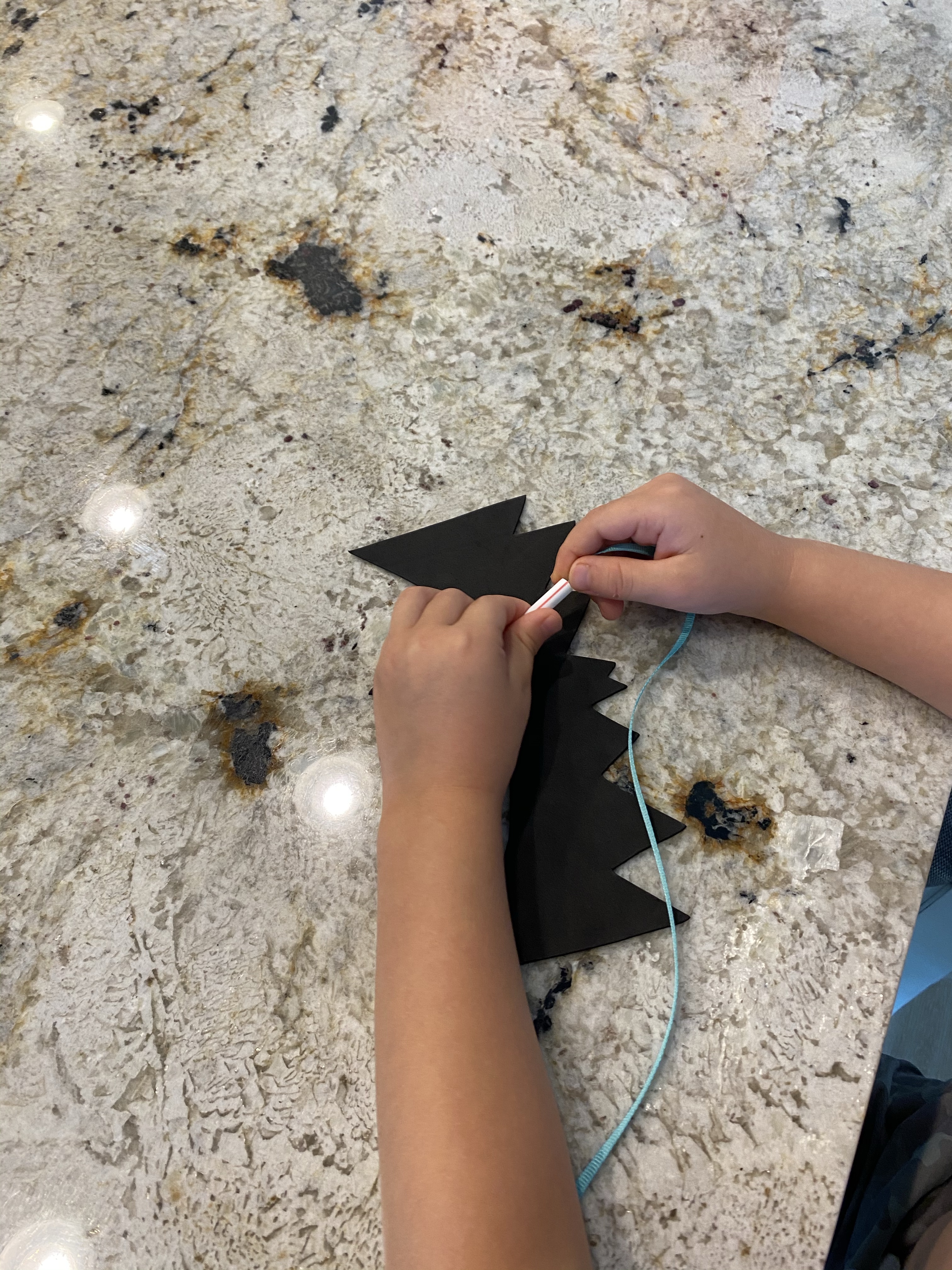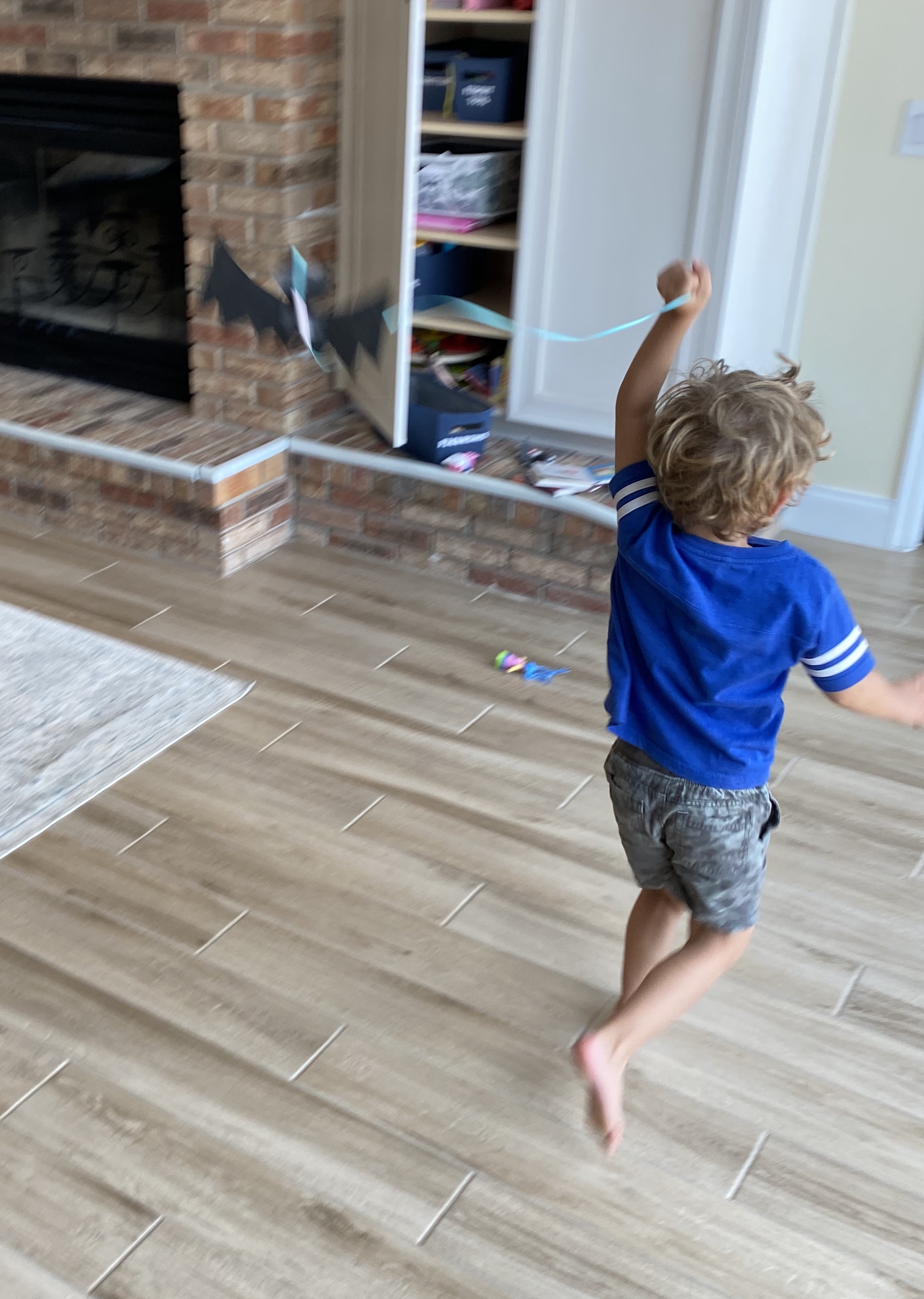 -STEM make a flying bat challenge: I gave my little a piece of string, a piece of a straw, a piece of tape and a craft foam bat I had cut out. I told him his challenge was to make the bat fly. Without my help, he basically made a bat kite that flew like a bat pretty accurately when he ran with it! The original project had you thread the string through the straw and move your hands up and down so the bat would “fly” across the string, but the thing with STEM is, there really is no right answer, right? I got the idea from The Educators’ Spin On It.